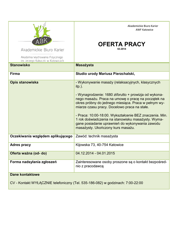 Akademickie Biuro Karier AWF Katowice OFERTA PRACY 63.2014 Stanowisko Masażysta Firma Studio urody Mariusz Pierzchalski, Opis stanowiska - Wykonywanie masaży (relaksacyjnych, klasycznych itp.). - Wynagrodzenie: 1680 zł/brutto + prowizja od wykonanego masażu. Praca na umowę o pracę na początek na okres próbny do jednego miesiąca. Praca w pełnym wymiarze czasu pracy. Docelowo praca na stałe. - Praca: 10:00-18:00. Wykształcenie BEZ znaczenia. Min. 1 rok doświadczenia na stanowisku masażysty. Wymagane posiadanie uprawnień do wykonywania zawodu masażysty. Ukończony kurs masażu. Oczekiwania względem aplikującego Zawód: technik masażysta Adres pracy Kijowska 73, 40-754 Katowice Oferta ważna (od- do) 04.12.2014 - 04.01.2015 Forma nadsyłania zgłoszeń Zainteresowane osoby proszone są o kontakt bezpośrednio z pracodawcą Dane kontaktowe CV - Kontakt WYŁĄCZNIE telefoniczny (Tel. 535-186-082) w godzinach: 7:00-22:00