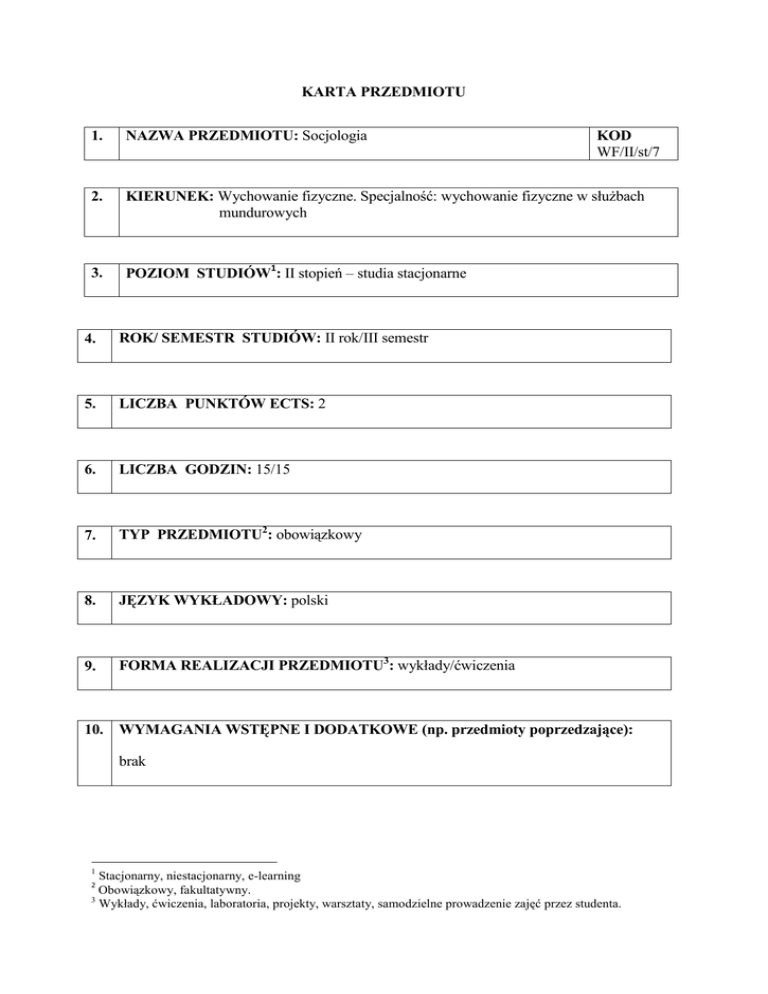 KARTA PRZEDMIOTU 1. NAZWA PRZEDMIOTU: Socjologia 2. KIERUNEK: Wychowanie fizyczne. Specjalność: wychowanie fizyczne w służbach mundurowych 3. POZIOM STUDIÓW1: II stopień – studia stacjonarne KOD WF/II/st/7 4. ROK/ SEMESTR STUDIÓW: II rok/III semestr 5. LICZBA PUNKTÓW ECTS: 2 6. LICZBA GODZIN: 15/15 7. TYP PRZEDMIOTU2: obowiązkowy 8. JĘZYK WYKŁADOWY: polski 9. FORMA REALIZACJI PRZEDMIOTU3: wykłady/ćwiczenia 10. WYMAGANIA WSTĘPNE I DODATKOWE (np. przedmioty poprzedzające): brak 1 Stacjonarny, niestacjonarny, e-learning Obowiązkowy, fakultatywny. 3 Wykłady, ćwiczenia, laboratoria, projekty, warsztaty, samodzielne prowadzenie zajęć przez studenta. 2 11. 12. CEL PRZEDMIOTU: przekazanie podstawowych wiadomości o pojęciach, problemach, teoriach i metodach badawczych socjologii; dostarczenie aparatu pojęciowego do analizy zmian społecznych, umożliwiających rozumienie mechanizmów wywołujących te zmiany oraz diagnozowanie ich kierunku; zapoznanie z tradycyjnymi i aktualnymi wątkami analizy sportu jako zjawiska społeczno kulturowego; kształtowanie interpretacji faktów społecznych związanych z kulturą fizyczną. Odniesienie do kierunkowych efektów kształcenia (symbol) Odniesienie do obszarowych efektów kształcenia i standardów kształcenia nauczycieli (symbol) P_W01. Odróżnia socjologiczną refleksję od K_W02 wiedzy potocznej o społeczeństwie. Student K_W03 posiada K_W06 M2_W03 M2_W04 M2_W06 M2_W07 M2_W08 M2_W09 M2_W10 PRZEDMIOTOWE EFEKTY KSZTAŁCENIA4 wiedzę na temat rozmaitych historycznych i współczesnych społecznych kontekstów sportu, jak również na temat rozmaitych odniesieniu perspektyw do tej socjologicznych problematyki. w Zna podstawowe pojęcia socjologii ogólnej np.: socjalizacja, grupa społeczna, więź społeczna, kultura, organizacja, kontrola społeczna, struktura społeczna, konflikt. Zna podstawowe metody badań stosowane w socjologii. P_W02. Zna wzory socjokulturowe cielesności i K_W06 sprawności fizycznej. Rozumie znaczenie norm K_W13 moralnych w sporcie. Zna czynniki społeczne M2_W04 M2_W06 M2_W10 M2_W12 wpływające na aktywność fizyczną i konsumpcję sportową. Rozumie znaczenie mediów i edukacji w funkcjonowaniu replikowaniu systemu społecznego. Orientuje się z czego wynika 4 Efekty kształcenia w zakresie wiedzy (P_W), umiejętności (P_U) i kompetencji społecznych (P_K). potrzeba instytucjonalizacji i profesjonalizacji współczesnego sportu. Zna aspekty kulturowe i społeczne turystyki. Zna uwarunkowania K_W04 M2_W04 P_U01. Samodzielnie interpretuje fakty społeczne K_U09 związane z kultura fizyczną. Potrafi analizować i K_U10 M2_U02 M2_U03 M2_U06 M2_U07 M2_U08 M2_U10 M2_U13 P_W03. społeczne zachowań zdrowotnych. krytycznie oceniać dane dotyczące uczestnictwa w kulturze fizycznej. Potrafi przeanalizować rozmaite zjawiska społeczne związane ze sportem np. komercjalizacji, instytucjonalizacji. globalizacji, tworzyć Potrafi kwestionariuszy ankiet i wywiadów w oparciu o poznane metody wykorzystywane w badaniach społecznych. P_K01. Ma świadomość ciągłego rozwoju K_K01 swojej wiedzy, K_K11 rozumie konieczność M2_K01 M2_K02 M2_K08 wychodzenia poza potoczne myślenie o życiu społecznym. rozważania Podejmuje samodzielne dotyczące rzeczywistości społecznej w oparciu o poznawane elementy socjologicznej wiedzy naukowej, a także próbę krytycznego spojrzenia na samą wiedzę socjologiczną jako na jedną z możliwych struktur wyjaśniania świata społecznego. P_K02. Potrafi przekonująco przedstawić swoje K_K06 argumenty, K_K08 różnych formułować aspektów opinie działalności dotyczące zawodowej. Nawiązuje poprawne relacje miedzy różnymi podmiotami życia społecznego obejmującego: rodzinę, publiczne. szkołę, zakład pracy, instytucje M2_K05 M2_K06 M2_K07 M2_K08 13. METODY OCENY EFEKTÓW KSZTAŁCENIA Metody (sposoby) oceny5 Typ oceny6 Forma dokumentacji końcowe zaliczenie pisemne podsumowująca praca pisemna ocenianie ciągłe formująca końcowe zaliczenie pisemne podsumowująca ocenianie ciągłe formująca końcowe zaliczenie pisemne podsumowująca ocenianie ciągłe formująca P_U01 końcowe zaliczenie pisemne ocenianie ciągłe formująca praca pisemna P_K01 końcowe zaliczenie pisemne podsumowująca praca pisemna ocenianie ciągłe formująca końcowe zaliczenie pisemne podsumowująca ocenianie ciągłe formująca Symbol przedmiotowego efektu kształcenia P_W01 P_W02 P_W03 P_ K02 praca pisemna praca pisemna praca pisemna 14. TREŚCI PROGRAMOWE Treść zajęć 5 Forma zajęć7 (liczba godz.) Symbol przedmiotowych efektów kształcenia P_W01, P_K01 1. Wprowadzenie do socjologii. wykład (1) 2. Badania społeczne w praktyce. wykład (1) P_W01, P_K01 3. Kultura i jej rola w życiu społecznym. wykład (1) P_W01, P_K01 4. Zmiana społeczno-kulturowa. wykład (1) P_W01, P_K01 Ocenianie ciągłe (bieżące przygotowanie do zajęć), śródsemestralne zaliczenie pisemne, śródsemestralne zaliczenie ustne, końcowe zaliczenia pisemne, końcowe zaliczenia ustne, egzamin pisemny, egzamin ustny, praca semestralna, ocena umiejętności ruchowych, praca dyplomowa, projekt, kontrola obecności 6 Formująca, podsumowująca. 7 Wykłady, ćwiczenia, laboratoria, samodzielne prowadzenie zajęć przez studenta. 5. Jednostka i społeczeństwo. wykład (1) P_W01, P_K01 6. Kontrola społeczna. wykład (1) P_W01, P_W02 P_K01 7. Grupy społeczne i zbiorowości. wykład (1) P_W01, P_K01 8. Naród, mniejszość etniczna i narodowa, państwo. wykład (1) P_W01, P_K01 9. Struktura społeczna. wykład (1) P_W01, P_K01 10. Rodzina jako przedmiot zainteresowania socjologii. wykład (1) P_W01, P_K01 11. Organizacje i instytucje społeczne. wykład (1) P_W01, P_K01 12. Rządzenie i polityka. wykład (1) P_W01, P_K01 13. Procesy społeczne - analiza wybranych przykładów. wykład (2) P_W01, P_K01 14. Socjologiczne aspekty edukacji. wykład (1) P_W01, P_W02 P_K01 1. Zapoznanie studenta z celami, efektami