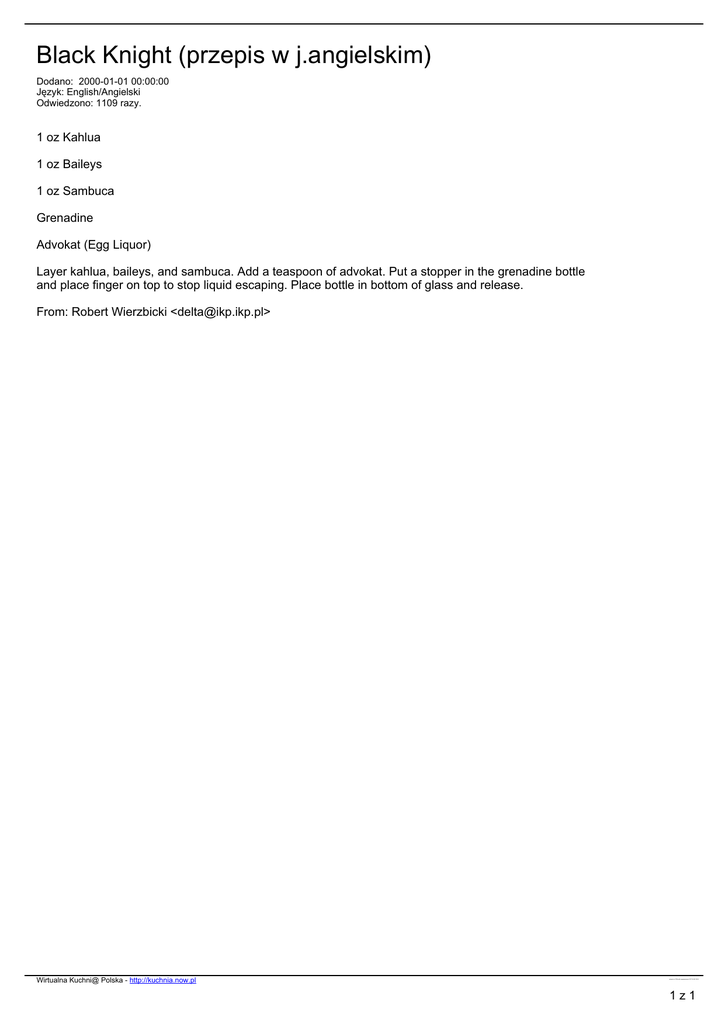 Black Knight (przepis w j.angielskim) Dodano: 2000-01-01 00:00:00 Język: English/Angielski Odwiedzono: 1109 razy. 1 oz Kahlua 1 oz Baileys 1 oz Sambuca Grenadine Advokat (Egg Liquor) Layer kahlua, baileys, and sambuca. Add a teaspoon of advokat. Put a stopper in the grenadine bottle and place finger on top to stop liquid escaping. Place bottle in bottom of glass and release. From: Robert Wierzbicki <[email protected]> Wirtualna Kuchni@ Polska - http://kuchnia.now.pl przepis nr 3736, plik wygenerowano 2017.03.08 19:03 1z1