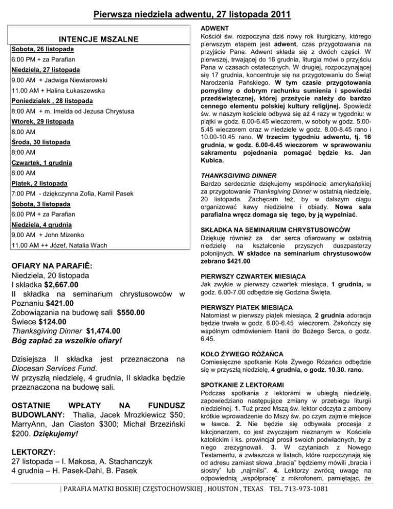 Pierwsza niedziela adwentu, 27 listopada 2011 INTENCJE MSZALNE Sobota, 26 listopada 6:00 PM + za Parafian Niedziela, 27 listopada 9.00 AM + Jadwiga Niewiarowski 11.00 AM + Halina Łukaszewska Poniedziałek , 28 listopada 8:00 AM + m. Imelda od Jezusa Chrystusa Wtorek, 29 listopada 8:00 AM Środa, 30 listopada 8:00 AM Czwartek, 1 grudnia 8:00 AM Piątek, 2 listopada 7:00 PM - dziękczynna Zofia, Kamil Pasek Sobota, 3 listopada 6:00 PM + za Parafian Niedziela, 4 grudnia 9.00 AM + John Mizenko 11.00 AM ++ Józef, Natalia Wach OFIARY NA PARAFIÊ: Niedziela, 20 listopada I składka $2,667.00 II składka na seminarium chrystusowców w Poznaniu $421.00 Zobowiązania na budowę sali $550.00 Świece $124.00 Thanksgiving Dinner $1,474.00 Bóg zapłać za wszelkie ofiary! Dzisiejsza II składka jest przeznaczona na Diocesan Services Fund. W przyszłą niedzielę, 4 grudnia, II składka będzie przeznaczona na budowę sali. OSTATNIE WPŁATY NA FUNDUSZ BUDOWLANY: Thalia, Jacek Mrozkiewicz $50; MarryAnn, Jan Ciaston $300; Michał Brzeziński $200. Dziękujemy! LEKTORZY: 27 listopada – I. Makosa, A. Stachanczyk 4 grudnia – H. Pasek-Dahl, B. Pasek ADWENT Kościół św. rozpoczyna dziś nowy rok liturgiczny, którego pierwszym etapem jest adwent, czas przygotowania na przyjście Pana. Adwent składa się z dwóch części. W pierwszej, trwającej do 16 grudnia, liturgia mówi o przyjściu Pana w czasach ostatecznych. W drugiej, rozpoczynającej się 17 grudnia, koncentruje się na przygotowaniu do Świąt Narodzenia Pańskiego. W tym czasie przygotowania pomyślmy o dobrym rachunku sumienia i spowiedzi przedświątecznej, której przeżycie należy do bardzo cennego elementu polskiej kultury religijnej. Spowiedź św. w naszym kościele odbywa się aż 4 razy w tygodniu: w piątki w godz. 6.00-6.45 wieczorem, w soboty w godz. 5.005.45 wieczorem oraz w niedziele w godz. 8.00-8.45 rano i 10.00-10.45 rano. W trzecim tygodniu adwentu, tj. 16 grudnia, w godz. 6.00-6.45 wieczorem w sprawowaniu sakramentu pojednania pomagać będzie ks. Jan Kubica. THANKSGIVING DINNER Bardzo serdecznie dziękujemy wspólnocie amerykańskiej za przygotowanie Thanksgiving Dinner w ostatnią niedzielę, 20 listopada. Zachęcam też, by w dalszym ciągu organizować kawy niedzielne i obiady. Nowa sala parafialna wręcz domaga się tego, by ją wypełniać. SKŁADKA NA SEMINARIUM CHRYSTUSOWCÓW Dziękuję również za dar serca ofiarowany w ostatnią niedzielę na kształcenie przyszych duszpasterzy polonijnych. W składce na seminarium chrystusowców zebrano $421.00 PIERWSZY CZWARTEK MIESIĄCA Jak zwykle w pierwszy czwartek miesiąca, 1 grudnia, w godz. 6.00-7.00 odbędzie się Godzina Święta. PIERWSZY PIATEK MIESIĄCA Natomiast w pierwszy piątek miesiąca, 2 grudnia adoracja będzie trwała w godz. 6.00-6.45 wieczorem. Zakończy się wspólnym odmówieniem litanii do Bożego Serca, o godz. 6.45. KOŁO ŻYWEGO RÓŻAŃCA Comiesięczne spotkanie Koła Żywego Rózańca odbędzie się w przyszłą niedzielę, 4 grudnia, o godz. 10.30. rano. SPOTKANIE Z LEKTORAMI Podczas spotkania z lektorami w ubiegłą niedzielę, zapowiedziano następujące zmiany w przebiegu liturgii niedzielnej. 1. Tuż przed Mszą św. lektor odczyta z ambony krótkie wprowadzenie do Mszy św. po czym zajmie miejsce w ławce. 2. Nie będzie się odbywała procesja z lekcjonarzem, co jest zwyczajem nieznanym w Kościele katolickim i ks. prowincjał prosił swoich podwładnych, by z niego zrezygnowali. 3. W czytaniach z Nowego Testamentu, a zwłaszcza w listach, które rozpoczynają się od adresu zamiast słowa „bracia” będziemy mówili „bracia i siostry” lub „najmilsi”. 4. Lektorzy zwrócą uwagę na odpowiednią „współpracę” z mikrofonem, pamiętając, że | PARAFIA MATKI BOSKIEJ CZĘSTOCHOWSKIEJ , HOUSTON , TEXAS TEL. 713-973-1081 Pierwsza niedziela adwentu, 27 listopada 2011 czytane przez nich Słowo Boże musi dotrzeć do każdego uczestnika niedzielnej Mszy św. MODLITWA ZA ZMARŁYCH Dzisiaj zakończyła się nasza listopadowa modlitwa za zmarłych. Po dzisiejszej Mszy św. bardzo proszę zabrać do domu portrety swoich zmarłych. POŚWIĘCENIE SZKOŁY Polska Szkoła Sobotnia, zaprasza Wszystkich Parafian na uroczystość poświęcenia nowej szkoły. Uroczystość odbędzie się w przyszłą niedzielę, 4 grudnia, po Mszy św. Gorąco zachęcamy Parafian do składania dalszych ofiar na niezbędne wyposażenie budynku szkoły. Na zakup tablic i stołów dla nauczycieli potrzebujemy około $4,500. W tej sprawie proszę kontaktować z Panią Hanną Tomaszkiewicz (281) 725.7337. NOWY MSZAŁ RZYMSKI DLA DIECEZJI AMERYKAŃSKICH Wspólnoty Kościoła w Stanach Zjednczonych i w kilku regionach świata rozpoczynają dziś używanie nowego Mszału Rzymskiego, który jest wiernym tłumaczeniem trzeciej edycji typicznej. Otoczmy ich naszą modlitwą, by ta trudna zmiana przyczyniła się do rozwoju wiary katolików amerykańskich. ZABAWA SYLWESTROWA Rada Parafialna jak co roku organizuje zabawę sylwestrową, która odbędzie się w nowej sali parafialnej. Dziś jest ostatnia okazja do zakupu biletu w promocyjnej cenie: dorośli $110, młodzież niepracująca $70. W grudniu ceny te zostaną podniesione o $10. W sprawie nabycia biletów należy telefonować pod nr (281) 440.7995 (Róża Ekimov) lub (832) 630.2858 (Ewa Dumana). PODZIĘKOWANIE DLA RYCERZY KOLUMBA Rycerzom Kolumba dziękujemy za sfinansowanie zakupu wózka do fortepianu w wysokości $559.80. RADA PARAFIALNA Zbliża się grudniowe posiedzenie Rady Parafialnej. Posiedzenie zaplanowano na 6 grudnia, na godz. 7.00 wieczorem. PRÓBY CHÓRU Pani Teresa Puchała wznawia próby chóru, które odbywają sie po niedzielnej Mszy św. Zapraszamy Panie i Panów, z talentem wokalnym, by przyczynili się do upiększenia naszej liturgii! WYCIECZKI DLA SENIORÓW PNA organizuje dwie kolejne wycieczki dla seniorów. 30 listopada, do Schulenburg, wyjazd godz. 8.45 rano sprzed kościoła i 17 grudni