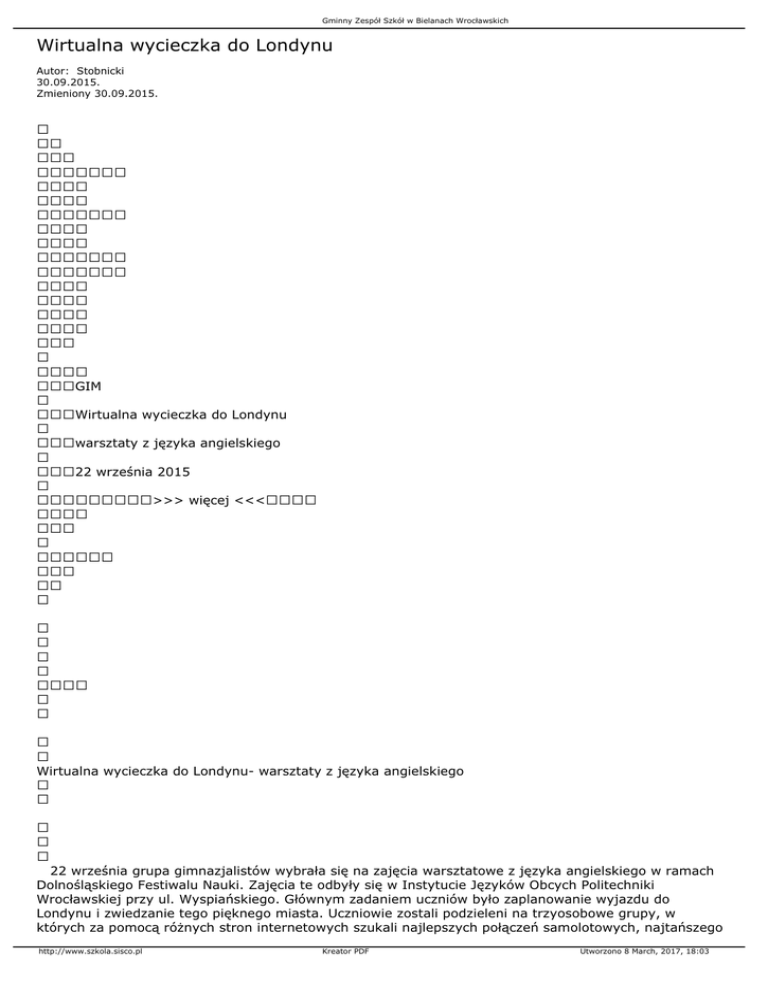 Gminny Zespół Szkół w Bielanach Wrocławskich Wirtualna wycieczka do Londynu Autor: Stobnicki 30.09.2015. Zmieniony 30.09.2015. GIM Wirtualna wycieczka do Londynu warsztaty z języka angielskiego 22 września 2015 >>> więcej <<< Wirtualna wycieczka do Londynu- warsztaty z języka angielskiego 22 września grupa gimnazjalistów wybrała się na zajęcia warsztatowe z języka angielskiego w ramach Dolnośląskiego Festiwalu Nauki. Zajęcia te odbyły się w Instytucie Języków Obcych Politechniki Wrocławskiej przy ul. Wyspiańskiego. Głównym zadaniem uczniów było zaplanowanie wyjazdu do Londynu i zwiedzanie tego pięknego miasta. Uczniowie zostali podzieleni na trzyosobowe grupy, w których za pomocą różnych stron internetowych szukali najlepszych połączeń samolotowych, najtańszego http://www.szkola.sisco.pl Kreator PDF Utworzono 8 March, 2017, 18:03 Gminny Zespół Szkół w Bielanach Wrocławskich zakwaterowania czy cen biletów wstępu do londyńskich atrakcji. Jak się okazało warto dokładnie śledzić internetowe strony w poszukiwaniu cenowych okazji. Najdroższe bilety na przelot z Wrocławia do Londynu kosztowały 1000 złoty, a najtańsze 117. Gratulujemy uczniom klas II, tj. Kacprowie Findlikowi, Martynie Policie oraz Julii Bronsztejn. Zaplanowali oni nie tylko ciekawą, ale również tanią wycieczkę. Agnieszka Polańska http://www.szkola.sisco.pl Kreator PDF Utworzono 8 March, 2017, 18:03