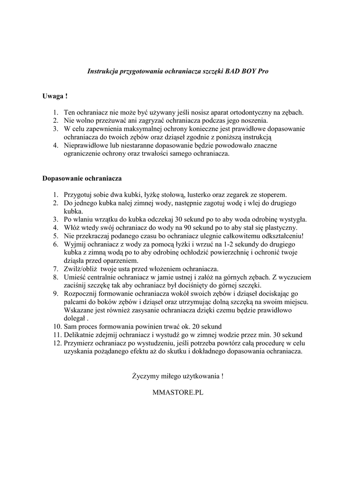 Instrukcja przygotowania ochraniacza szczęki BAD BOY Pro Uwaga ! 1. Ten ochraniacz nie może być używany jeśli nosisz aparat ortodontyczny na zębach. 2. Nie wolno przeżuwać ani zagryzać ochraniacza podczas jego noszenia. 3. W celu zapewnienia maksymalnej ochrony konieczne jest prawidłowe dopasowanie ochraniacza do twoich zębów oraz dziąseł zgodnie z poniższą instrukcją 4. Nieprawidłowe lub niestaranne dopasowanie będzie powodowało znaczne ograniczenie ochrony oraz trwałości samego ochraniacza. Dopasowanie ochraniacza 1. Przygotuj sobie dwa kubki, łyżkę stołową, lusterko oraz zegarek ze stoperem. 2. Do jednego kubka nalej zimnej wody, następnie zagotuj wodę i wlej do drugiego kubka. 3. Po wlaniu wrzątku do kubka odczekaj 30 sekund po to aby woda odrobinę wystygła. 4. Włóż wtedy swój ochraniacz do wody na 90 sekund po to aby stał się plastyczny. 5. Nie przekraczaj podanego czasu bo ochraniacz ulegnie całkowitemu odkształceniu! 6. Wyjmij ochraniacz z wody za pomocą łyżki i wrzuć na 1-2 sekundy do drugiego kubka z zimną wodą po to aby odrobinę ochłodzić powierzchnię i ochronić twoje dziąsła przed oparzeniem. 7. Zwilż/obliż twoje usta przed włożeniem ochraniacza. 8. Umieść centralnie ochraniacz w jamie ustnej i załóż na górnych zębach. Z wyczuciem zaciśnij szczękę tak aby ochraniacz był dociśnięty do górnej szczęki. 9. Rozpocznij formowanie ochraniacza wokół swoich zębów i dziąseł dociskając go palcami do boków zębów i dziąseł oraz utrzymując dolną szczęką na swoim miejscu. Wskazane jest również zasysanie ochraniacza dzięki czemu będzie prawidłowo dolegał . 10. Sam proces formowania powinien trwać ok. 20 sekund 11. Delikatnie zdejmij ochraniacz i wystudź go w zimnej wodzie przez min. 30 sekund 12. Przymierz ochraniacz po wystudzeniu, jeśli potrzeba powtórz całą procedurę w celu uzyskania pożądanego efektu aż do skutku i dokładnego dopasowania ochraniacza. Życzymy miłego użytkowania ! MMASTORE.PL