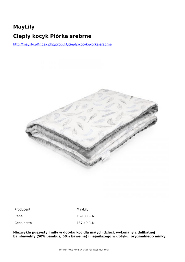MayLily Ciepły kocyk Piórka srebrne http://maylily.pl/index.php/produkt/cieply-kocyk-piorka-srebrne Producent MayLily Cena 169.00 PLN Cena netto 137.40 PLN Niezwykle puszysty i miły w dotyku koc dla małych dzieci, wykonany z delikatnej bambawełny (50% bambus, 50% bawełna) i najmilszego w dotyku, oryginalnego minky, TXT_PDF_PAGE_NUMBER 1 TXT_PDF_PAGE_OUT_OF 2 dodatkowo ocieplony antyalergicznym wypełnieniem. Jest idealny na spacery, może także zastąpić kołderkę do spania. Wraz z upływem czasu nie traci puszystości i miękkości W środku posiada wypełnienie najwyższej jakości, które grzeje i jednocześnie zapewnia znakomitą wentylację Posiada autorski, niepowtarzalny wzór Został zaprojektowany i starannie uszyty w Polsce z wykorzystaniem najwyższej jakości tkanin i dodatków Idealnie nadaje się na piękny i przydatny prezent Dlaczego kocyki MAYLILY są uwielbiane przez dzieci? · Miękki i puszysty kocyk otula malucha · Nasycone kolory oraz piękne wzory przyciągają wzrok i zachęcają do zabawy · Dzieci czują się bezpiecznie, mając obok siebie puszystego przyjaciela Wymiary: 100x75 cm Cechy produktu Skład 50% bambus, 50% bawełna, 100% poliester Wymiary 100x75 cm Czy można prać w pralce? 1 TXT_PDF_PAGE_NUMBER 2 TXT_PDF_PAGE_OUT_OF 2