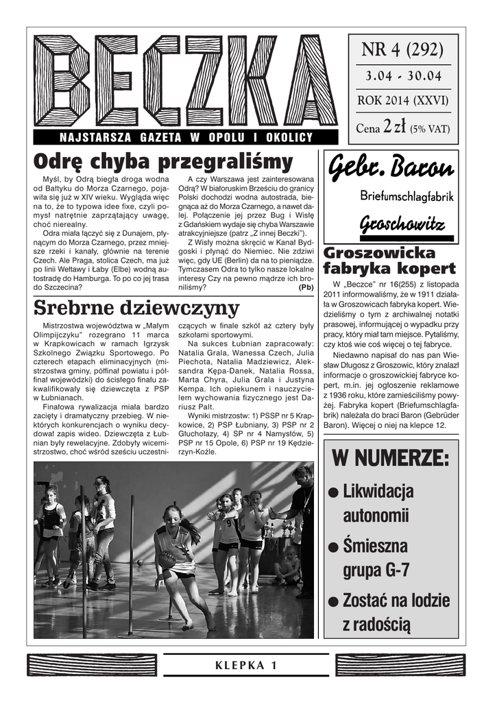NR 4 (292) 3.04 - 30.04 ROK 2014 (XXVI) N A J S TA R S Z A G A Z E TA W O P O L U I O K O L I C Y Cena 2z∏ (5% VAT) Odr´ chyba przegraliÊmy MyÊl, by Odrà bieg∏a droga wodna od Ba∏tyku do Morza Czarnego, pojawi∏a si´ ju˝ w XIV wieku. Wyglàda wi´c na to, ˝e to typowa idee fixe, czyli pomys∏ natr´tnie zaprzàtajàcy uwag´, choç nierealny. Odra mia∏a ∏àczyç si´ z Dunajem, p∏ynàcym do Morza Czarnego, przez mniejsze rzeki i kana∏y, g∏ównie na terenie Czech. Ale Praga, stolica Czech, ma ju˝ po linii We∏tawy i ¸aby (Elbe) wodnà autostrad´ do Hamburga. To po co jej trasa do Szczecina? A czy Warszawa jest zainteresowana Odrà? W bia∏oruskim BrzeÊciu do granicy Polski dochodzi wodna autostrada, biegnàca a˝ do Morza Czarnego, a nawet dalej. Po∏àczenie jej przez Bug i Wis∏´ z Gdaƒskiem wydaje si´ chyba Warszawie atrakcyjniejsze (patrz „Z innej Beczki”). Z Wis∏y mo˝na skr´ciç w Kana∏ Bydgoski i p∏ynàç do Niemiec. Nie zdziwi wi´c, gdy UE (Berlin) da na to pieniàdze. Tymczasem Odra to tylko nasze lokalne interesy Czy na pewno màdrze ich broniliÊmy? (Pb) Srebrne dziewczyny Mistrzostwa województwa w „Ma∏ym Olimpijczyku” rozegrano 11 marca w Krapkowicach w ramach Igrzysk Szkolnego Zwiàzku Sportowego. Po czterech etapach eliminacyjnych (mistrzostwa gminy, pó∏fina∏ powiatu i pó∏fina∏ wojewódzki) do Êcis∏ego fina∏u zakwalifikowa∏y si´ dziewcz´ta z PSP w ¸ubnianach. Fina∏owa rywalizacja mia∏a bardzo zaci´ty i dramatyczny przebieg. W niektórych konkurencjach o wyniku decydowa∏ zapis wideo. Dziewcz´ta z ¸ubnian by∏y rewelacyjne. Zdoby∏y wicemistrzostwo, choç wÊród szeÊciu uczestni- czàcych w finale szkó∏ a˝ cztery by∏y szko∏ami sportowymi. Na sukces ¸ubnian zapracowa∏y: Natalia Grala, Wanessa Czech, Julia Piechota, Natalia Madziewicz, Aleksandra K´pa-Danek, Natalia Rossa, Marta Chyra, Julia Grala i Justyna Kempa. Ich opiekunem i nauczycielem wychowania fizycznego jest Dariusz Palt. Wyniki mistrzostw: 1) PSSP nr 5 Krapkowice, 2) PSP ¸ubniany, 3) PSP nr 2 G∏ucho∏azy, 4) SP nr 4 Namys∏ów, 5) PSP nr 15 Opole, 6) PSP nr 19 K´dzierzyn-Koêle. Groszowicka fabryka kopert W „Beczce” nr 16(255) z listopada 2011 informowaliÊmy, ˝e w 1911 dzia∏a∏a w Groszowicach fabryka kopert. WiedzieliÊmy o tym z archiwalnej notatki prasowej, informujàcej o wypadku przy pracy, który mia∏ tam miejsce. PytaliÊmy, czy ktoÊ wie coÊ wi´cej o tej fabryce. Niedawno napisa∏ do nas pan Wies∏aw D∏ugosz z Groszowic, który znalaz∏ informacje o groszowickiej fabryce kopert, m.in. jej og∏oszenie reklamowe z 1936 roku, które zamieÊciliÊmy powy˝ej. Fabryka kopert (Briefumschlagfabrik) nale˝a∏a do braci Baron (Gebrüder Baron). Wi´cej o niej na klepce 12. W NUMERZE: ● Likwidacja autonomii ● Âmieszna grupa G-7 ● Zostaç na lodzie z radoÊcià KLEPKA 1 FA K T Y* ● Na koniec 2013 ∏àczne zad∏u˝enie zagraniczne Polski przekroczy∏o 379 miliardów dolarów – poinformowa∏ Narodowy Bank Polski. Daje to Êrednio 9852 dolarów na mieszkaƒca. D∏ug roÊnie, bo na koniec 2012 roku na statystycznego mieszkaƒca przypada∏o 9492 dolary d∏ugu. JeÊli utrzyma si´ takie tempo wzrostu, to ju˝ w pierwszej po∏owie 2014 zad∏u˝enie na mieszkaƒca przekroczy symbolicznà granic´ 10 tys. dolarów. ● W styczniu-lutym 2014 oddano w Polsce do u˝ytku 23,7 tys. nowych mieszkaƒ – poinformowa∏ GUS. Daje to 616 nowych mieszkaƒ na milion mieszkaƒców. W budownictwie mieszkaniowym post´puje wi´c nadal spowolnienie, bo w styczniu-lutym 2013 oddano 648 nowych mieszkaƒ na milion mieszkaƒców. Dla porównania Bia∏oruÊ, która w styczniu-lutym 2013 mia∏a nad nami przewag´, bo oddano tam 792 nowe mieszkania na milion mieszkaƒców, zwi´kszy∏a t´ przewag´. W styczniulutym 2014 oddano tam 972 nowe mieszkania na milion mieszkaƒców. ● W 2013 poszkodowanych w wypadkach przy pracy by∏o w Polsce 88.267 osób, czyli o 3 proc. mniej ni˝ w 2012 – poinformowa∏ GUS. Du˝o wi´kszy spadek procentowy nastàpi∏ w grupie najci´˝szych wypadków, czyli tych, w których pracownik poniós∏ Êmierç. W 2013 Êmierç w wypadku przy pracy ponios∏o 276 osób i by∏o to o 21 proc. mniej ni˝ w 2012 (wtedy ˝ycie straci∏o 348 pracowników). Liczba Êmiertelnych wypadków przy pracy systematycznie maleje, np. w 2010 przy pracy Êmierç ponios∏o 444 pracowników, w 2005 – 468, w 2000 – 594, w 1995 – 624 a w latach 80. by∏o to nawet ponad 1000 rocznie. ● W ciàgu ostatnich 12 lat (2002-2013 w∏àcznie) w handlu EU z Afrykà EU by∏a zawsze na minusie, tj. wi´cej towarów sprowadza∏a z Afryki, ni˝ tam sprzedawa∏a – informuje Eurostat. Jest to obecnie „zas∏ugà” g∏ównie czterech paƒstw: Hiszpanii, Wielkiej Brytanii, W∏och i Holandii. WÊród sprowadzanych z Afryki towarów 65 proc. to surowce energetyczne (ropa). Polska jest w handlu z Afrykà na plusie. * Wersja faktów obowiàzujàca w dniu zamkni´cia tego wydania „Beczki”. Likwidacja autonomii W dniu 7 maja przypadnie 69 rocznica opublikowania w Dzienniku Ustaw dekretu Krajowej Rady Narodowej, uchylajàcego przedwojennà ustaw´ konstytucyjnà z 15 lipca 1920 roku, zawierajàcà Statut Organiczny Województwa Âlàskiego. Pod czterema krótkimi artyku∏ami tego dekretu, które zaprzepaÊci∏y oryginalne, jak na owe czasy, rozwiàzanie ustrojowe autonomicznego województwa Êlàskiego i zarazem II Rzeczypospolitej, podpisali si´ m. in. Boles∏aw Bierut, Edward Osóbka-Morawski i Edward Ochab. Czy dekret o likwidacji Autonomii by∏ legalny? Krajowa Rada Narodowa by∏a cia∏em dzia∏ajàcym bez demokratycznej legitymacji. Jednak dla oceny legalnoÊci uchylenia przez nià statutu organicznego znaczenie ma przede wszystkim artyku∏ 44 tego statutu, który stanowi∏, ˝e jakiekolwiek zmiany ograniczajàce zakres kompetencji samorzàdu Województwa Âlàskiego wymagajà zgo