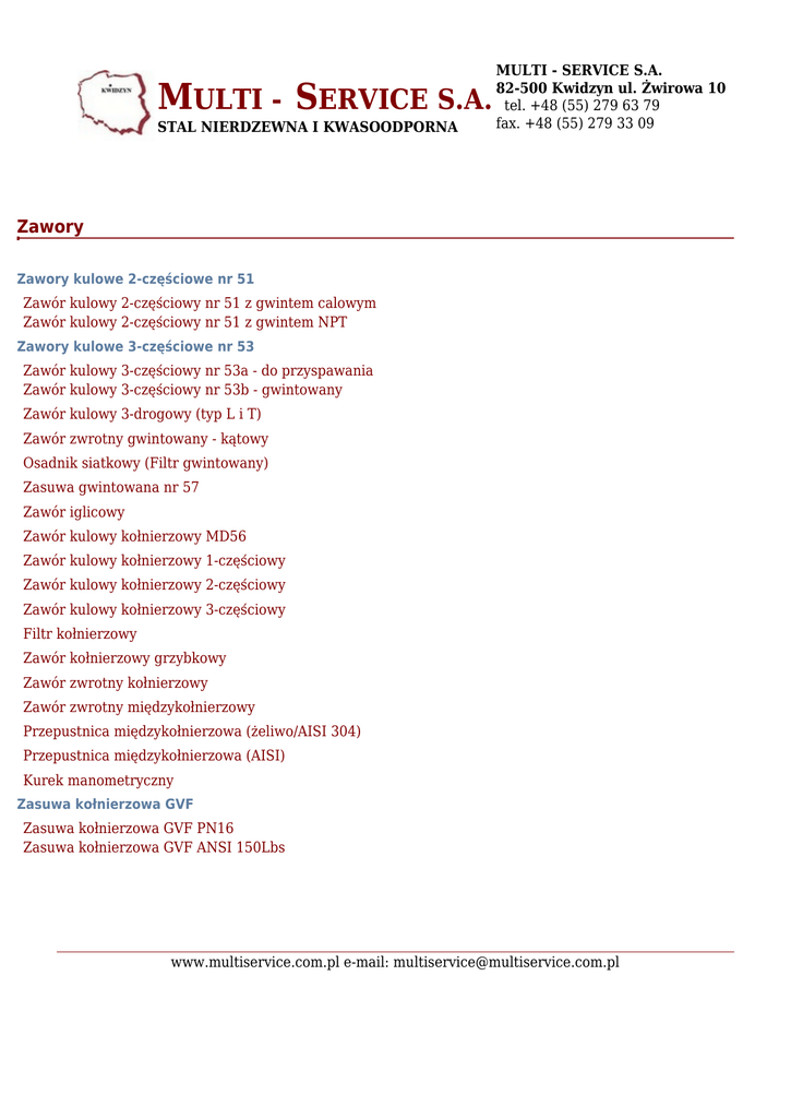 MULTI - SERVICE S.A. STAL NIERDZEWNA I KWASOODPORNA MULTI - SERVICE S.A. 82-500 Kwidzyn ul. Żwirowa 10 tel. +48 (55) 279 63 79 fax. +48 (55) 279 33 09 Zawory Zawory kulowe 2-częściowe nr 51 Zawór kulowy 2-częściowy nr 51 z gwintem calowym Zawór kulowy 2-częściowy nr 51 z gwintem NPT Zawory kulowe 3-częściowe nr 53 Zawór kulowy 3-częściowy nr 53a - do przyspawania Zawór kulowy 3-częściowy nr 53b - gwintowany Zawór kulowy 3-drogowy (typ L i T) Zawór zwrotny gwintowany - kątowy Osadnik siatkowy (Filtr gwintowany) Zasuwa gwintowana nr 57 Zawór iglicowy Zawór kulowy kołnierzowy MD56 Zawór kulowy kołnierzowy 1-częściowy Zawór kulowy kołnierzowy 2-częściowy Zawór kulowy kołnierzowy 3-częściowy Filtr kołnierzowy Zawór kołnierzowy grzybkowy Zawór zwrotny kołnierzowy Zawór zwrotny międzykołnierzowy Przepustnica międzykołnierzowa (żeliwo/AISI 304) Przepustnica międzykołnierzowa (AISI) Kurek manometryczny Zasuwa kołnierzowa GVF Zasuwa kołnierzowa GVF PN16 Zasuwa kołnierzowa GVF ANSI 150Lbs www.multiservice.com.pl e-mail: [email protected]