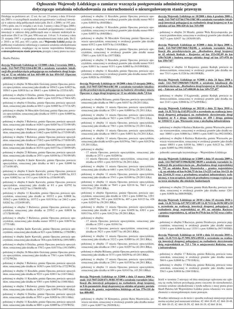 Ogłoszenie Wojewody Łódzkiego o zamiarze wszczęcia postępowania administracyjnego dotyczącego ustalenia odszkodowania za nieruchomości o nieuregulowanym stanie prawnym Działając na podstawie art. 12 ust. 4a i art. 23 ustawy z dnia 10 kwietnia 2003 r. o szczególnych zasadach przygotowania i realizacji inwestycji w zakresie dróg publicznych (tekst jedn. Dz.U. z 2008 r. nr 193, poz. 1194 z późn. zm.) w związku z art. 6 ust. 3 ustawy z dnia 25 lipca 2008 r. o zmianie ustawy o szczególnych zasadach przygotowania i realizacji inwestycji w zakresie dróg publicznych oraz o zmianie niektórych innych ustaw (Dz.U. nr 154, poz. 958) oraz art. 114 ust. 3 i 4 ustawy z dnia 21 sierpnia 1997 r. o gospodarce nieruchomościami (tekst jedn. Dz.U. z 2010 r. nr 102, poz. 651 z późn. zm.) Wojewoda Łódzki podaje do publicznej wiadomości informację o zamiarze ustalenia odszkodowania za nieruchomości, znajdujące się na terenie województwa łódzkiego, o nieuregulowanym stanie prawnym, przejęte z mocy prawa na rzecz: - Skarbu Państwa decyzją Wojewody Łódzkiego nr 12/2008 z dnia 2 września 2008 r., znak: IAI-7047/3782/1184-6/RC/08 o ustaleniu warunków lokalizacji dla przedsięwzięcia polegającego na rozbudowie drogi krajowej nr 12 na odcinku od km 445+400 do km 454+165 (Opoczno – granica województwa) - położonej w obrębie 36 Mroczków Gościnny, gminie Opoczno, powiecie opoczyńskim, oznaczonej jako działki nr 1054/2 o pow. 0,0023 ha, 1056/1 o pow. 0,0018 ha i nr 1064/1 o pow. 0,0044 ha (1535A/AP); - położonej w obrębie 6 Dzielna, gminie Opoczno, powiecie opoczyńskim, oznaczonej jako działka nr 400/1 o pow. 0,0219 ha (1704A/AP); - położonej w obrębie 6 Dzielna, gminie Opoczno, powiecie opoczyńskim, oznaczonej jako działka nr 601/1 o pow. 0,0065 ha (1717A/AP); - położonej w obrębie 36 Mroczków Gościnny, gminie Opoczno, powiecie opoczyńskim, oznaczonej jako działka nr 1055/1 o pow. 0,0009 ha, (1535B/AP); - położonej w obrębie 11 Kraszków, gminie Opoczno, powiecie opoczyńskim, oznaczonej w ewidencji gruntów jako działki numer 903/1 o pow. 0,0010 ha (844/EKw); - położonej w obrębie 11 Kraszków, gminie Opoczno, powiecie opoczyńskim, oznaczonej w ewidencji gruntów jako działka numer 894/1 o pow. 0,0053 ha (846/EKw); - położonej w obrębie 36 Mroczków Gościnny, gminie Opoczno, powiecie opoczyńskim, oznaczonej w ewidencji gruntów jako działki numer 635/2 o pow. 0,0574 ha (1418/EKw); - położonej w obrębie 3 Bielowice, gminie Opoczno, powiecie opoczyńskim, oznaczonej w ewidencji gruntów jako działki numer 1780/1 o pow. 0,0135 ha (1877/EKł); - położonej w obrębie 11 Kraszków, gminie Opoczno, powiecie opoczyńskim, oznaczonej w ewidencji gruntów jako działki numer 914/1 o pow. 0,0011 ha i numer 915/1 o pow. 0,0005 ha (915/09/EKł); - położonej w obrębie 11 Kraszków, gminie Opoczno, powiecie opoczyńskim, oznaczonej w ewidencji gruntów jako działka numer 891/1 o pow. 0,0026 ha (910/EKł); decyzją Wojewody Łódzkiego nr 10/2008 z dnia 13 sierpnia 2008 r., znak: IAI-7047/3207/964-6/RC/08 o ustaleniu warunków lokalizacji dla przedsięwzięcia polegającego na budowie obwodnicy miasta Opoczno w ciągu drogi krajowej nr 12 na odcinku około 7,8 km - położonej w obrębie Różanna, gminie Opoczno, powiecie opoczyńskim, oznaczonej jako działka nr 306/1 o pow. 0,0317 ha (30.2011.ŁKa), - położonej w obrębie 11 miasta Opoczno, powiecie opoczyńskim, oznaczonej jako działka nr 329/1 o pow. 0,0088 ha (31.2011.ŁKa), - położonej w obrębie 11 miasta Opoczno, powiecie opoczyńskim, oznaczonej jako działka nr 762/1 o pow. 0,0077 ha (32.2011.ŁKa), - położonej w obrębie 3 Bielowice, gminie Opoczno, powiecie opoczyńskim, oznaczonej jako działka nr 1626/3 o pow. 0,0267 ha (1721/09/AP); - położonej w obrębie 11 miasta Opoczno, powiecie opoczyńskim, oznaczonej jako działka nr 756/1 o pow. 0,0166 ha (33.2011.ŁKa), - położonej w obrębie 3 Bielowice, gminie Opoczno, powiecie opoczyńskim, oznaczonej jako działka nr 1146/2 o pow. 0,0381 ha (1715/09/AP); - położonej w obrębie 11 miasta Opoczno, powiecie opoczyńskim, oznaczonej jako działka nr 1063/1 o pow. 0,0031 ha (34.2011.ŁKa), - położonej w obrębie 3 Bielowice, gminie Opoczno, powiecie opoczyńskim, oznaczonej jako działka nr 1718/2 o pow. 0,0789 ha (1718/09/AP); - położonej w obrębie 11 miasta Opoczno, powiecie opoczyńskim, oznaczonej jako działki nr 620 o pow. 0,0159 ha, 746/1 o pow. 0,0129 ha (35.2011.ŁKa), - położonej w obrębie 3 Bielowice, gminie Opoczno, powiecie opoczyńskim, oznaczonej jako działka nr 1615/4 o pow. 0,0373 ha (1720/09/AP); - położonej w obrębie 23 Różanna, gminie Opoczno, powiecie opoczyńskim, oznaczonej jako działka nr 293/1 o pow. 0,0184 ha (1781/09/AP); - położonej w obrębie 8 Janów Krawicki, gminie Opoczno, powiecie opoczyńskim, oznaczonej jako działka nr 66/1 o pow. 0,0090 ha (1714/09/AP); - położonej w obrębie 8 Janów Karwicki, gminie Opoczno, powiecie opoczyńskim, oznaczonej jako działki nr 11/1 o pow. 0,0091 ha, 83/3 o pow. 0,0082 ha i nr 13/1 o pow. 0,0438 ha (1536/09/AP); - położonej w obrębie: - 17 miasta Opoczno, powiecie opoczyńskim, oznaczonej jako działka nr 257/1 o pow. 0,0208 ha - 11 miasta Opoczno, powiecie opoczyńskim, oznaczonej jako działka nr 650/1 o pow. 0,0158 ha (36.2011.ŁKa), - położonej w obrębie 11 miasta Opoczno, powiecie opoczyńskim, oznaczonej jako działka nr 648/1 o pow. 0,0120 ha (28.2011.ŁKa), - położonej w obrębie 11 miasta Opoczno, powiecie opoczyńskim, oznaczonej jako działka nr 374/1 o pow. 0,0100 ha (29.2011.ŁKa), - położonej w obrębie 8 Janów Karwicki, gminie Opoczno, powiecie opoczyńskim, oznaczonej jako działki nr 8/1 o pow. 0,0792 ha i nr 10/1 o pow. 0,0227 ha (1706/09/AP); - położonej w obrębie 11 miasta Opoczno, powiecie opoczyńskim, oznaczonej jako działki nr 764/1 o pow. 0,0116 ha, 766/1 o pow. 0,0119 ha (37.2011.RKa), - położone