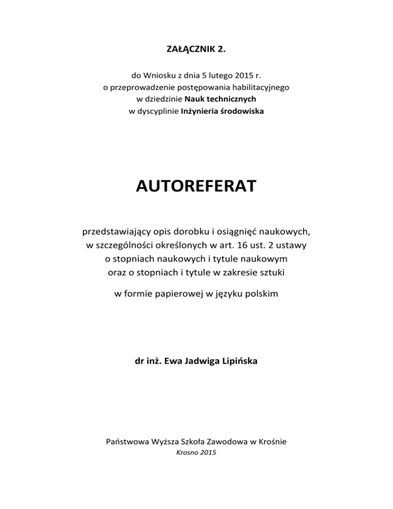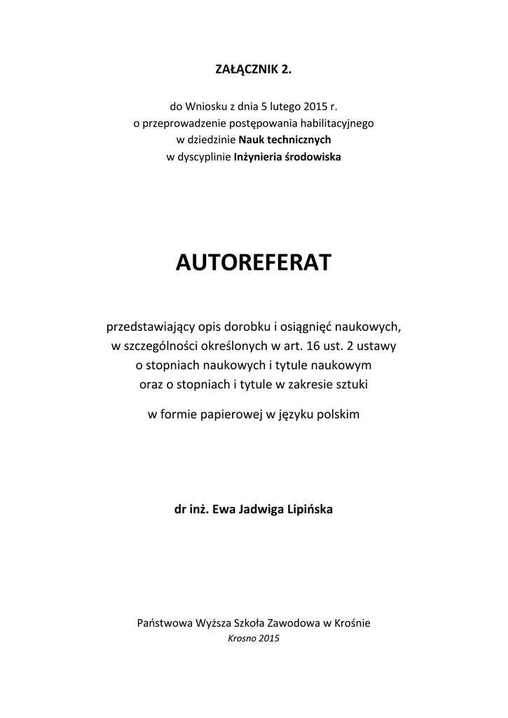 ZAŁĄCZNIK 2. do Wniosku z dnia 5 lutego 2015 r. o przeprowadzenie postępowania habilitacyjnego w dziedzinie Nauk technicznych w dyscyplinie Inżynieria środowiska AUTOREFERAT przedstawiający opis dorobku i osiągnięć naukowych, w szczególności określonych w art. 16 ust. 2 ustawy o stopniach naukowych i tytule naukowym oraz o stopniach i tytule w zakresie sztuki w formie papierowej w języku polskim dr inż. Ewa Jadwiga Lipińska Państwowa Wyższa Szkoła Zawodowa w Krośnie Krosno 2015 Spis treści 1 Imię i nazwisko …….………………………………………………………..…..………………………….….………..… 5 2 Posiadane dyplomy, stopnie naukowe/artystyczne – z podaniem nazwy, miejsca i roku ich uzyskania oraz tytułu rozprawy doktorskiej …….………………..……………….……………..……… 5 Informacje o dotychczasowym zatrudnieniu w jednostkach naukowych ……………………………………………………………………………………………………………………. 7 Wskazanie osiągnięcia wynikającego z art. 16 ust. 2 ustawy z dnia 14 marca 2003 r. o stopniach naukowych i tytule naukowym oraz o stopniach i tytule w zakresie sztuki (Dz.U. nr 65, poz. 595 ze zm.) ………………….....…………………………………………………….…………… 9 3 4 4 A. 4 B. 4 C. 5 Tytuł osiągnięcia naukowego ………………………………………………………………………..…. Cykl publikacji powiązanych tematycznie (autor/autorzy, tytuł/tytuły publikacji, rok wydania, nazwa wydawnictwa) …………………………………………………….……….….. Omówienie celu naukowego/artystycznego ww. prac i osiągniętych wyników wraz z omówieniem ich ewentualnego wykorzystania ………………..…………………… Omówienie pozostałych osiągnięć naukowo – badawczych ………………………………….……….. 9 9 13 25 3 1. Imię i nazwisko Ewa Jadwiga Lipińska 2. Posiadane dyplomy, stopnie naukowe/artystyczne – z podaniem nazwy, miejsca i roku ich uzyskania oraz tytuł rozprawy doktorskiej Uzyskany stopień naukowy: doktor nauk technicznych, w dyscyplinie: inżynieria środowiska, nadany uchwałą Rady Wydziału Geodezji Górniczej i Inżynierii Środowiska Akademii Górniczo-Hutniczej im. Stanisława Staszica w Krakowie, Tytuł rozprawy doktorskiej: Gospodarka odpadami w gminie w świetle standardów europejskich Data obrony: 12 października 2006 r. Dyplom w zakresie Zarządzanie i przedsiębiorczość w oświacie nadany przez Kolegium Zarządzania Akademii Ekonomicznej w Katowicach im. Karola Adamieckiego, Data nadania: 2000 r. Uzyskany tytuł: magister, Akademia Górniczo-Hutnicza im. Stanisława Staszica w Krakowie, Wydział Wiertnictwa, Nafty i Gazu, Kierunek: Górnictwo i Geologia, w zakresie: Ochrona środowiska w gospodarce. Tytuł pracy magisterskiej: Koncepcja przemysłowego składowania odpadów komunalnych z uwzględnieniem produkcji biogazu w regionie krośnieńskim województwa podkarpackiego Data obrony: 19 maja 2000 r. Uzyskany tytuł: inżynier, Akademia Górniczo-Hutnicza im. Stanisława Staszica w Krakowie, Wydział Wiertnictwa, nafty i Gazu, Kierunek: Górnictwo i geologia, w zakresie: Gazownictwo ziemne. Tytuł pracy inżynierskiej: Analiza zmian objętości porowej magazynowaniu gazu na przykładzie PMG Data obrony: 2 marca 1998 r. w podziemnym 5 3. Informacje o dotychczasowym naukowych/artystycznych Zatrudnienie zatrudnieniu w jednostkach Państwowa Wyższa Szkoła Zawodowa im. Stanisława Pigonia w Krośnie Rynek 1, 38-400 Krosno Instytut Politechniczny Zakład Inżynierii Środowiska Przebieg pracy zawodowej 2009 – aktualnie – starszy wykładowca, 2005 – 2009 – wykładowca, 2001–2005 – asystent. Dodatkowe zatrudnienie Politechnika Rzeszowska im. Ignacego Łukasiewicza w Rzeszowie Wydział Budownictwa i Inżynierii Środowiska Al. Powstańców Warszawy, 35-959 Rzeszów Przebieg pracy zawodowej 2014-2015 – starszy wykładowca, 2013 – wykładowca, 2011 – wykładowca. Wyższa Szkoła Inżynieryjno – Ekonomiczna ul. Miłocińska 40, 35-232 Rzeszów Przebieg pracy zawodowej 2013-2014 – wykładowca. 7 4. Wskazanie osiągnięcia wynikającego z art. 16 ust. 2 ustawy z dnia 14 marca 2003 r o stopniach naukowych i tytule naukowym oraz o stopniach i tytule w zakresie sztuki (Dz. U nr 65, poz. 595 ze zm.) 4 A. Tytuł osiągnięcia naukowego Osiągnięcie naukowe, uzyskane po otrzymaniu stopnia naukowego doktora, które stanowi znaczący wkład w rozwój dyscypliny naukowej Inżynieria środowiska, wynikający z art. 16 ust. 2 ustawy z dnia 14 marca 2003 r. o stopniach naukowych i tytule naukowym oraz o stopniach i tytule w zakresie sztuki (Dz. U. nr 65, poz. 595, ze zm.) ma tytuł: Wieloletnia emisja i migracja substancji węglowodorowych na obszarach dawnego górnictwa i przemysłu naftowego w gminach o statusie uzdrowiska 4 B. Cykl publikacji powiązanych tematycznie (autor/autorzy, tytuł/tytuły publikacji, rok wydania, nazwa wydawnictwa) Monografie 1. Lipińska E. J., 2013, Rozmieszczenie i wpływ na środowisko emisji ze złóż substancji węglowodorowych współwystępujących ze złożami wód mineralnych w gminie IwoniczZdrój, Stowarzyszenie Naukowe Przestrzeń Społeczna i Środowisko, ISBN 978-83-6366629-3, Rzeszów. Mój wkład w powstanie tej pracy polegał na przygotowaniu materiałów źródłowych, opracowaniu koncepcji doświadczeń, nadzór nad doświadczeniami, analizie materiału badawczego, przygotowaniu koncepcji i ostatecznej wersji rozdziałów manuskryptu. Mój udział procentowy szacuję na 100 %. 2. Lipińska E. J., Nawrot J., Czaderna E., Cwynar M., Satkowska D., 2014, Uzdrowiska województwa podkarpackiego – identyfikacja wybranych zagrożeń środowiska, w: E. J. Lipińska (red.): Biblioteka Monitoringu Środowiska, Wojewódzki Inspektorat Ochrony Środowiska, ISBN