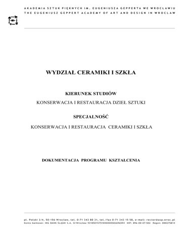 WYDZIAŁ CERAMIKI I SZKŁA KIERUNEK STUDIÓW KONSERWACJA I RESTAURACJA DZIEŁ SZTUKI SPECJALNOŚĆ KONSERWACJA I RESTAURACJA CERAMIKI I SZKŁA DOKUMENTACJA PROGRAMU KSZTAŁCENIA I. Ogólna charakterystyka prowadzonych studiów 1. Kierunek: Konserwacja i Restauracja Dzieł Sztuki 2. Specjalizacja: Konserwacja i Restauracja Ceramiki i Szkła 3. Poziom studiów: jednolite magisterskie 4. Profil kształcenia: ogólnoakademicki 5. Forma studiów: studia stacjonarne jednolite, magisterskie 6 letnie. 6. Tytuł zawodowy uzyskiwany przez absolwenta: magister sztuki, kierunek – Konserwacja i Restauracja Dzieł Sztuki, specjalizacja – Konserwacja i Restauracja Ceramiki i Szkła. 7. Przyporządkowanie do jednego lub większej liczby obszarów kształcenia: Kierunek studiów Konserwacji i Restauracji Dzieł Sztuki, w specjalizacji Konserwacja i Restauracja Ceramiki i Szkła należy do obszaru kształcenia w zakresie sztuki. 8. Wskazanie dziedzin nauki lub sztuki i dyscyplin naukowych lub artystycznych, do których odnoszą się efekty kształcenia: Obszar nauki – obszar sztuki, dziedziny nauki / dziedziny sztuki dziedzina sztuk plastycznych, dyscypliny naukowe / dyscypliny artystyczne - konserwacja i restauracja dzieł sztuki. 9. Ogólne cele kształcenia oraz możliwości zatrudnienia i kontynuacji kształcenia przez absolwentów studiów Głównym celem kształcenia jest przygotowanie w pełni samodzielnego świadomego artystycznie i warsztatowo specjalisty, zdolnego do podejmowania różnorodnych zagadnień konserwatorskich, restauratorskich oraz kreacyjnych z zakresu specjalności studiów. W trakcie studiów student dzięki wielu wysokiej klasy wykładowcom Akademii Sztuk Pięknych i współpracujących z nią innych instytucji naukowych w kraju i zagranicą, uzyskuje szeroką wiedzę i umiejętności m.in. z zakresu historii sztuki, filozofii, socjologii, chemii, fizyki, archeologii, konserwacji i restauracji ceramiki i szkła, technologii oraz technik ceramicznych i szklarskich. Student ma możliwość uzyskania wiedzy i praktycznych umiejętności zdobywanych także w trakcie praktyk zawodowych w kraju i zagranicą związanych z wykonywaniem konserwacji i restauracji obiektów ceramicznych i szklanych, a przygotowanie ogólnoplastyczne i umiejętności związane z projektowaniem ceramiki i szkła, znacznie rozszerzają zakres ich kwalifikacji. Absolwenci, dzięki tak ukierunkowanej wiedzy i nabytym praktycznym umiejętnościom, będą niezwykle poszukiwanymi ekspertami w swojej specjalizacji, jedynymi na rynku polskim i międzynarodowym. Student po ukończeniu studiów magisterskich może kontynuować kształcenie na studiach doktoranckich na wybranej przez siebie uczelni mającej kierunek Konserwacja i Restauracja Dzieł Sztuki. 10. Wymagania wstępne (oczekiwane kompetencje kandydata zwłaszcza w przypadku studiów drugiego stopnia) Studia przeznaczone są dla osób posiadających świadectwo dojrzałości oraz zaświadczenie od okulisty (o prawidłowym rozróżnianiu barw). 11. Zasady rekrutacji 1. Rekrutacja na I rok studiów stacjonarnych odbywać się będzie w terminie rekrutacji studiów stacjonarnych jak na wszystkich kierunkach. 2. Kwalifikacja kandydatów przeprowadzona zostanie w terminie: a) studia stacjonarne ( w chwili obecnej połowa czerwca). 3. Limit przyjęć zostaje ustalony na 6 osób - studia stacjonarne, jednolite magisterskie 4. Kandydaci składają następujące dokumenty: a) podanie według obowiązujących wzorców, b) świadectwo dojrzałości, c) cztery zdjęcia, d) zaświadczenie od lekarza o braku przeciwwskazań do nauki w szkole plastycznej, e) kserokopię dowodu osobistego, a w przypadku mężczyzn również kserokopię książeczki wojskowej, f) potwierdzenie dokonania opłaty egzaminacyjnej, g) zaświadczenie od okulisty ( o prawidłowym rozróżnianiu barw). 2 ZAKRES EGZAMINU WSTĘPNEGO Egzamin wstępny na specjalizację - Konserwacja i Restauracja Ceramiki i Szkła jest egzaminem konkursowym. O przyjęciu na studia stacjonarne, decyduje ilość punktów uzyskanych z poszczególnych części egzaminu. Maksymalna ilość punktów możliwa do uzyskania – 40. Etapy egzaminu: I dzień Egzamin z rysunku – 10 punktów. Egzamin z malarstwa lub rzeźby ( do wyboru ) – 10 punktów. II dzień Egzamin specjalistyczny – 15 punktów. III dzień Omówienie wykonanych zadań specjalistycznych – 5 punktów. III. Opis programu studiów 1. Plan studiów Studia na kierunku - Konserwacja i Restauracja Dzieł Sztuki, w specjalizacji – Konserwacja i Restauracja Ceramiki i Szkła są studia stacjonarne jednolite, magisterskie 6 letnie. Zawierają 12 semestrów, ogólną liczbę godzin 5460 i liczbę punktów ECTS: 360. Kolorem czerwonym oznaczono punkty ECTS 1. PRZEDMIOTY PODSTAWOWE PRZEDMIOTY OBOWIĄZKOWE 1.1. HISTORIA SZTUKI 1.2. HISTORIA FILOZOFII 1.3 HISTORIA KULTURY 1.4. STYLOZNAWSTWO 1.5. HISTORIA CERAMIKI I SZKŁA 1.6. PROPEDEUTYKA DOKUMENTACJI ZABYTKU ARCHEOLOGICZNEGO I 1 2 Z ZS 2 2 2 II 3 4 Z ZS 2 2 2 III IV 5 6 7 V 8 Z ZS 2 2 2 Z ZS 1 1 Z ZS 1 1 1 Z ZS 2 2 2 JĘZYKI OBCE 1.8.* W-F 1.9.* DO WYBORU: - Podstawy estetyki - Etyka - Estetyka XX-XXI w. DO WYBORU: - malarstwo - grafika - rzeźba - rysunek - działanie i struktury wizualne - toczenie na toczku garncarskim 1.10* 10 Z ZS 2 2 2 1 1.7.* 9 Z ZS 1 1 Z ZS 1 4 1 Z Z 1 2 1 Z 1 E 4 2 Z ZS 1 2 1 1 Z ZS Z 3 2 3 ZS 3 2 3 3 VI 11 12 PRZEDMIOTY OBOWIĄZKOWE I II 1 1.11. 1.12. 1.13. 1.14. 1.15. 1.16. 2 1.18. 1.19. III IV V 5 6 7 8 9 10 ZS PE ZS PE VI 11 12 3 4 2 2 4 4 ZS PE ZS PE 3 4 2 2 4 4 PROJEKTOWANIE SZKŁA ARTYSTYCZNEGO I PRZEMYSŁOWEGO CHEMIA OGÓLNA Z ELEMENTAMI FIZYKI MATERIAŁOZNASTWO KONSERWATORSKIE CHEMIA KONSERWATORSKA Z 2 ZS 2 1 Z E 1 1 1 Z E 1 2 1 PIGMENTY I SPOIWA NATURALNE Z E 1 1 BADANIA PIGMENTÓW I SPOIW PROFILAKTYKA KONSERWATORSKA ZS 2 1 ZS 1 2 1.21. DOKUMENTACJA FOTOGRAFICZNA SPEKTROSKOPIA BADANIA N/NISZCZĄCE PODSTAWY INFORMATYKI 1.22. PRAWO AUTORSKIE 1.23. ARCHEOLOGIA CERAMIKI 1.24. AR
