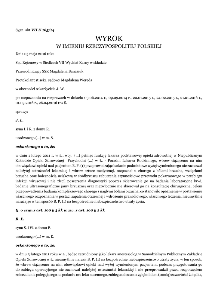 Sygn. akt VII K 165/14 WYROK W IMIENIU RZECZYPOSPOLITEJ POLSKIEJ Dnia 05 maja 2016 roku Sąd Rejonowy w Siedlcach VII Wydział Karny w składzie: Przewodniczący SSR Magdalena Banasiuk Protokolant st.sekr. sądowy Magdalena Wereda w obecności oskarżyciela J. W. po rozpoznaniu na rozprawach w dniach: 03.06.2014 r., 09.09.2014 r., 20.01.2015 r., 24.02.2015 r., 21.01.2016 r., 01.03.2016 r., 26.04.2016 r.w S. sprawy: J. L. syna I. i R. z domu R. urodzonego (...) w m. S. oskarżonego o to, że: w dniu 1 lutego 2011 r. w Ł., woj. (...) pełniąc funkcję lekarza podstawowej opieki zdrowotnej w Niepublicznym Zakładzie Opieki Zdrowotnej Przychodni (...) w Ł. - Poradni Lekarza Rodzinnego, wbrew ciążącemu na nim obowiązkowi opieki nad pacjentem B. P. (1) przeprowadzając badanie podmiotowe wyżej wymienionego nie zachował należytej ostrożności lekarskiej i wbrew sztuce medycznej, rozpoznał u chorego z bólami brzucha, wzdęciami brzucha oraz bolesnością uciskową w śródbrzuszu zaburzenia czynnościowe przewodu pokarmowego w przebiegu infekcji wirusowej i nie zlecił poszerzenia diagnostyki poprzez skierowanie go na badania laboratoryjne krwi, badanie ultrasonograficzne jamy brzusznej oraz niezwłocznie nie skierował go na konsultację chirurgiczną, celem przeprowadzenia badania kompleksowego chorego z nagłymi bólami brzucha, co stanowiło opóźnienie w postawieniu właściwego rozpoznania w postaci zapalenia otrzewnej i wdrożeniu prawidłowego, właściwego leczenia, nieumyślnie narażając w ten sposób B. P. (1) na bezpośrednie niebezpieczeństwo utraty życia, tj. o czyn z art. 160 § 3 kk w zw. z art. 160 § 2 kk R. Ł. syna S. i W. z domu P. urodzonego (...) w m. K. oskarżonego o to, że: w dniu 3 lutego 2011 roku w Ł., będąc zatrudniony jako lekarz anestezjolog w Samodzielnym Publicznym Zakładzie Opieki Zdrowotnej w Ł. nieumyślnie naraził B. P. (1) na bezpośrednie niebezpieczeństwo utraty życia, w ten sposób, że wbrew ciążącemu na nim obowiązkowi opieki nad wyżej wymienionym pacjentem, podczas przygotowania go do zabiegu operacyjnego nie zachował należytej ostrożności lekarskiej i nie przeprowadził przed rozpoczęciem znieczulenia polegającego na podaniu mu leku nasennego, zabiegu odessania zgłębnikiem (sondą) zawartości żołądka, jak również nie wykonał zabiegu S., który w sytuacji, gdy nie założono sondy do żołądka, winien być bezwzględnie i prawidłowo wykonany, co skutkowało jego zachłyśnięciem się z następowym zachłystowym zapaleniem płuc, w następstwie czego w dniu 23 lutego 2011 r. nastąpił zgon B. P. (1) w Wojewódzkim Szpitalu (...) w B., tj. o czyn art. 160 § 3 kk w zw. z art. 160 § 2 kk ORZEKA: I. oskarżonych J. L. i R. Ł. uznaje za winnych dokonania zarzucanego im czynu wyczerpującego dyspozycję art. 160 § 3 kk w zw. z art. 160 § 2 kk i za czyn ten na podstawie art. 160 § 3 kk w zw. z art. 160 § 2 kk wymierza oskarżonym karę po 8 (osiem) miesięcy pozbawienia wolności; II. na podstawie art. 69 § 1 i art. 70 § 1 kk wykonanie tak orzeczonych kar pozbawienia wolności warunkowo zawiesza oskarżonym, ustalając okres próby na 2 (dwa) lata; III. na podstawie art.71 § 1 kk wymierza oskarżonym karę grzywny w wysokości po 150 (sto pięćdziesiąt) stawek dziennych, ustalając wysokość jednej stawki dziennej na 100 (sto) złotych; IV. na podstawie art. 46 § 1 kk orzeka od każdego z oskarżonych na rzecz oskarżycieli posiłkowych: Z. P., A. P. (1) i M. P. po 10.000 (dziesięć tysięcy złotych) tytułem częściowego naprawienia szkody; V. zasądza od oskarżonych J. L. i R. Ł. na rzecz oskarżycieli posiłkowych: Z. P., A. P. (1) i M. P. po 462 zł (czterysta sześćdziesiąt dwa złote) tytułem zwrotu wydatków związanych z ustanowieniem pełnomocnika z wyboru, VI. zasądza od oskarżonych na rzecz Skarbu Państwa kwotę po 1680 zł (jeden tysiąc sześćset osiemdziesiąt złotych) tytułem opłaty oraz kwotę po 3.236 zł (trzy tysiące dwieście trzydzieści sześć) złotych tytułem pozostałych kosztów sądowych. Sygn. akt VII K 165/14 UZASADNIENIE W toku przewodu sądowego, Sąd ustalił następujący stan faktyczny: B. P. (1) wraz z rodzicami zamieszkiwał w Ł. przy ul. (...). W niedzielę 30 stycznia 2011 r. w godzinach rannych zaczął wymiotować i doszedł do wniosku, iż „prawdopodobnie ma grypę żołądkową”, zwłaszcza, że w okresie wcześniejszym pozostali członkowie rodziny również na nią chorowali. W związku z tym, iż bóle brzucha nie ustępowały w dniu 1 lutego 2011 r. B. P. (1) zgłosił się do Niepublicznego Zakładu Opieki Zdrowotnej - Przychodni (...) w Ł. do lekarza podstawowej (...) - specjalisty chorób wewnętrznych i specjalisty medycyny rodzinnej. Lekarz po przeprowadzonym badaniu rozpoznał (i odnotował w dokumentacji lekarskiej) „Bóle brzucha, wzdęcie brzucha okresowo. Brzuch miękki, bolesny uciskowo w śródbrzuszu. Objawów otrzewnowych nie stwierdza się”. Pacjentowi wystawił receptę zalecając leki: D., H., S., E.. W związku z tym, iż dolegliwości w dalszym ciągu się utrzymywały w dniu 3 lutego 2011 r. (czwartek) A. P. (1) zgłosiła się do lekarza (...). Na wizytę u lekarza nie stawił się natomiast B. P. (1). Lekarz zalecił konsultację chirurgiczną i wystawił skierowanie do Poradni Chirurgicznej w związku z bólami brzucha jej syna. W związku z tym, iż (...) Chirurgiczna nie była już czynna, rodzicie przywieźli B. P. (1) do Izby Przyjęć Szpitala w Ł.. W tymże dniu o godz. 15.05 B. P. (1) w trybie nagłym został przyjęty na Oddział Chirurgiczny Samodzielnego Publicznego Zakładu Opieki Zdrowotnej w Ł.. Jako rozpoznanie wstępne ustalone przez lekarza przyjmującego przyjęto „podejrzenie niedrożności”. W „wywiadzie lekarskim” stwierdzono „Chory lat 21 przyjęty do Oddziału z powodu bólów brzucha. Dolegliwości utrzymują się od pięciu dni. Dwa razy wymiotował w domu. Od dwó