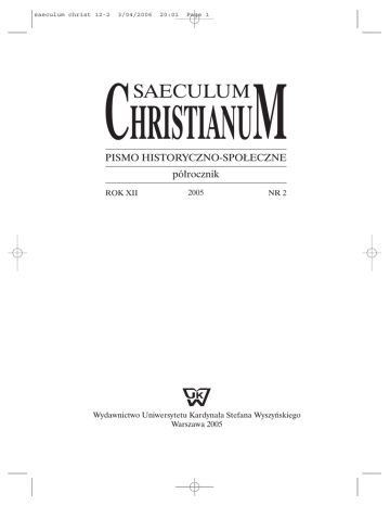 saeculum christ 12-2 3/04/2006 20:01 Page 1 CHRISTIANUM SAECULUM PISMO HISTORYCZNO-SPO¸ECZNE pó∏rocznik ROK XII 2005 NR 2 Wydawnictwo Uniwersytetu Kardyna∏a Stefana Wyszyƒskiego Warszawa 2005 saeculum christ 12-2 3/04/2006 20:01 Page 2 UNIWERSYTET KARDYNA¸A STEFANA WYSZY¡SKIEGO WYDZIA¸ NAUK HISTORYCZNYCH I SPO¸ECZNYCH Redaguje zespó∏ Redaktor naczelny: Ks. Józef Mandziuk Zast´pca redaktora: Ks. Henryk Skorowski Sekretarze: Ks. Jerzy Koperek, Ks. Janusz Nowiƒski Ok∏adk´ projektowa∏: Stanis∏aw Stosiek Za zgodà Kurii Metropolitalnej Warszawskiej ISSN 1232-1575 Zg∏oszenia prenumeraty przyjmuje Wydawnictwo UKSW ul. Dewajtis 5, 01-815 Warszawa, tel./fax 839-89-85 Adres redakcji: ul. Dewajtis 5, 01-815 Warszawa e-mail: [email protected] www.uksw.edu.pl www. ika.edu.pl Pozycja dofinansowana ze Êrodków Komitetu Badaƒ Naukowych Druk i oprawa: OFICYNA WYDAWNICZO-POLIGRAFICZNA „ADAM” ul. Rolna 191/193, 02-729 Warszawa tel./fax 843-20-52, tel. 843-08-79, 843-37-23, 843-47-91 nak∏ad: 350 egz. saeculum christ 12-2 3/04/2006 20:01 Page 3 SPIS TREÂCI PAMI¢CI KS. PROF. UKSW DRA HAB. EDWARDA NAWROTA Ks. Józef M a n d z i u k, ˚ycie i dzia∏alnoÊç ks. prof. UKSW dra hab. Edwarda Nawrota (1947-2005) . . . . . . . . . . . . . . . . . . . . . . . . . . . . . . . . . . . Ks. Waldemar G l i ƒ s k i, Bibliografia prac ks. prof. UKSW dra hab. Edwarda Nawrota . . . . . . . . . . . . . . . . . . . . . . . . . . . . . . . . . . . . . . . . . . . . . Ks. Józef M a n d z i u k, Po˝egnanie ks. prof. UKSW dra hab. Edwarda Nawrota . . . . . . . . . . . . . . . . . . . . . . . . . . . . . . . . . . . . . . . . . . . . . . . . . . . Marek Aleksander J a k u b i a k, Wspomnienie o Ksi´dzu Profesorze EdwardzieNawrocie . . . . . . . . . . . . . . . . . . . . . . . . . . . . . . . . . . . . . . . . . . . . ROZPRAWY I ARTYKU¸Y Dariusz M i l e w s k i, Uzurpacja Eugeniusza i ostatnie odrodzenie pogaƒskie w Rzymie w latach 392-394 . . . . . . . . . . . . . . . . . . . . . . . . . . . . . . . Agnieszka K r z e p k o w s k a, Jezuici na tle przemian politycznych, spo∏ecznych, religijnych i kulturalnych na Litwie i ˚mudzi w koƒcu XVI-go i w pierwszej po∏owie XVII wieku . . . . . . . . . . . . . . . . . . . . . . . . . . . . . Dorota P i e k a r s k a – W i n k l e r, Idea „Âwi´tej Rusi” i reformatorska dzia∏alnoÊç Piotra Wielkiego . . . . . . . . . . . . . . . . . . . . . . . . . . . . . . . . . Ks. Stanis∏aw P i e c h, Ksi´˝a diecezji polskich – doktorzy teologii Uniwersytetu Wiedeƒskiego w okresie niewoli narodowej . . . . . . . . . . . . Ks. Tomasz B ∏ a s z c z y k, Opieka Towarzystwa Êw. Wincentego á Paulo nad m∏odzie˝à rzemieÊlniczà we Wroc∏awiu w latach 1855-1871 . . . . . Ks. Józef M a n d z i u k, Arcybiskup Boles∏aw Kominek z Wroc∏awia – autor listu biskupów polskich do niemieckich . . . . . . . . . . . . . . . . . . . . . . . Ks. Bogdan S t a n a s z e k, Inwigilacja dzia∏alnoÊci kaznodziejskiej KoÊcio∏a przez w∏adze paƒstwowe na przyk∏adzie diecezji sandomierskiej w latach 1945-1970 . . . . . . . . . . . . . . . . . . . . . . . . . . . . . . . . . . . . . . . . . . . . . Ks. Jerzy K o p e r e k, Spór o paƒstwo w Êwietle wspó∏czesnych doktryn politycznych . . . . . . . . . . . . . . . . . . . . . . . . . . . . . . . . . . . . . . . . . . . . . . Ks. Marek T. C h m i e l e w s k i SDB, W trosce o wychowanie patriotyczne m∏odzie˝y. Refleksje na kanwie systemu wychowawczego Êw. Jana Bosko (1815-1888) . . . . . . . . . . . . . . . . . . . . . . . . . . . . . . . . . . . . . . . . . . . . . Ks. S∏awomir H. Z a r ´ b a SAC, ReligijnoÊç Polaków w procesie integracji europejskiej . . . . . . . . . . . . . . . . . . . . . . . . . . . . . . . . . . . . . . . . . . . . . Beata S z l u z, Problem pracy osób niepe∏nosprawnych . . . . . . . . . . . . 9 29 35 37 41 63 83 99 119 133 139 165 181 199 213 MATERIA¸Y I DOKUMENTACJA Ks. Józef M a n d z i u k, Bibliografia historii KoÊcio∏a katolickiego na Âlàsku. Uk∏ad alfabetyczno-chronologiczny. Cz´Êç II. Czasy nowo˝ytne. A. Okres austriacki (1520-1742) . . . . . . . . . . . . . . . . . . . . . . . . . . . . . . . . . . 227 saeculum christ 12-2 3/04/2006 20:01 Page 4 RECENZJE I OMÓWIENIA Ks. Dariusz G ó r s k i CM, Sytuacja chrzeÊcijaƒstwa na terenach pó∏nocnej Afryki od podbojów muzu∏maƒskich do XII wieku. Kraków 2004 – Tadeusz G o ∏ g o w s k i . . . . . . . . . . . . . . . . . . . . . . . . . . . . . . . . . . . . . . . . Georgy Joseph L a d a l, Archbishop Fulton J. Sheen. A Man for All Media. Ignatius Press. San Francisco 2001, ss. 144 – bp Andrzej F. D z i u b a . . . . . . . . . . . . . . . . . . . . . . . . . . . . . . . . . . . . . . . . . . . . . . . . . . The Image of Christ. Gabriele Finaldi with an Intoduction by Neil MacGregor and contributions by Susanna Avery-Quash, Xavier Bray, Erika Langmuir, Neil MacGregor, Alexander Strgis. National Gallery Company Limited. London. Distributed by Yale University Press.London 2000, ss. 224 – bp Andrzej F. D z i u b a . . . . . . . . . . . . . . . . . . . . . . . . . . . . Czes∏aw M a l e w s k i, Rody szlacheckie na Litwie w XIX wieku. Powiat lidzki. Wilno 2005, ss. 305 – Cyprian W i l a n o w s k i . . . . . . . . . . . Henryk K o m a ƒ s k i, Szczepan S i e k i e r k a, Ludobójstwo dokonane przez nacjonalistów ukraiƒskich na Polakach w województwie tarnopolskim 1939-1946. Wroc∏aw 2004, Wydaw. Nortom, ss. 1182, fot. 379 – ks. Józef M a n d z i u k . . . . . . . . . . . . . . . . . . . . . . . . . . . . . . . . . . . . . . . . . . J a n P a w e ∏ II, Pami´ç i to˝samoÊç. Rozmowy na prze∏omie tysiàcleci. Kraków 2005, ss. 174 – ks. Józef ¸ a c h . . . . . . . . . . . . . . . . . . . . . . . . . 279 286 289 291 293 295 SPRAWOZDANIA Artur A n d r z e j u k, II Kongres Mediewistów Polskich . . . . . . . . . . 299 INDEX RERUM DISSERTATIONES IN MEMORIAM prof. UKSW 