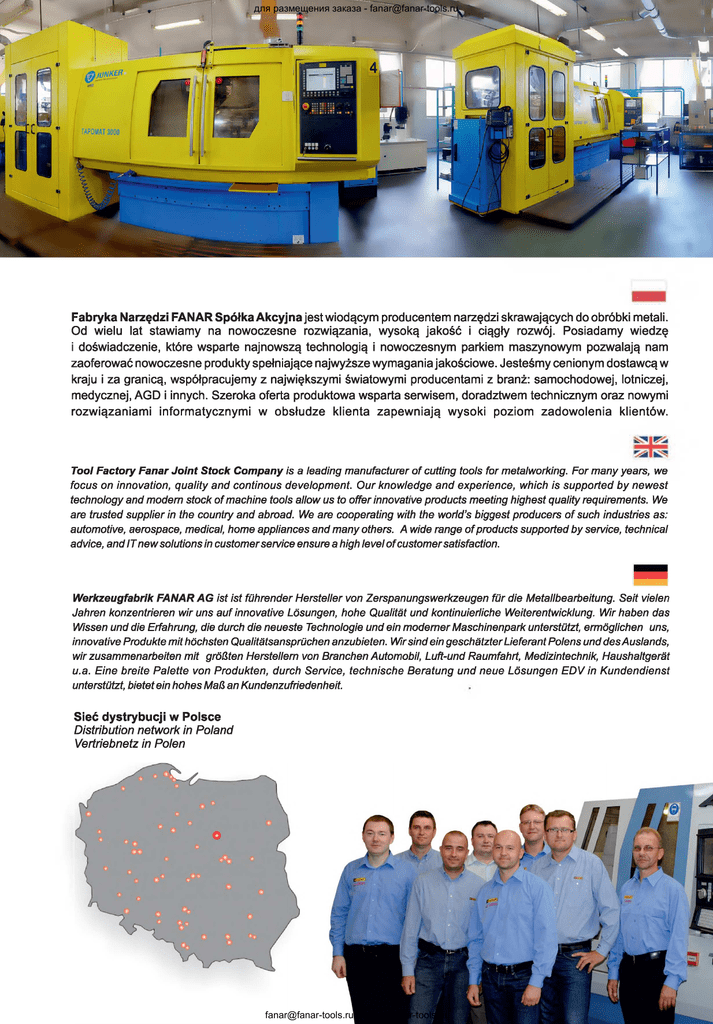 для размещения заказа - [email protected] TAPOMAT3000 F a b ry k a N a rz ę d z i F A N A R S p ó łk a A k c y jn a je s t w io d ą c y m p r o d u c e n te m n a r z ę d z i s k r a w a ją c y c h d o o b r ó b k i m e ta li. Od w ie lu la t s t a w ia m y na now oczesne r o z w ią z a n ia , w y s o k ą ja k o ś ć i c ią g ły r o z w ó j. P o s ia d a m y w ie d z ę i d o ś w ia d c z e n ie , k tó r e w s p a r t e n a jn o w s z ą t e c h n o lo g ią i n o w o c z e s n y m p a r k ie m m a s z y n o w y m p o z w a la ją n a m z a o f e r o w a ć n o w o c z e s n e p r o d u k ty s p e łn ia ją c e n a jw y ż s z e w y m a g a n ia ja k o ś c io w e . J e s t e ś m y c e n io n y m d o s ta w c ą w k ra ju i z a g r a n ic ą , w s p ó łp r a c u je m y z n a jw ię k s z y m i ś w ia to w y m i p r o d u c e n ta m i z b r a n ż : s a m o c h o d o w e j, lo tn ic z e j, m e d y c z n e j, A G D i in n y c h . S z e r o k a o fe r ta p r o d u k to w a w s p a r t a s e r w is e m , d o r a d z tw e m te c h n ic z n y m o r a z n o w y m i r o z w ią z a n ia m i in f o r m a t y c z n y m i w o b s łu d z e k lie n t a z a p e w n ia ją w ysoki p o z io m z a d o w o le n ia k lie n t ó w . T o o l F a c t o r y F a n a r J o i n t S t o c k C o m p a n y is a le a d in g m a n u fa c tu re r o f c u ttin g to o ls fo r m e ta lw o rk in g . F o r m a n y ye a rs , w e fo c u s o n in n o v a tio n , q u a lity a n d c o n tin o u s d e v e lo p m e n t. O u r k n o w le d g e a n d e x p e rie n c e , w h ic h is s u p p o r te d b y n e w e s t te c h n o lo g y a n d m o d e m s to c k o f m a c h in e to o ls a llo w u s to o ffe r in n o v a tiv e p ro d u c ts m e e tin g h ig h e s t q u a lity re q u ire m e n ts . W e a re tru s te d s u p p lie r in th e c o u n try a n d a b ro a d . W e a re c o o p e ra tin g w ith th e w o rld ’s b ig g e s t p ro d u c e rs o f s u c h in d u s trie s a s : a u to m o tiv e , a e ro s p a c e , m e d ic a l, h o m e a p p lia n c e s a n d m a n y o th e rs . A w id e ra n g e o f p ro d u c ts s u p p o rte d b y s e rv ic e , te c h n ic a l a d v ic e , a n d I T n e w s o lu tio n s in c u s to m e r s e rv ic e e n s u re a h ig h le v e l o f c u s to m e r s a tis fa c tio n . W e r k z e u g f a b r i k F A N A R A G is t is t fü h re n d e r H e rs te lle r v o n Z e rs p a n u n g s w e rk z e u g e n fü r d ie M e ta llb e a rb e itu n g . S e it v ie le n J a h re n k o n z e n trie re n w ir u n s a u f in n o v a tiv e L ö s u n g e n , h o h e Q u a litä t u n d k o n tin u ie rlic h e W e ite re n tw ic k lu n g . W ir h a b e n d a s W iss e n u n d d ie E rfa h m n g , d ie d u rc h d ie n e u e s te T ech no lo g ie u n d e in m o d e rn e r M a s c h in e n p a rk u n te rs tü tz t, e rm ö g lic h e n uns, in n o v a tiv e P ro d u k te m it h ö c h s te n Q u a litä ts a n s p rü c h e n a n z u b ie te n . W ir s in d e in g e s c h ä tz te r L ie fe ra n t P o le n s u n d d e s A u s la n d s , w ir Z u s a m m e n a rb e ite n m it g rö ß te n H e rs te lle rn v o n B ra n c h e n A u to m o b il, L u ft-u n d R a u m fa h rt, M e d iz in te c h n ik , H a u s h a ltg e rä t u .a . E in e b re ite P a le tte v o n P ro d u k te n , d u rc h S e rv ic e , te c h n is c h e B e r a tu n g u n d n e u e L ö s u n g e n E D V in K u n d e n d ie n s t u n te rs tü tz t, b ie te t e in h o h e s M a ß a n K u n d e n z u frie d e n h e it. S ie ć d y s try b u c ji w P o ls c e D istribution n etw o rk in P olan d Vertriebnetz in P olen [email protected] www.fanar-tools.ru