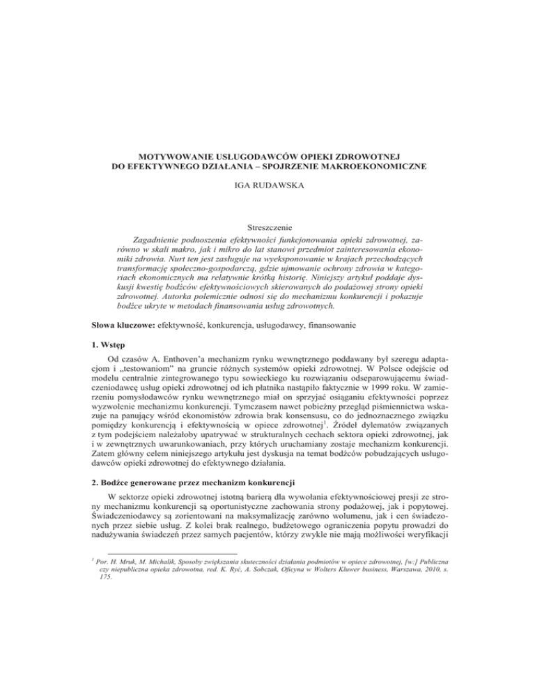 MOTYWOWANIE USŁUGODAWCÓW OPIEKI ZDROWOTNEJ DO EFEKTYWNEGO DZIAŁANIA – SPOJRZENIE MAKROEKONOMICZNE IGA RUDAWSKA Streszczenie Zagadnienie podnoszenia efektywnoĞci funkcjonowania opieki zdrowotnej, zarówno w skali makro, jak i mikro do lat stanowi przedmiot zainteresowania ekonomiki zdrowia. Nurt ten jest zasługuje na wyeksponowanie w krajach przechodzących transformacjĊ społeczno-gospodarczą, gdzie ujmowanie ochrony zdrowia w kategoriach ekonomicznych ma relatywnie krótką historiĊ. Niniejszy artykuł poddaje dyskusji kwestiĊ bodĨców efektywnoĞciowych skierowanych do podaĪowej strony opieki zdrowotnej. Autorka polemicznie odnosi siĊ do mechanizmu konkurencji i pokazuje bodĨce ukryte w metodach finansowania usług zdrowotnych. Słowa kluczowe: efektywno, konkurencja, usługodawcy, finansowanie 1. Wstp Od czasów A. Enthoven’a mechanizm rynku wewntrznego poddawany był szeregu adaptacjom i „testowaniom” na gruncie rónych systemów opieki zdrowotnej. W Polsce odejcie od modelu centralnie zintegrowanego typu sowieckiego ku rozwizaniu odseparowujcemu wiadczeniodawc usług opieki zdrowotnej od ich płatnika nastpiło faktycznie w 1999 roku. W zamierzeniu pomysłodawców rynku wewntrznego miał on sprzyja osiganiu efektywnoci poprzez wyzwolenie mechanizmu konkurencji. Tymczasem nawet pobieny przegld pimiennictwa wskazuje na panujcy wród ekonomistów zdrowia brak konsensusu, co do jednoznacznego zwizku pomidzy konkurencj i efektywnoci w opiece zdrowotnej1. ródeł dylematów zwizanych z tym podejciem naleałoby upatrywa w strukturalnych cechach sektora opieki zdrowotnej, jak i w zewntrznych uwarunkowaniach, przy których uruchamiany zostaje mechanizm konkurencji. Zatem główny celem niniejszego artykułu jest dyskusja na temat bodców pobudzajcych usługodawców opieki zdrowotnej do efektywnego działania. 2. Bodce generowane przez mechanizm konkurencji W sektorze opieki zdrowotnej istotn barier dla wywołania efektywnociowej presji ze strony mechanizmu konkurencji s oportunistyczne zachowania strony podaowej, jak i popytowej. wiadczeniodawcy s zorientowani na maksymalizacj zarówno wolumenu, jak i cen wiadczonych przez siebie usług. Z kolei brak realnego, budetowego ograniczenia popytu prowadzi do naduywania wiadcze przez samych pacjentów, którzy zwykle nie maj moliwoci weryfikacji 1 Por. H. Mruk, M. Michalik, Sposoby zwiĊkszania skutecznoĞci działania podmiotów w opiece zdrowotnej, [w:] Publiczna czy niepubliczna opieka zdrowotna, red. K. Ryü, A. Sobczak, Oficyna w Wolters Kluwer business, Warszawa, 2010, s. 175. 192 Iga Rudawska Motywowanie usługodawców opieki zdrowotnej do efektywnego działania – spojrzenie makroekonomiczne zasadnoci konsumpcji rekomendowanych im usług i s zainteresowani korzystaniem z usług wysoce zaawansowanych technologiczne. W tak sformułowanych warunkach podane byłoby wprowadzenie trzech rozwiza: odpowiedniego systemu płatnoci za wiadczenia, bodców do racjonalnego zachowania si płatnika trzeciej strony oraz finansowej partycypacji pacjentów. Jednak i w takich okolicznociach istnieje ryzyko, e – głównie ze wzgldu ma wysokie koszty transakcyjne i pozyskiwania informacji –, mechanizm konkurencji tylko w ograniczonym stopniu sprzyja bdzie osiganiu efektywnoci. Czynnikiem, który mógłby przyczynia si do redukcji kosztów transakcji towarzyszcych kontraktowaniu wiadcze jest zawieranie umów na długie okresy i na due pakiety usług. Takie rozwizanie ograniczyłoby czstotliwo renegocjowania kontraktów, a take zniwelowało ich rozdrobnienie, a poprzez to pozytywnie wpłynło na koszty. Z perspektywy finalnych beneficjentów usług zdrowotnych zagwarantowałoby ono lepsze dopasowanie do potrzeb i preferencji pacjentów (cigło opieki) i stworzyło warunki do budowania relacji opartych na zaufaniu i zaangaowaniu. Społeczn konsekwencj przyjcia takiej opcji w kontraktach byłoby natomiast zmniejszenie napicia w makro-relacji społeczestwo – ochrona zdrowia, jak i ewentualnych konfliktów budowanych na jego podstawie. W opiece zdrowotnej jednoznacznie pozytywna ocena mechanizmu konkurencji biorc pod uwag kryterium efektywnoci nie wydaje si moliwa. Konkurencja jakociowa pozytywnie wpływa na satysfakcj pacjentów. O ile jednak pozamedyczne wymiary jakoci jak miła obsługa, czy udogodnienia hotelowe z łatwoci poddaj si ocenie pacjentów, to medyczne komponenty jakoci takiej bezporedniej ewaluacji ju nie podlegaj. W zwizku z czym zwikszona liczba procedur medycznych niekoniecznie uzasadnionych z klinicznego punktu widzenia jakich dowiadcza dany pacjent moe budzi u niego zadowolenie. Efektem takich działa jest jednak wzrost kosztów. Z kolei konkurencja cenowa umoliwia bardziej realistyczne podejcie do sposobów kształtowania ceny. Konkurowane o pacjenta cen wywołuje bowiem nacisk na kalkulacj poszczególnych procedur i poszukiwanie moliwych obszarów redukcji kosztów, głównie w droszym podsektorze szpitalnym. Ku temu niezbdne jest jednak wyodrbnienie koszyka wiadcze gwarantowanych (czego jestemy obecnie wiadkami) oraz zdefiniowanie innych ni powszechne ubezpieczenie zdrowotne ródeł finansowania usług tym koszykiem nieobjtych. Podobnie niejednoznaczne efekty daje uruchomienie mechanizmu konkurencji pozacenowej2. Rywalizacja opierajca si na takich atrybutach jak wysoce zaawansowana technologia czy dywersyfikacja usług moe zdobywa przychylno zarówno pacjentów, jak i pracowników (głownie lekarzy), ale w makroskali sprzyja eskalacji kosztów. Jej efektem jest bowiem opór usługodawców przed konsolidacjami i wspólnym podejmowaniem kapitałochłonnych inwestycji. Ponadto pozacenowa konkurencja w opiece zdrowotnej moe zachca wiadczeniodawców do oferowania zbdnych usług i tworzenia bazy, której moliwoci nie bd w pełni wykorzystane3. Podanym działaniem w tej perspektywie powinna by koncentracja oparta na współpracy, a nie na konkurencji midzy zakładami opieki zdrowotnej. Umoliwiłoby to lokalizacj wyspecjaliz