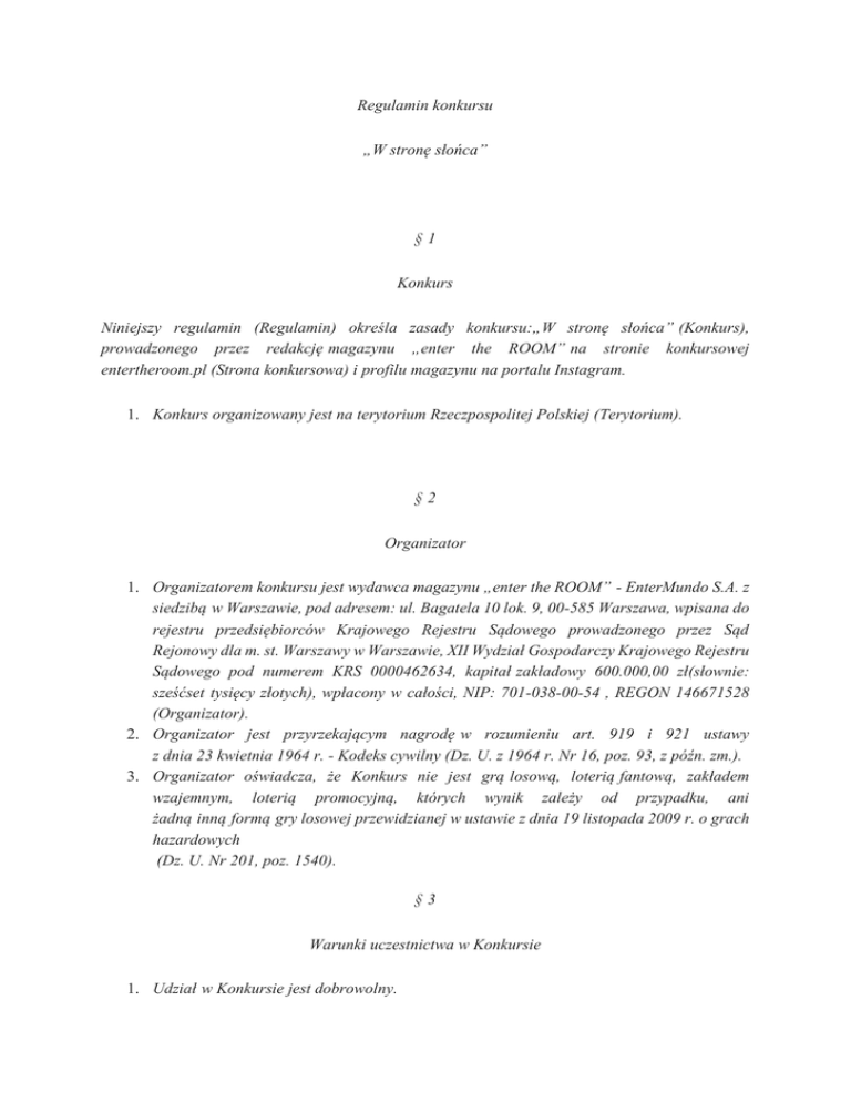 Regulamin konkursu „W stronę słońca” §1 Konkurs Niniejszy regulamin (Regulamin) określa zasady konkursu:„W stronę słońca” (Konkurs), prowadzonego przez redakcję magazynu „enter the ROOM” na stronie konkursowej entertheroom.pl (Strona konkursowa) i profilu magazynu na portalu Instagram. 1. Konkurs organizowany jest na terytorium Rzeczpospolitej Polskiej (Terytorium). §2 Organizator 1. Organizatorem konkursu jest wydawca magazynu „enter the ROOM” - EnterMundo S.A. z siedzibą w Warszawie, pod adresem: ul. Bagatela 10 lok. 9, 00-585 Warszawa, wpisana do rejestru przedsiębiorców Krajowego Rejestru Sądowego prowadzonego przez Sąd Rejonowy dla m. st. Warszawy w Warszawie, XII Wydział Gospodarczy Krajowego Rejestru Sądowego pod numerem KRS 0000462634, kapitał zakładowy 600.000,00 zł(słownie: sześćset tysięcy złotych), wpłacony w całości, NIP: 701-038-00-54 , REGON 146671528 (Organizator). 2. Organizator jest przyrzekającym nagrodę w rozumieniu art. 919 i 921 ustawy z dnia 23 kwietnia 1964 r. - Kodeks cywilny (Dz. U. z 1964 r. Nr 16, poz. 93, z późn. zm.). 3. Organizator oświadcza, że Konkurs nie jest grą losową, loterią fantową, zakładem wzajemnym, loterią promocyjną, których wynik zależy od przypadku, ani żadną inną formą gry losowej przewidzianej w ustawie z dnia 19 listopada 2009 r. o grach hazardowych (Dz. U. Nr 201, poz. 1540). §3 Warunki uczestnictwa w Konkursie 1. Udział w Konkursie jest dobrowolny. 2. W Konkursie mogą brać udział wszystkie pełnoletnie osoby fizyczne mające stałe miejsce zamieszkania na Terytorium. 3. W Konkursie nie mogą brać udziału pracownicy lub współpracownicy Organizatora oraz innych podmiotów biorących bezpośredni udział w przygotowaniu i prowadzeniu Konkursu na zlecenie Organizatora, a także członkowie najbliższych rodzin tych osób. Przez członków najbliższej rodziny należy rozumieć: rodzeństwo, małżonków, małżonków rodzeństwa, rodziców, krewnych i powinowatych drugiego stopnia oraz osoby pozostające w stosunku przysposobienia. 4. Organizator zastrzega sobie prawo do wykluczenia z udziału w Konkursie: 1. osoby prowadzącej działania, co do których zajdzie uzasadnione przypuszczenie, że mogą one prowadzić do prób obejścia Regulaminu, ingerują w mechanizm funkcjonalności Strony konkursowej lub w inny sposób dążą do przełamania zabezpieczeń lub zasad przeprowadzania Konkursu, 2. osoby prowadzącej działania naruszające uzasadnione interesy Organizatora lub godzą w jego wizerunek, 3. osoby, która przystępując do Konkursu narusza prawa własności intelektualnej lub prawa osobiste innych osób, 4. osoby, która w związku z udziałem w Konkursie podejmuje działania sprzeczne z prawem, sprzeczne z zasadami współżycia społecznego, uznane powszechnie za naganne moralnie oraz społecznie niewłaściwe. 5. Osoba, która przystąpiła do Konkursu zgodnie z Regulaminem, staje się uczestnikiem Konkursu (Uczestnik). §4 Czas trwania Konkursu Konkurs trwa od 11 kwietnia 2016 r. (od godziny 9.00 ) do 14 kwietnia 2016 r. włącznie (do godziny 10:00). §5 Przebieg Konkursu Przystąpienie do Konkursu następuje poprzez: Zamieszczenie na swoim otwartym profilu na Instagramie zdjęcia w dowolnej technice zainspirowanego wiosną i pierwszymi promieniami słońca oznaczonego: #enterthesunnyroom, @california_skateshop oraz @entertheroom Zadanie konkursowe zostanie umieszczone na profilu Organizatora na Instagramie i stronie konkursowej wskazanym w § 1 w chwili rozpoczęcia Konkursu zgodnie z § 4. 1. Uczestnik może tylko jednokrotnie przystąpić do Konkursu. §6 Zobowiązania Uczestnika 1. Poprzez przystąpienie do Konkursu Uczestnik akceptuje treść Regulaminu. 2. Poprzez przystąpienie do Konkursu Uczestnik zgadza na przetwarzanie jego danych osobowych przez Organizatora na zasadach opisanych w Regulaminie. 3. Poprzez przystąpienie do Konkursu Uczestnik zgadza się na podanie danych osobowych Uczestnika (imię i nazwisko, miejsce zamieszkania – miejscowość), na Stronie konkursowej raz w innych kanałach społecznościowych Organizatora przez nieograniczony okres czasu, w celu związanym z Konkursem. 4. Uczestnik zobowiązuje się, że w przypadku skierowania przeciwko Organizatorowi jakichkolwiek roszczeń związanych z uczestnictwem Uczestnika w Konkursie zwolni Organizatora z odpowiedzialności, przyjmując na siebie realizację roszczeń oraz prowadzenie sporu. §7 Wyłonienie i ogłoszenie Zwycięzcy 1. Zwycięzcami Konkursu będzie trzech Uczestników, których zdjęcia zdaniem jury będą najciekawsze. 2. Wyłonienie Zwycięzców nastąpi 15 kwietnia 2016 r. 3. Wyłonienia Zwycięzcy dokona jury Konkursu w składzie: Magdalena Olszewska (Organizator), Paulina Klepacz (Organizator), Aleksandra Nowak (Organizator) (dalej: Jury). 4. Decyzja Jury ma charakter ostateczny. 5. Po wyłonieniu Zwycięzców, w ciągu trzech dni roboczych, Organizator skontaktuje się ze Zwycięzcą przez portal Instagram. Brak możliwości kontaktu ze Zwycięzcą w terminie 3 dni roboczych od momentu wyłonienia Zwycięzców lub brak możliwości odbioru przez Zwycięzcy Nagrody spowoduje, że Uczestnik straci status Zwycięzcy a Jury skontaktuje się z Uczestnikiem wyłonionym jako Zwycięzca w dalszej kolejności. 6. W przypadku niewyłonienia Zwycięzcy na zasadach określonych w Regulaminie, Nagroda pozostanie własnością Organizatora. 7. Ogłoszenie Zwycięzcy nastąpi poprzez indywidualny kontakt ze Zwycięzcami. §8 Nagroda 1. Pierwszy Zwycięzca otrzyma okulary przeciwsłoneczne marki Emerica, model zgodny ze wzorem promocyjnym 2. Drugi Zwycięzca otrzyma okulary przeciwsłoneczne marki Emerica, model zgodny ze wzorem promocyjnym 3. Trzeci Zwycięzca otrzyma okulary przeciwsłoneczne marki Emerica, model zgodny ze wzorem promocyjnym 4. Organizator nie ponosi odpowiedzialności za brak możliwości przekazania lub odbioru Nagrody z przyczyn leżących po stronie 