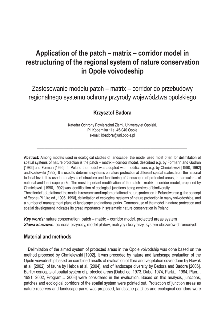 Application of the patch – matrix – corridor model in restructuring of the regional system of nature conservation in Opole voivodeship Zastosowanie modelu patch – matrix – corridor do przebudowy regionalnego systemu ochrony przyrody województwa opolskiego Krzysztof Badora Katedra Ochrony Powierzchni Ziemi, Uniwersytet Opolski, Pl. Kopernika 11a, 45-040 Opole e-mail: [email protected] ______________________________________________________________________________ Abstract: Among models used in ecological studies of landscape, the model used most often for delimitation of spatial systems of nature protection is the patch – matrix – corridor model, described e.g. by Formann and Godron [1986] and Forman [1995]. In Poland the model was adopted with modifications e.g. by Chmielewski [1990, 1992] and Kozłowski [1992]. It is used to determine systems of nature protection at different spatial scales, from the national to local level. It is used in analyses of structure and functioning of landscapes of protected areas, in particular – of national and landscape parks. The most important modification of the patch – matrix – corridor model, proposed by Chmielewski [1990, 1992] was identification of ecological junctions being centres of biodiversity. The effect of adaptation of the model in research and implementation of nature protection in Poland were e.g. the concept of Econet-Pl [Liro ed., 1995, 1998], delimitation of ecological systems of nature protection in many voivodeships, and a number of management plans of landscape and national parks. Common use of the model in nature protection and spatial development indicates its great importance in systematic nature conservation in Poland. Key words: nature conservation, patch – matrix – corridor model, protected areas system Słowa kluczowe: ochrona przyrody, model płatów, matrycy i korytarzy, system obszarów chronionych Material and methods Delimitation of the aimed system of protected areas in the Opole voivodship was done based on the method proposed by Chmielewski [1992]. It was preceded by nature and landscape evaluation of the Opole voivodeship based on combined results of evaluation of flora and vegetation cover done by Nowak et al. [2002], of fauna by Hebda et al. [2004], and of landscape diversity by Badora and Badora [2006]. Earlier concepts of spatial system of protected areas [Dubel ed. 1973, Dubel 1974, Parki… 1984, Plan… 1991, 2002, Program… 2003] were considered in the evaluation. Based on this analysis, junctions, patches and ecological corridors of the spatial system were pointed out. Protection of junction areas as nature reserves and landscape parks was proposed, landscape patches and ecological corridors were 234 Badora K. designated as areas of protected landscape. The basis of the delimitation of the system was to achieve spatial connectivity of elements covered with protection. Results Spatial arrangement of elements of the aimed system of protected areas in the Opole voivodeship designed according to the patch – matrix – corridor model is presented at figure 1. In table 1 main elements of the system are listed. It includes in total 35 existing and 20 designated nature reserves, one existing and five designated Natura 2000 sites, three current and two designated national parks, 7 existing and 22 designated areas of protected landscape. Fig. 1. Aimed system of protected areas of the Opole voivodeship. Source: author. Application of the patch – matrix – corridor model... 235 Tab. 1. Elements of the system of protected areas of the Opole voivodeship. Inventory Junction elements: - nature reserves - designated nature reserves - Natura 2000 sites - designated Natura 2000 sites - landscape parks - designated landscape parks Patchy elements: - areas of protected landscape - designated areas of protected landscape Ecological corridors: - designated areas of protected landscape Name of site covered with or designated for protection Bażany, Biesiec, Blok, Boże Oko, Cicha Dolina, Dębina, Góra Gipsowa, Góra Św. Anny, Grafik, Jaśkowice, Jeleni Dwór, Kamieniec, Kamień Śląski, Kokorycz, Komorno, Krzywiczyny, Las Bukowy, Lesisko, Leśna Woda, Ligota Dolna, Lubsza, Nad Białką, Płużnica, Prądy, Przylesie, Przyłęk, Przysiecz, Rogalice, Rozumice, Smolnik, Srebrne Źródło, Staw Nowokuźnicki, Śmiechowice, Tęczynów, Złote Bagna Barucice, Brzyniczka, Czapliniec, Góra Szpica, Gwarkowa Perć, Krasiejów, Ligota Dolna, Mała Panew, Nadziejów, Nowy Dwór, Otmuchowskie Błota, Pielgrzymów, Sławniowice, Stawy Niemodlińskie, Stawy Tułowickie, Topiel, Ujście Libawy, Wąwozy Biechowskie, Wilczy Staw, Wilemowice Grądy Odrzańskie Forty Nyskie, Góra św. Anny, Góry Opawskie, Kamień Śląski, Ostoja BurgrabickoSławniowicka Góra św. Anny, Góry Opawskie, Stobrawski Dolina Małej Panwi, Stawy Niemodlińskie i Tułowickie Bory Niemodlińskie, Las Głubczycki, Lasy Stobrawsko-Turawskie, Łęg Zdzieszowicki, Otmuchowsko-Nyski, Rejon Wronin – Maciowakrze, Rejon Mokre –Lewice Bory Kędzierzyńsko-Kozielskie, Wzniesienia Kozłowicko-Jaworzniańskie Dolina Białej, Dolina Cielnicy, Dolina Grodkowskiej Strugi, Dolina Liswarty i Łomnicy, Dolina Nysy Kłodzkiej, Dolina Opawicy, Dolina Osobłogi, Dolina Potoku Cisek, Dolina Pratwy, Dolina Prosny, Dolina Prudnika, Dolina Przyleskiego Potoku, Dolina Psiny, Dolina Starej Strugi, Dolina Straduni, Dolina Ścinawy Niemodlińskiej, Dolina Świdnej, Dolina Troi, Dolina Widawy, Dolina Wołczyńskiej Strugi Source: author. The most important of new junction elements are designated nature reserves, landscape parks and Natura 2000 sites. New patchy elements consist of two designated areas of protected landscape, and ecological corridors include twenty further areas of protected landscape. Discussion Typical features of the existing network of protected areas of the Opole voivodeship are: a lack of spatial connectivity between large-scale forms of nature p
