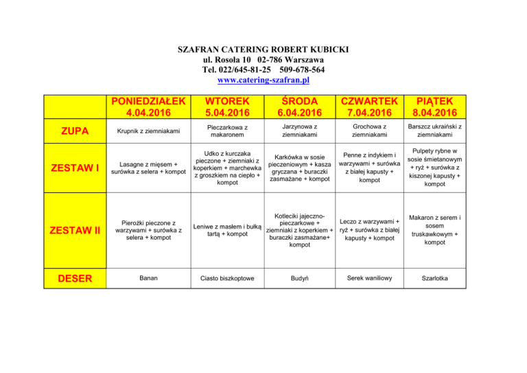 SZAFRAN CATERING ROBERT KUBICKI ul. Rosoła 10 02-786 Warszawa Tel. 022/645-81-25 509-678-564 www.catering-szafran.pl PONIEDZIAŁEK 4.04.2016 WTOREK 5.04.2016 ŚRODA 6.04.2016 CZWARTEK 7.04.2016 PIĄTEK 8.04.2016 Krupnik z ziemniakami Pieczarkowa z makaronem Jarzynowa z ziemniakami Grochowa z ziemniakami Barszcz ukraiński z ziemniakami ZESTAW I Lasagne z mięsem + surówka z selera + kompot Udko z kurczaka pieczone + ziemniaki z koperkiem + marchewka z groszkiem na ciepło + kompot Karkówka w sosie pieczeniowym + kasza gryczana + buraczki zasmażane + kompot Penne z indykiem i warzywami + surówka z białej kapusty + kompot Pulpety rybne w sosie śmietanowym + ryż + surówka z kiszonej kapusty + kompot ZESTAW II Pierożki pieczone z warzywami + surówka z selera + kompot Leczo z warzywami + ryż + surówka z białej kapusty + kompot Makaron z serem i sosem truskawkowym + kompot DESER Banan Serek waniliowy Szarlotka ZUPA Kotleciki jajecznopieczarkowe + Leniwe z masłem i bułką ziemniaki z koperkiem + tartą + kompot buraczki zasmażane+ kompot Ciasto biszkoptowe Budyń SZAFRAN CATERING ROBERT KUBICKI ul. Rosoła 10 02-786 Warszawa Tel. 022/645-81-25 509-678-564 www.catering-szafran.pl PONIEDZIAŁEK 11.04.2016 WTOREK 12.04.2016 ŚRODA 13.04.2016 CZWARTEK 14.04.2016 PIĄTEK 15.04.2016 Barszcz biały z jajkiem i ziemniakami Krem z dyni z grzankami Z fasolki szparagowej z ziemniakami Koperkowa z ziemniakami Pomidorowa z makaronem ZESTAW I Pizza z szynką i serem + kompot Filet z indyka grillowany z sosem jogurtowoziołowym + ziemniaki z koperkiem + marchewka baby na ciepło + kompot Potrawka z kurczaka + ryż + surówka coleslaw + kompot Mintaj duszony z warzywami + ziemniaki z koperkiem + surówka z kiszonej kapusty + kompot ZESTAW II Naleśniki z serem i jogurtem naturalnym + kompot Risotto z warzywami + surówka z marchwi i jabłka + kompot DESER Sałatka owocowa Gruszka ZUPA Gulasz wołowy + kopytka + surówka z ogórka kiszonego + kompot Kotlet warzywny + Farfalle z sosem ziemniaki z koperkiem + pomidorowym i serem surówka z ogórka + kompot kiszonego + kompot Ciasto „zebra” Kisiel z jabłkiem Ryż z jabłkiem i cynamonem + kompot Mandarynka SZAFRAN CATERING ROBERT KUBICKI ul. Rosoła 10 02-786 Warszawa Tel. 022/645-81-25 509-678-564 www.catering-szafran.pl PONIEDZIAŁEK 18.04.2016 WTOREK 19.04.2016 ŚRODA 20.04.2016 CZWARTEK 21.04.2016 PIĄTEK 22.04.2016 ZUPA Marchewkowa z ziemniakami Ogórkowa z ziemniakami Rosół z makaronem Szczawiowa z jajkiem i ziemniakami Ryżanka z warzywami ZESTAW I Bitka wieprzowa w sosie własnym + kasza gryczana + buraczki zasmażane + kompot Spaghetti bolognese + kompot Filet z kurczaka Kurczak w sosie panierowany + ziemniaki z koperkiem + słodko-kwaśnym + ryż surówka z marchwi i + surówka coleslaw + jabłka + bukiet warzyw kompot na ciepło + kompot ZESTAW II Gołąbki jarskie + ziemniaki z koperkiem + surówka z buraczków + kompot Kotlet ziemniaczany z sosem pieczarkowym + surówka z marchwi i jabłka + kompot Makaron z karmelizowaną dynią i białym serem + kompot Placki z cukinii + surówka coleslaw + kompot Naleśniki z jabłkiem i jogurtem naturalnym + kompot DESER Jogurt owocowy Ciasto drożdżowe Galaretka Winogrona Pomarańcza Ryba pieczona + ziemniaki z koperkiem + surówka z kiszonej kapusty + kompot SZAFRAN CATERING ROBERT KUBICKI ul. Rosoła 10 02-786 Warszawa Tel. 022/645-81-25 509-678-564 www.catering-szafran.pl ZUPA PONIEDZIAŁEK 25.04.2016 WTOREK 26.04.2016 ŚRODA 27.04.2016 CZWARTEK 28.04.2016 PIĄTEK 29.04.2016 Z brukselki z ziemniakami Barszcz czerwony z ziemniakami Pieczarkowa z makaronem Kalafiorowa z ziemniakami Pomidorowa z makaronem Roladka drobiowa faszerowana Indyk duszony z Kotlet mielony + warzywami w sosie warzywami + ryż + ziemniaki z koperkiem + pieczeniowym + kluski surówka z białej kapusty fasolka szparagowa na śląskie + surówka z + kompot ciepło + kompot czerwonej kapusty + kompot ZESTAW I Pieczeń wieprzowa w sosie własnym + kasza jęczmienna + buraczki zasmażane + kompot ZESTAW II Krokiety z kapustą i Spaghetti z sosem Kotlet jajeczny + ziemniaki z Pierogi ruskie + fasolka pieczarkami + surówka z koperkiem + surówka z szparagowa na ciepło + pomidorowym i ziołami marchwi i jabłka + buraczków + kompot kompot + kompot kompot DESER Budyń Kiwi Drożdżówka z owocami Banan Dorsz panierowany + ziemniaki z koperkiem + surówka z kiszonej kapusty + kompot Racuchy z brzoskwinią + kompot Sernik