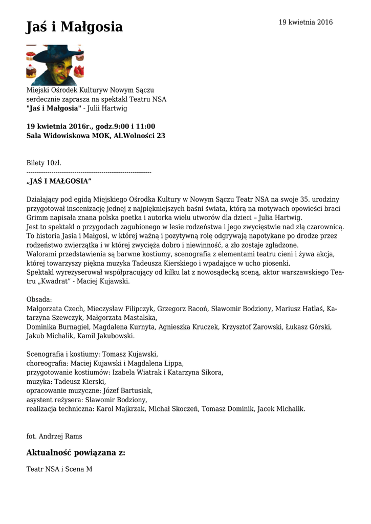 Jaś i Małgosia 19 kwietnia 2016 Miejski Ośrodek Kulturyw Nowym Sączu serdecznie zaprasza na spektakl Teatru NSA "Jaś i Małgosia" - Julii Hartwig 19 kwietnia 2016r., godz.9:00 i 11:00 Sala Widowiskowa MOK, Al.Wolności 23 Bilety 10zł. -----------------------------------------------------------„JAŚ I MAŁGOSIA” Działający pod egidą Miejskiego Ośrodka Kultury w Nowym Sączu Teatr NSA na swoje 35. urodziny przygotował inscenizację jednej z najpiękniejszych baśni świata, którą na motywach opowieści braci Grimm napisała znana polska poetka i autorka wielu utworów dla dzieci – Julia Hartwig. Jest to spektakl o przygodach zagubionego w lesie rodzeństwa i jego zwycięstwie nad złą czarownicą. To historia Jasia i Małgosi, w której ważną i pozytywną rolę odgrywają napotykane po drodze przez rodzeństwo zwierzątka i w której zwycięża dobro i niewinność, a zło zostaje zgładzone. Walorami przedstawienia są barwne kostiumy, scenografia z elementami teatru cieni i żywa akcja, której towarzyszy piękna muzyka Tadeusza Kierskiego i wpadające w ucho piosenki. Spektakl wyreżyserował współpracujący od kilku lat z nowosądecką sceną, aktor warszawskiego Teatru „Kwadrat” - Maciej Kujawski. Obsada: Małgorzata Czech, Mieczysław Filipczyk, Grzegorz Racoń, Sławomir Bodziony, Mariusz Hatlaś, Katarzyna Szewczyk, Małgorzata Mastalska, Dominika Burnagiel, Magdalena Kurnyta, Agnieszka Kruczek, Krzysztof Żarowski, Łukasz Górski, Jakub Michalik, Kamil Jakubowski. Scenografia i kostiumy: Tomasz Kujawski, choreografia: Maciej Kujawski i Magdalena Lippa, przygotowanie kostiumów: Izabela Wiatrak i Katarzyna Sikora, muzyka: Tadeusz Kierski, opracowanie muzyczne: Józef Bartusiak, asystent reżysera: Sławomir Bodziony, realizacja techniczna: Karol Majkrzak, Michał Skoczeń, Tomasz Dominik, Jacek Michalik. fot. Andrzej Rams Aktualność powiązana z: Teatr NSA i Scena M Galeria zdjęć