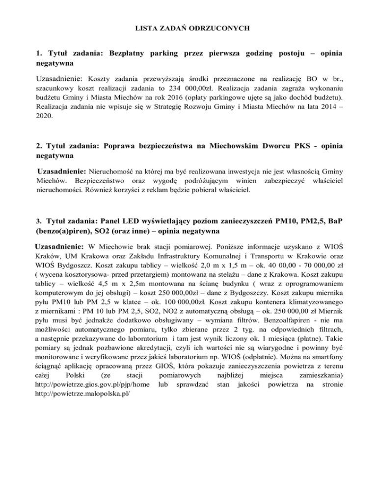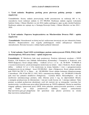 LISTA ZADAŃ ODRZUCONYCH 1. Tytuł zadania: Bezpłatny parking przez pierwsza godzinę postoju – opinia negatywna Uzasadnienie: Koszty zadania przewyższają środki przeznaczone na realizację BO w br., szacunkowy koszt realizacji zadania to 234 000,00zł. Realizacja zadania zagraża wykonaniu budżetu Gminy i Miasta Miechów na rok 2016 (opłaty parkingowe ujęte są jako dochód budżetu). Realizacja zadania nie wpisuje się w Strategię Rozwoju Gminy i Miasta Miechów na lata 2014 – 2020. 2. Tytuł zadania: Poprawa bezpieczeństwa na Miechowskim Dworcu PKS - opinia negatywna Uzasadnienie: Nieruchomość na której ma być realizowana inwestycja nie jest własnością Gminy Miechów. Bezpieczeństwo oraz wygodę podróżującym winien nieruchomości. Również korzyści z reklam będzie pobierał właściciel. zabezpieczyć właściciel 3. Tytuł zadania: Panel LED wyświetlający poziom zanieczyszczeń PM10, PM2,5, BaP (benzo(a)piren), SO2 (oraz inne) – opinia negatywna Uzasadnienie: W Miechowie brak stacji pomiarowej. Poniższe informacje uzyskano z WIOŚ Kraków, UM Krakowa oraz Zakładu Infrastruktury Komunalnej i Transportu w Krakowie oraz WIOŚ Bydgoszcz. Koszt zakupu tablicy – wielkość 2,0 m x 1,5 m – ok. 40 00,00 - 70 000,00 zł ( wycena kosztorysowa- przed przetargiem) montowana na stelażu – dane z Krakowa. Koszt zakupu tablicy – wielkość 4,5 m x 2,5m montowana na ścianę budynku ( wraz z oprogramowaniem komputerowym do jej obsługi) – koszt 250 000,00zł – dane z Bydgoszczy. Koszt zakupu miernika pyłu PM10 lub PM 2,5 w klatce – ok. 100 000,00zł. Koszt zakupu kontenera klimatyzowanego z miernikami : PM 10 lub PM 2,5, SO2, NO2 z automatyczną obsługą – ok. 250 000,00 zł Miernik pyłu musi być jednakże dodatkowo obsługiwany – wymiana filtrów. Benzoalfapiren - nie ma możliwości automatycznego pomiaru, tylko zbierane przez 2 tyg. na odpowiednich filtrach, a następnie przekazywane do laboratorium i tam jest wynik liczony ok. 1 miesiąca (płatne). Takie pomiary są jednak pozbawione akredytacji, czyli ich wartości nie są wiarygodne i powinny być monitorowane i weryfikowane przez jakieś laboratorium np. WIOŚ (odpłatnie). Można na smartfony ściągnąć aplikację opracowaną przez GIOŚ, która pokazuje zanieczyszczenia powietrza z terenu całej Polski (ze stacji pomiarowych najbliżej miejsca zamieszkania) http://powietrze.gios.gov.pl/pjp/home lub sprawdzać stan jakości powietrza na stronie http://powietrze.malopolska.pl/
