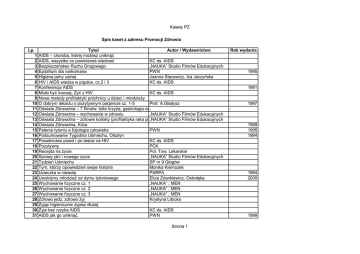 Kasety PZ Spis kaset z zakresu Promocji Zdrowia Lp. 1 2 3 4 5 6 7 8 9 10 11 12 13 14 15 16 17 18 19 20 21 22 23 24 25 26 27 28 29 30 31 Tytuł Autor / Wydawnictwo Rok wydania AIDS – choroba, której moŜesz uniknąć AIDS, wszystko co powinieneś wiedzieć KC ds. AIDS Bezpieczeństwo Ruchu Drogowego „NAUKA” Studio Filmów Edukacyjnych Epitafium dla narkomana PWN 1995 Higiena jamy ustnej Joanna Stacewicz, Iza Jaczyńska HIV i AIDS wiedza w pigułce, cz.2 i 3 KC ds. AIDS Konferencja AIDS 1991 Miało być inaczej; śyć z HIV KC ds. AIDS Nowe metody profilaktyki próchnicy u dzieci i młodzieŜy O dobrym lekarzu o pozytywnym pacjencie cz. 1-5 Prof. A.Gładysz 1997 Oświata Zdrowotna – 7 filmów: bóle krzyŜa, gastrologia na-wesoło, zdrowa woda, chemia w zagrodzie, - witaminki, myj zeby, mydło. Oświata Zdrowotna – wychowanie w zdrowiu „NAUKA” Studio Filmów Edukacyjnych Oświata Zdrowotna – zdrowie kobiety (profilaktyka raka piersi „NAUKA” i szyjkiStudio macicy) Filmów Edukacyjnych Oświata Zdrowotna, Kilce 1989 Palenie tytoniu a fizjologia człowieka PWN 1995 Podsumowanie Tygodnia Uśmiechu, Olsztyn 1994 Poradnictwo przed i po teście na HIV KC ds. AIDS Pozytywny PCK Recepta na Ŝycie Pol. Tow. Lekarskie Sprawy płci i nowego zycia „NAUKA” Studio Filmów Edukacyjnych Tydzień Uśmiechu SP nr 9 Głogów Tym, którzy opowiedzieli swoje historie Monika Kiernozek Ucieczka w niewolę PARPA 1994 Uwolnijmy młodzieŜ od dymu tytoniowego Eliza Zdankiewicz, Ostrołęka 2000 Wychowanie fizyczne cz. 1 „NAUKA” ; MEN Wychowanie fizyczne cz. 2 „NAUKA” ; MEN Wychowanie fizyczne cz. 3 „NAUKA” ; MEN Zdrowo jedz, zdrowo Ŝyj Krystyna Libicka śyjąc higienicznie Ŝyjesz dłuŜej śyje bez ryzyka AIDS KC ds. AIDS AIDS jak go uniknąć. PWN 1999 Strona 1 Kasety PZ 32 Światowy Dzień AIDS Apel poświęcony problematyce AIDS przygotowane 33 przez członków koła PCK 34 Pomagamy potrzebującym- bądź z nami 35 Ekskluzywne ekstrakty z zielonej herbaty 36 Lekcja w Turku i w Toruniu Łódź. 1.12. 2002 Joanna Śliwiak- Ostrowiec Strona 2