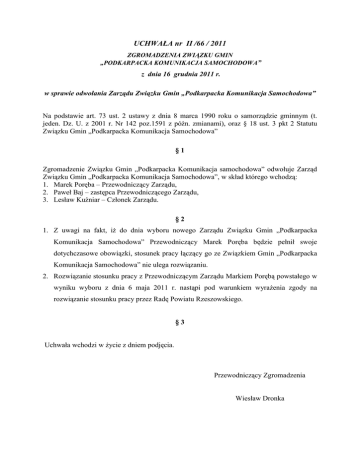 UCHWAŁA nr II /66 / 2011 ZGROMADZENIA ZWIĄZKU GMIN „PODKARPACKA KOMUNIKACJA SAMOCHODOWA” z dnia 16 grudnia 2011 r. w sprawie odwołania Zarządu Związku Gmin „Podkarpacka Komunikacja Samochodowa” Na podstawie art. 73 ust. 2 ustawy z dnia 8 marca 1990 roku o samorządzie gminnym (t. jeden. Dz. U. z 2001 r. Nr 142 poz.1591 z późn. zmianami), oraz § 18 ust. 3 pkt 2 Statutu Związku Gmin „Podkarpacka Komunikacja Samochodowa” §1 Zgromadzenie Związku Gmin „Podkarpacka Komunikacja samochodowa” odwołuje Zarząd Związku Gmin „Podkarpacka Komunikacja Samochodowa”, w skład którego wchodzą: 1. Marek Poręba – Przewodniczący Zarządu, 2. Paweł Baj – zastępca Przewodniczącego Zarządu, 3. Lesław Kuźniar – Członek Zarządu. §2 1. Z uwagi na fakt, iż do dnia wyboru nowego Zarządu Związku Gmin „Podkarpacka Komunikacja Samochodowa” Przewodniczący Marek Poręba będzie pełnił swoje dotychczasowe obowiązki, stosunek pracy łączący go ze Związkiem Gmin „Podkarpacka Komunikacja Samochodowa” nie ulega rozwiązaniu. 2. Rozwiązanie stosunku pracy z Przewodniczącym Zarządu Markiem Porębą powstałego w wyniku wyboru z dnia 6 maja 2011 r. nastąpi pod warunkiem wyrażenia zgody na rozwiązanie stosunku pracy przez Radę Powiatu Rzeszowskiego. §3 Uchwała wchodzi w życie z dniem podjęcia. Przewodniczący Zgromadzenia Wiesław Dronka