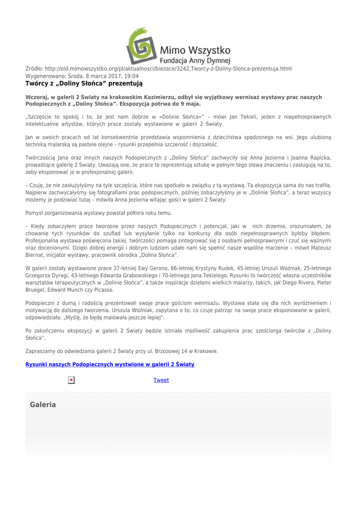 Źródło: http://old.mimowszystko.org/pl/aktualnosci/biezace/3242,Tworcy-z-Doliny-Slonca-prezentuja.html Wygenerowano: Środa, 8 marca 2017, 19:04 Twórcy z „Doliny Słońca” prezentują Wczoraj, w galerii 2 Światy na krakowskim Kazimierzu, odbył się wyjątkowy wernisaż wystawy prac naszych Podopiecznych z „Doliny Słońca”. Ekspozycja potrwa do 9 maja. „Szczęście to spokój i to, że jest nam dobrze w »Dolinie Słońca«” – mówi Jan Tekieli, jeden z niepełnosprawnych intelektualnie artystów, których prace zostały wystawione w galerii 2 Światy. Jan w swoich pracach od lat konsekwentnie przedstawia wspomnienia z dzieciństwa spędzonego na wsi. Jego ulubioną techniką malarską są pastele olejne – rysunki przepełnia szczerość i dojrzałość. Twórczością Jana oraz innych naszych Podopiecznych z „Doliny Słońca” zachwyciły się Anna Jeziorna i Joanna Rapicka, prowadzące galerię 2 Światy. Uważają one, że prace te reprezentują sztukę w pełnym tego słowa znaczeniu i zasługują na to, żeby eksponować je w profesjonalnej galerii. – Czuję, że nie zasłużyłyśmy na tyle szczęścia, które nas spotkało w związku z tą wystawą. Ta ekspozycja sama do nas trafiła. Najpierw zachwycałyśmy się fotografiami prac podopiecznych, później zobaczyłyśmy je w „Dolinie Słońca”, a teraz wszyscy możemy je podziwiać tutaj – mówiła Anna Jeziorna witając gości w galerii 2 Światy. Pomysł zorganizowania wystawy powstał półtora roku temu. – Kiedy zobaczyłem prace tworzone przez naszych Podopiecznych i potencjał, jaki w nich drzemie, zrozumiałem, że chowanie tych rysunków do szuflad lub wysyłanie tylko na konkursy dla osób niepełnosprawnych byłoby błędem. Profesjonalna wystawa poświęcona takiej twórczości pomaga zintegrować się z osobami pełnosprawnymi i czuć się ważnymi oraz docenionymi. Dzięki dobrej energii i dobrym ludziom udało nam się spełnić nasze wspólne marzenie – mówił Mateusz Biernat, inicjator wystawy, pracownik ośrodka „Dolina Słońca”. W galerii zostały wystawione prace 37-letniej Ewy Gerono, 66-letniej Krystyny Rudek, 45-letniej Urszuli Woźniak, 25-letniego Grzegorza Dyragi, 43-letniego Edwarda Grabowskiego i 70-letniego Jana Tekielego. Rysunki to twórczość własna uczestników warsztatów terapeutycznych w „Dolinie Słońca”, a także inspiracje dziełami wielkich malarzy, takich, jak Diego Rivera, Pieter Bruegel, Edward Munch czy Picasso. Podopieczni z dumą i radością prezentowali swoje prace gościom wernisażu. Wystawa stała się dla nich wyróżnieniem i motywacją do dalszego tworzenia. Urszula Woźniak, zapytana o to, co czuje patrząc na swoje prace eksponowane w galerii, odpowiedziała: „Myślę, że będę malowała jeszcze lepiej”. Po zakończeniu ekspozycji w galerii 2 Światy będzie istniała możliwość zakupienia prac sześciorga twórców z „Doliny Słońca”. Zapraszamy do odwiedzania galerii 2 Światy przy ul. Brzozowej 14 w Krakowie. Rysunki naszych Podopiecznych wystwione w galerii 2 Światy Tweet Galeria Podziel się: