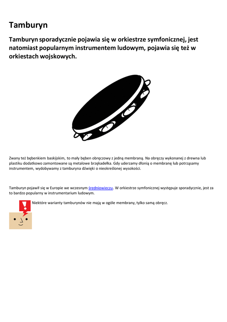 Tamburyn Tamburyn sporadycznie pojawia się w orkiestrze symfonicznej, jest natomiast popularnym instrumentem ludowym, pojawia się też w orkiestach wojskowych. Zwany też bębenkiem baskijskim, to mały bęben obręczowy z jedną membraną. Na obręczy wykonanej z drewna lub plastiku dodatkowo zamontowane są metalowe brzękadełka. Gdy uderzamy dłonią o membranę lub potrząsamy instrumentem, wydobywamy z tamburyna dźwięki o nieokreślonej wysokości. Tamburyn pojawił się w Europie we wczesnym średniowieczu. W orkiestrze symfonicznej występuje sporadycznie, jest za to bardzo popularny w instrumentarium ludowym. Niektóre warianty tamburynów nie mają w ogóle membrany, tylko samą obręcz.