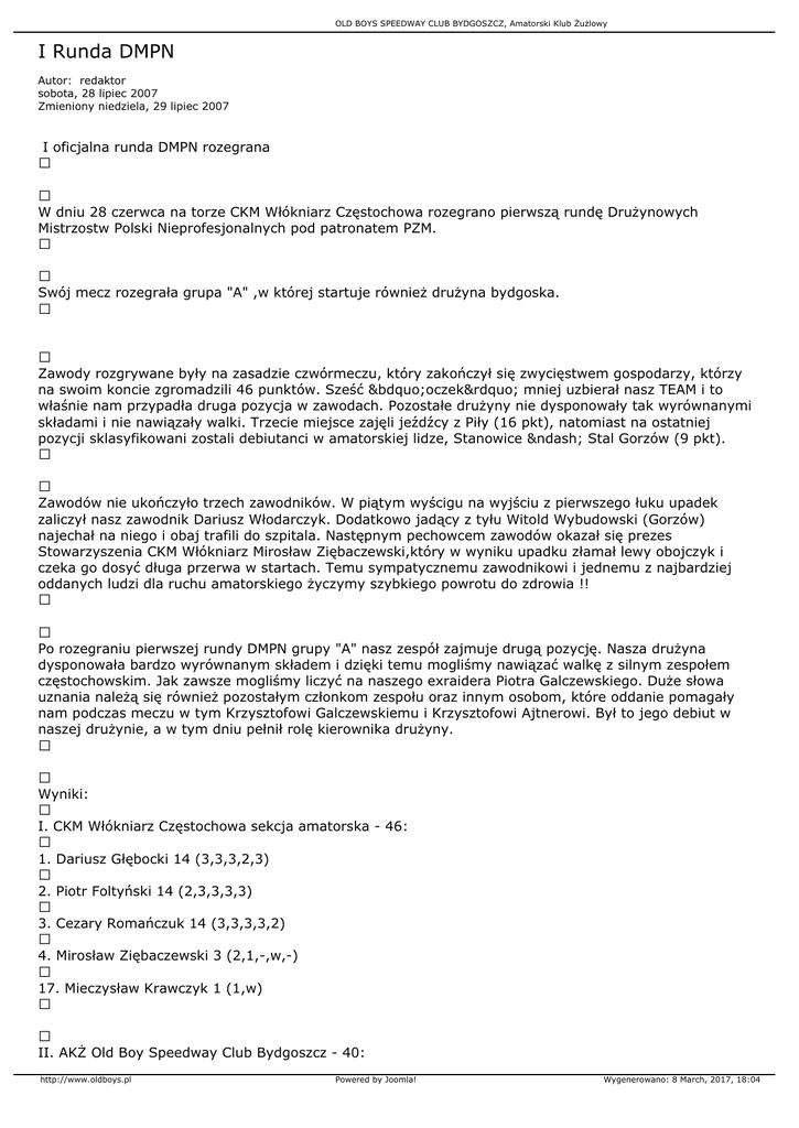 OLD BOYS SPEEDWAY CLUB BYDGOSZCZ, Amatorski Klub Żużlowy I Runda DMPN Autor: redaktor sobota, 28 lipiec 2007 Zmieniony niedziela, 29 lipiec 2007 I oficjalna runda DMPN rozegrana W dniu 28 czerwca na torze CKM Włókniarz Częstochowa rozegrano pierwszą rundę Drużynowych Mistrzostw Polski Nieprofesjonalnych pod patronatem PZM. Swój mecz rozegrała grupa "A" ,w której startuje również drużyna bydgoska. Zawody rozgrywane były na zasadzie czwórmeczu, który zakończył się zwycięstwem gospodarzy, którzy na swoim koncie zgromadzili 46 punktów. Sześć „oczek” mniej uzbierał nasz TEAM i to właśnie nam przypadła druga pozycja w zawodach. Pozostałe drużyny nie dysponowały tak wyrównanymi składami i nie nawiązały walki. Trzecie miejsce zajęli jeźdźcy z Piły (16 pkt), natomiast na ostatniej pozycji sklasyfikowani zostali debiutanci w amatorskiej lidze, Stanowice – Stal Gorzów (9 pkt). Zawodów nie ukończyło trzech zawodników. W piątym wyścigu na wyjściu z pierwszego łuku upadek zaliczył nasz zawodnik Dariusz Włodarczyk. Dodatkowo jadący z tyłu Witold Wybudowski (Gorzów) najechał na niego i obaj trafili do szpitala. Następnym pechowcem zawodów okazał się prezes Stowarzyszenia CKM Włókniarz Mirosław Ziębaczewski,który w wyniku upadku złamał lewy obojczyk i czeka go dosyć długa przerwa w startach. Temu sympatycznemu zawodnikowi i jednemu z najbardziej oddanych ludzi dla ruchu amatorskiego życzymy szybkiego powrotu do zdrowia !! Po rozegraniu pierwszej rundy DMPN grupy "A" nasz zespół zajmuje drugą pozycję. Nasza drużyna dysponowała bardzo wyrównanym składem i dzięki temu mogliśmy nawiązać walkę z silnym zespołem częstochowskim. Jak zawsze mogliśmy liczyć na naszego exraidera Piotra Galczewskiego. Duże słowa uznania należą się również pozostałym członkom zespołu oraz innym osobom, które oddanie pomagały nam podczas meczu w tym Krzysztofowi Galczewskiemu i Krzysztofowi Ajtnerowi. Był to jego debiut w naszej drużynie, a w tym dniu pełnił rolę kierownika drużyny. Wyniki: I. CKM Włókniarz Częstochowa sekcja amatorska - 46: 1. Dariusz Głębocki 14 (3,3,3,2,3) 2. Piotr Foltyński 14 (2,3,3,3,3) 3. Cezary Romańczuk 14 (3,3,3,3,2) 4. Mirosław Ziębaczewski 3 (2,1,-,w,-) 17. Mieczysław Krawczyk 1 (1,w) II. AKŻ Old Boy Speedway Club Bydgoszcz - 40: http://www.oldboys.pl Powered by Joomla! Wygenerowano: 8 March, 2017, 18:04 OLD BOYS SPEEDWAY CLUB BYDGOSZCZ, Amatorski Klub Żużlowy 9. Piotr Galczewski 11 (3,-,2,3,3) 10. Sławomir Wesołowski 10 (2,2,2,1,3) 11. Mariusz Wesołowski 10 (2,2,1,3,2) 12. Dariusz Wesołowski 9 (3,1,2,2,1) 23. Dariusz Włodarczyk 0 (u,w) III. PKŻ Polonia Piła 17: 5. Andrzej Kudłaty 7 (2,1,2,0,2) 6. Łukasz Moskal 6 (1,3,u,2,,0) 7. Karol Odziomek 4 (1,0,1,2,0) IV. SŻA Stanowice Stal Gorzów 9: 13. Paweł Wysocki 7 (w,2,3,1,1) 14. Wojciech Szłapka 2 (0,1,0,0,1) 15. Waldemar Napierała (gość) 3 (1,0,1,1,0) 16. Witold Wybudowski 0 (0,u/-,-,-,-) http://www.oldboys.pl Powered by Joomla! Wygenerowano: 8 March, 2017, 18:04