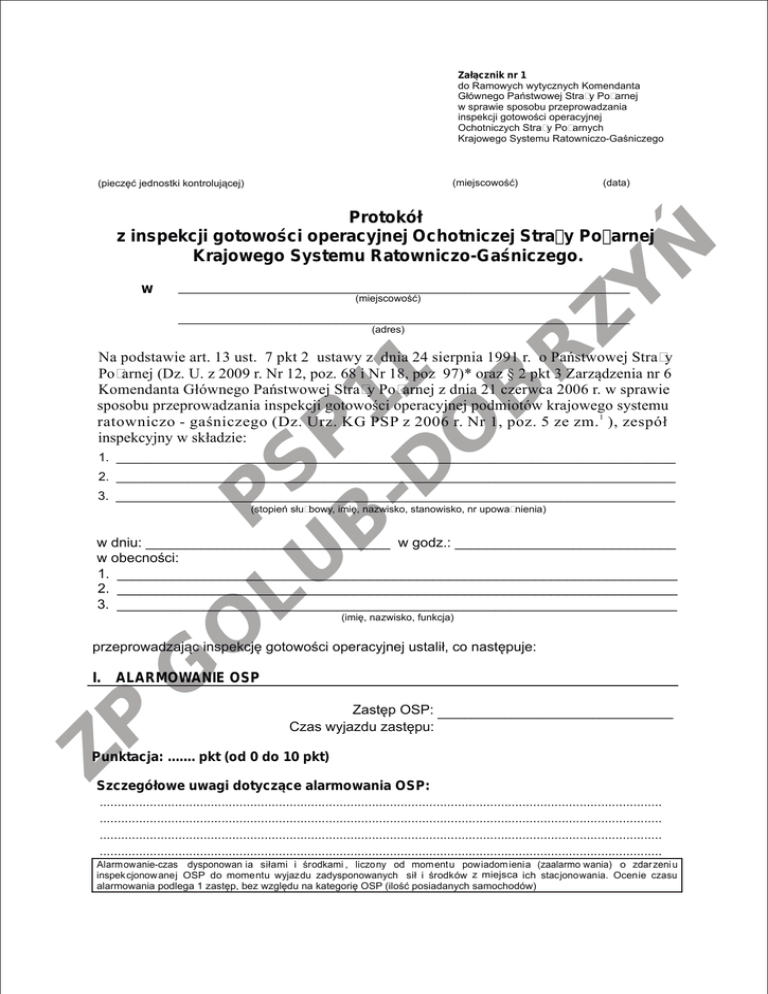 Załącznik nr 1 do Ramowych wytycznych Komendanta Głównego Państwowej Straży Pożarnej w sprawie sposobu przeprowadzania inspekcji gotowości operacyjnej Ochotniczych Straży Pożarnych Krajowego Systemu Ratowniczo-Gaśniczego (miejscowość) (pieczęć jednostki kontrolującej) (data) Protokół z inspekcji gotowości operacyjnej Ochotniczej Straży Pożarnej Krajowego Systemu Ratowniczo-Gaśniczego. w Ń Y Z R _______________________________________________________________ (miejscowość) _______________________________________________________________ (adres) 1 B 1 P O S D P BU L O G Na podstawie art. 13 ust. 7 pkt 2 ustawy z dnia 24 sierpnia 1991 r. o Państwowej Straży Pożarnej (Dz. U. z 2009 r. Nr 12, poz. 68 i Nr 18, poz 97)* oraz § 2 pkt 3 Zarządzenia nr 6 Komendanta Głównego Państwowej Straży Pożarnej z dnia 21 czerwca 2006 r. w sprawie sposobu przeprowadzania inspekcji gotowości operacyjnej podmiotów krajowego systemu ratowniczo - gaśniczego (Dz. Urz. KG PSP z 2006 r. Nr 1, poz. 5 ze zm. 1 ), zespół inspekcyjny w składzie: 1. ______________________________________________________________________________ 2. ______________________________________________________________________________ 3. ______________________________________________________________________________ (stopień służbowy, imię, nazwisko, stanowisko, nr upoważnienia) w dniu: _______________________________ w godz.: ____________________________ w obecności: 1. _______________________________________________________________________ 2. _______________________________________________________________________ 3. _______________________________________________________________________ (imię, nazwisko, funkcja) przeprowadzając inspekcję gotowości operacyjnej ustalił, co następuje: I. ALARMOWANIE OSP P Z Zastęp OSP: ___________________________________ Czas wyjazdu zastępu: Punktacja: ....... pkt (od 0 do 10 pkt) Szczegółowe uwagi dotyczące alarmowania OSP: ............................................................................................................................................................. ............................................................................................................................................................. ............................................................................................................................................................. ............................................................................................................................................................. Alarmowanie-czas dysponowan ia siłami i środkami , liczony od momentu powiadom ienia (zaalarmo wania) o zdar zeni u inspek cjonow anej OSP do momentu wyjazdu zadysponowanych sił i środków z miejsca ich stacjonowania. Ocenie czasu alarmowania podlega 1 zastęp, bez względu na kategorię OSP (ilość posiadanych samochodów) II. GOTOWOŚĆ OPERACYJNA RATOWNIKÓW OSP Prezes Naczelnik .. Liczba członków OSP :.......... Liczba członków mogących brać bezpośredni udział w działaniach ratow niczych :........ w tym przybyłych na inspekcję: ....... Uprawni enia w zakresi e kwalifikacji ratow niczych, uprawnieni a do obsługi sprzętu ratowniczego, a także aktual ne badanie lekarski e Szkolenie (kurs, przeszkolenie) Stan w OSP szkolenie podstawowe strażaków ratowników OSP *) szkolenie dowódców OSP*) szkolenie naczelników OSP*) szkolenie kierowców-konserwatorów sprzętu ratowniczego OSP *) Szkolenie w zakresie ratownictwa technicznego *) Kurs kwalifikowanej pierwszej pomocy Szkolenie w zakresie LPR Uprawnienia do kierowania pojazdami uprzywilejowanymi Inne kursy, szkolenia (jakie) 1 B 1 P O S D P BU L O G Aktualne badania lekarskie (stan w OSP) Ń Y Z R Strażacy podlegający inspekcji ................... Wyposażenie w odzież specjalną, środki ochrony indywidualnej i ekwipunek osobisty Przedmiot Lp. 1 2 3 4 5 6 7 8 9 10 Ilość na wyposażeniu w OSP Ilość na wyposażeniu strażaków podlegających inspekcji Ubranie specjalne Ubranie koszarowe Rękawice specjalne Kominiarka Buty specjalne Hełm strażacki Uzbrojenie osobiste ** Latarka Maska do aparatu ODO Sygnalizator bezruchu P Z Punktacja: .......pkt (od 0 do 10 pkt) * - Szkolenia, kursy wg “Systemu szkolenia członków Ochotniczych Straży Pożarnych biorących bezpośredni udział w działaniach ratowniczych” - Warszawa 2006 oraz jego nowelizacji ** - pas bojowy lub szelki bezpieczeństwa, zatrzaśnik, toporek strażacki, podpinka Punkty Szczegółowe uwagi dotyczące gotowości operacyjnej ratowników OSP: ............................................................................................................................................................... ............................................................................................................................................................... ............................................................................................................................................................... ............................................................................................................................................................... III. GOTOWOŚĆ (STAN TECHNICZNY) POJAZDÓW, SPRZĘTU INNEGO SPRZĘTU RATOWNICZEGO, SPRZĘTU ŁĄCZNOŚCI III.1. Lp. III.2. Lp. Pojazdy Rodzaj pojazdu (oznaczenie pożarnicze) Uwagi 1 B 1 P O S D P BU L O G Sprzęt silnikowy i ratowniczy Rodzaj sprzętu (oznaczenie pożarnicze) Sprzęt łączności III.3. Rodzaj sprzętu Lp. Ń Y Z R SILNIKOWEGO, Uwagi Uwagi Punktacja: ......pkt (od 0 do 10 pkt) P Z Szczegółowe uwagi dotyczące sprzętu: ............................................................................................................................................................... ......................................................................................................................