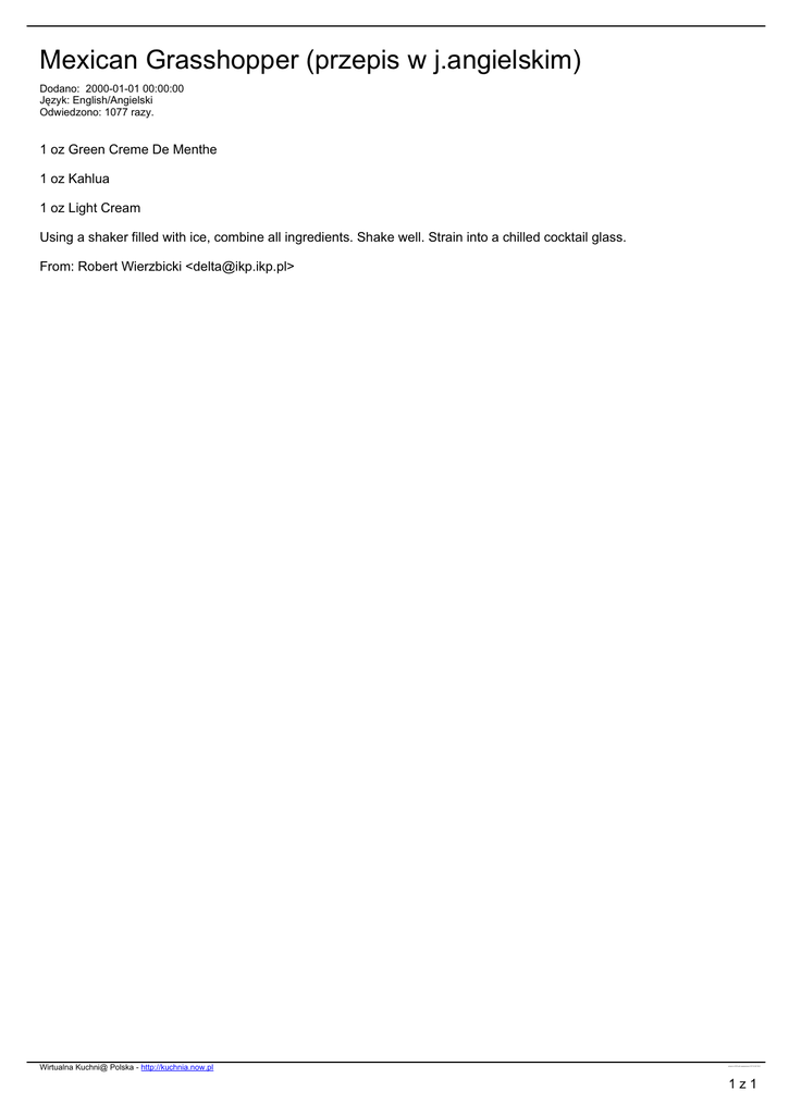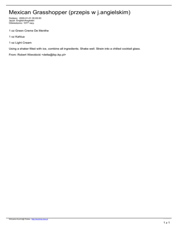 Mexican Grasshopper (przepis w j.angielskim) Dodano: 2000-01-01 00:00:00 Język: English/Angielski Odwiedzono: 1077 razy. 1 oz Green Creme De Menthe 1 oz Kahlua 1 oz Light Cream Using a shaker filled with ice, combine all ingredients. Shake well. Strain into a chilled cocktail glass. From: Robert Wierzbicki <[email protected]> Wirtualna Kuchni@ Polska - http://kuchnia.now.pl przepis nr 3919, plik wygenerowano 2017.03.08 19:04 1z1