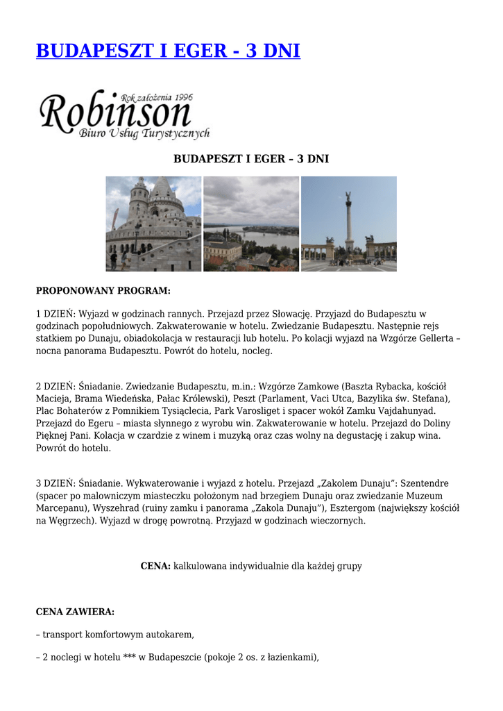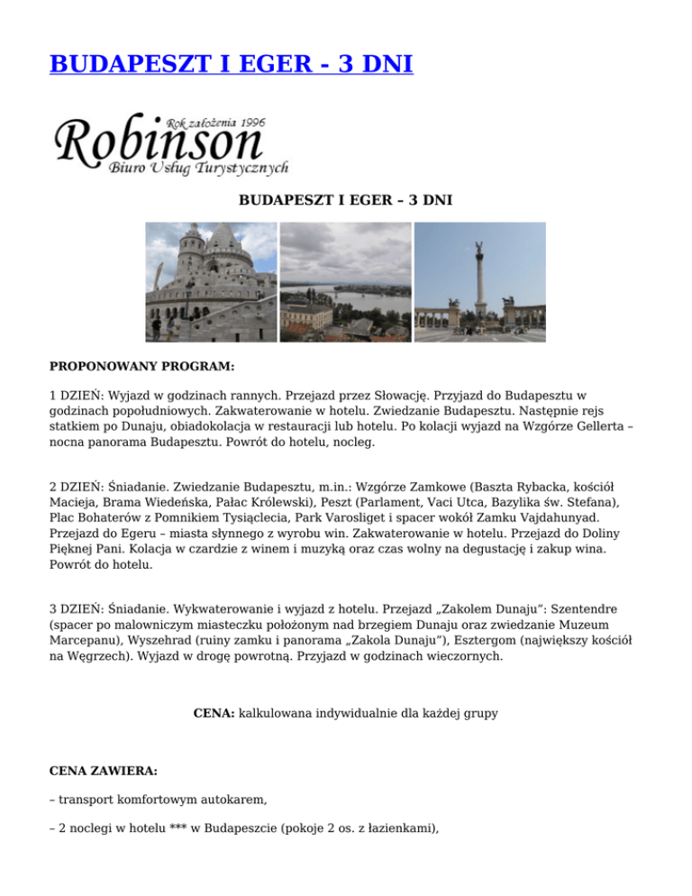 BUDAPESZT I EGER - 3 DNI BUDAPESZT I EGER – 3 DNI PROPONOWANY PROGRAM: 1 DZIEŃ: Wyjazd w godzinach rannych. Przejazd przez Słowację. Przyjazd do Budapesztu w godzinach popołudniowych. Zakwaterowanie w hotelu. Zwiedzanie Budapesztu. Następnie rejs statkiem po Dunaju, obiadokolacja w restauracji lub hotelu. Po kolacji wyjazd na Wzgórze Gellerta – nocna panorama Budapesztu. Powrót do hotelu, nocleg. 2 DZIEŃ: Śniadanie. Zwiedzanie Budapesztu, m.in.: Wzgórze Zamkowe (Baszta Rybacka, kościół Macieja, Brama Wiedeńska, Pałac Królewski), Peszt (Parlament, Vaci Utca, Bazylika św. Stefana), Plac Bohaterów z Pomnikiem Tysiąclecia, Park Varosliget i spacer wokół Zamku Vajdahunyad. Przejazd do Egeru – miasta słynnego z wyrobu win. Zakwaterowanie w hotelu. Przejazd do Doliny Pięknej Pani. Kolacja w czardzie z winem i muzyką oraz czas wolny na degustację i zakup wina. Powrót do hotelu. 3 DZIEŃ: Śniadanie. Wykwaterowanie i wyjazd z hotelu. Przejazd „Zakolem Dunaju”: Szentendre (spacer po malowniczym miasteczku położonym nad brzegiem Dunaju oraz zwiedzanie Muzeum Marcepanu), Wyszehrad (ruiny zamku i panorama „Zakola Dunaju”), Esztergom (największy kościół na Węgrzech). Wyjazd w drogę powrotną. Przyjazd w godzinach wieczornych. CENA: kalkulowana indywidualnie dla każdej grupy CENA ZAWIERA: – transport komfortowym autokarem, – 2 noclegi w hotelu *** w Budapeszcie (pokoje 2 os. z łazienkami), – wyżywienie: 2 śniadania – bufet, 1 obiadokolacja w hotelu lub restauracji (z napojami), 1 uroczysta kolacja z winem i muzyką, – opieka licencjonowanego i doświadczonego pilota, – ubezpieczenie KL, NNW, bagaż SIGNAL – IDUNA S.A., – opłaty drogowe i parkingowe, – podatek VAT. OPCJONALNE DOPŁATY: – Kąpieliska Szechenyi w Budapeszcie ok. 3000 HUF/os. DODATKOWE INFORMACJE: – Program jest ramowy, kolejność zwiedzania może ulec zmianie. Kraków, ul. Krowoderska 8 tel.: 12 292 00 71, tel./fax: 12 292 01 78 www.robinsontravel.pl e-mail: [email protected]