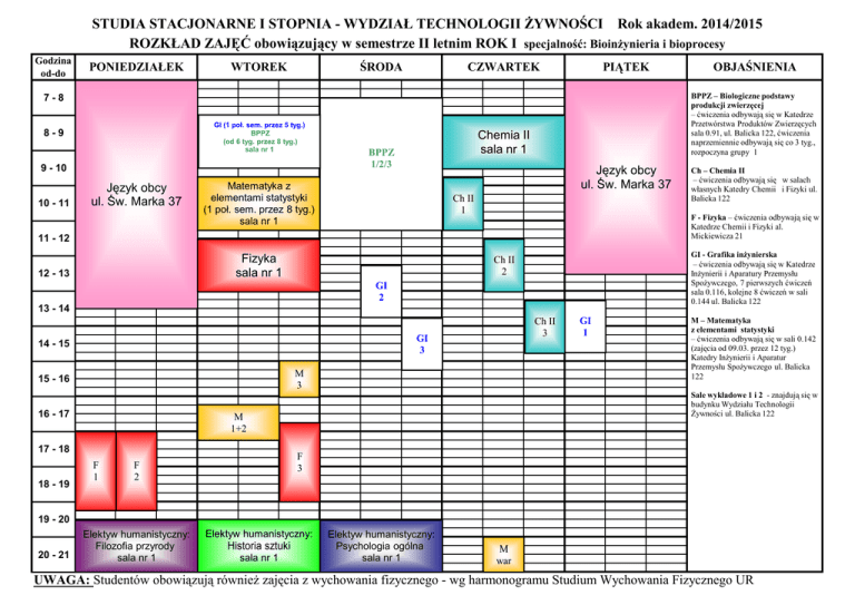 STUDIA STACJONARNE I STOPNIA - WYDZIAŁ TECHNOLOGII ŻYWNOŚCI Rok akadem. 2014/2015 ROZKŁAD ZAJĘĆ obowiązujący w semestrze II letnim ROK I specjalność: Bioinżynieria i bioprocesy Godzina od-do PONIEDZIAŁEK ŚRODA WTOREK CZWARTEK PIĄTEK BPPZ – Biologiczne podstawy produkcji zwierzęcej – ćwiczenia odbywają się w Katedrze Przetwórstwa Produktów Zwierzęcych sala 0.91, ul. Balicka 122, ćwiczenia naprzemiennie odbywają się co 3 tyg., rozpoczyna grupy 1 7-8 GI (1 poł. sem. przez 5 tyg.) BPPZ (od 6 tyg. przez 8 tyg.) sala nr 1 8-9 9 - 10 10 - 11 Język obcy ul. Św. Marka 37 Chemia II sala nr 1 BPPZ 1/2/3 Język obcy ul. Św. Marka 37 Matematyka z elementami statystyki (1 poł. sem. przez 8 tyg.) sala nr 1 Ch II 1 12 - 13 GI - Grafika inżynierska – ćwiczenia odbywają się w Katedrze Inżynierii i Aparatury Przemysłu Spożywczego, 7 pierwszych ćwiczeń sala 0.116, kolejne 8 ćwiczeń w sali 0.144 ul. Balicka 122 Ch II 2 GI 2 13 - 14 M 3 15 - 16 16 - 17 F 1 F 2 GI 1 M – Matematyka z elementami statystyki – ćwiczenia odbywają się w sali 0.142 (zajęcia od 09.03. przez 12 tyg.) Katedry Inżynierii i Aparatur Przemysłu Spożywczego ul. Balicka 122 Sale wykładowe 1 i 2 - znajdują się w budynku Wydziału Technologii Żywności ul. Balicka 122 M 1+2 17 - 18 18 - 19 Ch II 3 GI 3 14 - 15 Ch – Chemia II – ćwiczenia odbywają się w salach własnych Katedry Chemii i Fizyki ul. Balicka 122 F - Fizyka – ćwiczenia odbywają się w Katedrze Chemii i Fizyki al. Mickiewicza 21 11 - 12 Fizyka sala nr 1 OBJAŚNIENIA F 3 19 - 20 20 - 21 Elektyw humanistyczny: Filozofia przyrody sala nr 1 Elektyw humanistyczny: Historia sztuki sala nr 1 Elektyw humanistyczny: Psychologia ogólna sala nr 1 M war UWAGA: Studentów obowiązują również zajęcia z wychowania fizycznego - wg harmonogramu Studium Wychowania Fizycznego UR