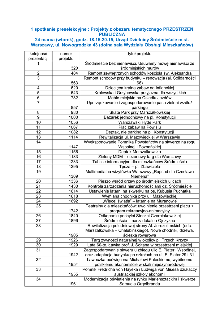 1 spotkanie preselekcyjne : Projekty z obszaru tematycznego PRZESTRZEŃ PUBLICZNA 24 marca (wtorek), godz. 18.15-20.15, Urząd Dzielnicy Śródmieście m.st. Warszawy, ul. Nowogrodzka 43 (dolna sala Wydziału Obsługi Mieszkańców) kolejność prezentacji 1 2 3 4 5 6 7 8 9 10 11 12 13 14 15 16 17 18 19 20 21 22 23 24 25 26 27 28 29 30 31 numer projektu 320 484 563 620 643 782 857 980 1000 1056 1067 1082 1114 1147 1156 1183 1233 1295 1309 1336 1430 1614 1618 1692 1742 1840 1896 1905 1926 1929 1942 32 1954 33 1955 34 1961 tytuł projektu Śródmieście bez nienawiści. Usuwamy mowę nienawiści ze śródmiejskich murów Remont zewnętrznych schodów kościoła św. Aleksandra Remont schodów przy budynku – renowacja (al. Solidarności 66) Dziecięca kraina zabaw na Inflanckiej Królewska i Grzybowska przyjazna dla wszystkich Meble miejskie na Osiedlu Jazdów Uporządkowanie i zagospodarowanie pasa zieleni wzdłuż parkingu Skate Park przy Marszałkowskiej Bazarek jednodniowy na pl. Konstytucji Warszawski Hyde Park Plac zabaw na Powiślu Deptak, nie parking na pl. Konstytucji Rewitalizacja ul. Mazowieckiej w Warszawie Wyeksponowanie Pomnika Powstańców na skwerze na rogu Wspólnej i Poznańskiej Deptak Marszałkowska Zielony MDM – sezonowy targ dla Warszawy Tablice informacyjne dla mieszkańców Śródmieścia Tęcza – pl. Zbawiciela Multimedialna wizytówka Warszawy „Rapsod dla Czesława Niemena” Pieszo wśród drzew po śródmiejskich ulicach Kontrola zarządzania nieruchomościami dz. Śródmieście Ustawienie latarni na skwerku na os. Kubusia Puchatka Wymiana chodnika przy ul. Mazowieckiej „Więcej światła” – latarnie na Muranowie Teatralny dla mieszkańców: uwolnienie przestrzeni placu + program rekreacyjno-animacyjny Odkopanie pochylni Stoczni Czerniakowskiej Śródmieście – nasza lokalna Ojczyzna Rewitalizacja południowej strony Al. Jerozolimskich (odc. Marszałkowska – Chałubińskiego). Nowe chodniki, drzewa, ścieżka rowerowa Targ żywności naturalnej w okolicy pl. Trzech Krzyży Lata 60-te. Ławka prof. J. Sołtana w przestrzeni miejskiej Zagospodarowanie skweru u zbiegu ulic E. Plater i Wspólnej, oraz adaptacja budynku po szkołach na ul. E. Plater 29 i 31 Ławeczka poświęcona Michałowi Kaleckiemu, wybitnemu polskiemu ekonomiście w skali międzynarodowej Pomnik Fredricha von Hayeka i Ludwiga von Misesa działaczy austriackiej szkoły ekonomii Modernizacja oświetlenia na rynku Mariensztackim i skwerze Samuela Orgelbranda 2 spotkanie preselekcyjne: Projekty z obszaru tematycznego KOMUNIKACJA I DROGI 26 marca (czwartek), godz. 18.15-20.15, Urząd Dzielnicy Śródmieście m.st. Warszawy, ul. Nowogrodzka 43 (dolna sala Wydziału Obsługi Mieszkańców) kolejność prezentacji 1 2 3 4 5 6 7 8 9 10 11 12 13 14 15 16 17 18 19 20 21 22 23 24 25 26 numer projektu 156 209 245 351 451 490 589 629 671 794 838 870 880 895 1207 1244 1255 1483 1495 1520 1571 1601 1607 1610 1732 1766 27 1809 28 29 30 31 32 1837 1856 1881 1915 1936 tytuł projektu Bezpiecznie rowerem wzdłuż Marszałkowskiej Poprawa bezpieczeństwa i wygody przesiadek na pl. Zamkowym Elektryczny 14-osobowy Metrobus kursujący z Rynku Nowego Miasta do Metra Ratusz Bezpieczne przejście dla pieszych przez al. Solidarności przy Orlej Pasy rowerowe i przejścia dla pieszych w Śródmieściu Budowa sygnalizacji świetlnej przy przejściu dla pieszych na ul. Stawki (w pobliżu ul. Pokornej Kontrapasy rowerowe w Śródmieściu Rowerowa i piesza alternatywa dla Al. Jerozolimskich na Ochotę Ścieżka rowerowa pod Barbakanem Więcej miejsc do parkowania w Śródmieściu Próg zwalniający w ul. Karmelickiej przy SP 210 Remont chodników na Górnośląskiej Windy na most Poniatowskiego Wymiana chodników od mostu Średnicowego do mostu Poniatowskiego Światła przy przedszkolu na Ludnej Pilotażowy projekt wprowadzenia sekundników na skrzyżowaniach Marszałkowską na rowerze Usprawnienia rowerowe – łączniki i pod prąd Ludzki przystanek autobusowy na pl. Konstytucji Sekundniki na głównych sygnalizacjach świetlnych w mieście System bezkolizyjnych dróg nadziemnych dla mikrohut, skuterów, rowerów, innych urządzeń lekkich oraz pieszych Bezpieczeństwo przy ul. Stawki – instalacja spowalniaczy ruchu Zamontowanie spowalniaczy ruchu na ul. Baczyńskiego Uspokojenie ruchu na skrzyżowaniu Chmielnej z Bracką/ Szpitalną Tramwajem szybciej – skrócenie czasu jazdy tramwajem i poprawa bezpieczeństwa pieszych wzdłuż Jana Pawła II Śródmieście dla przechodniów: poszerzenie chodników na ulicach Śródmieścia Południowego Montaż wyświetlaczy o czasie do odjazdu metra, tramwajów, autobusów na stacji Politechnika, Centrum, Ratusz-Arsenał i Dworzec Gdański Połączenie rowerowe trasy W-Z z Krakowskim Przedmieściem przez skwer za kościołem św. Anny i Bednarską Tramwajem szybciej – skrócenie czasu jazdy tramwajem wzdłuż Marszałkowskiej i likwidacja przycisków dla pieszych Tramwajem szybciej – skrócenie czasu jazdy tramwajem dzięki likwidacji ograniczenia prędkości na wiadukcie Poniatowskiego Wyznaczenie pasa rowerowego wzdłuż ul. Marszałkowskiej (wschodnia jezdnia) od strony Ogrodu Saskiego Wiata przystankowa „Górnośląska” 3 spotkanie preselekcyjne: Projekty z obszaru tematycznego ZIELEŃ MIEJSKA, OCHRONA ŚRODOWISKA 30 marca (poniedziałek), godz. 18.15-20.15, Urząd Dzielnicy Śródmieście m.st. Warszawy, ul. Nowogrodzka 43 (dolna sala Wydziału Obsługi Mieszkańców) kolejność prezentacji 1 2 3 numer projektu 59 142 458 4 5 6 7 8 9 10 11 12 13 14 15 16 633 774 783 786 791 825 829 969 1089 1197 1402 1425 1603 17 18 19 20 21 1635 1722 1762 1828 1873 22 1882 23 24 25 1935 1943 1963 tytuł projektu Ławki Obywatelskie Okruchy Ogrodu Saskiego - Lapidarium Skwer między ul. Świętojerską i Koźlą – zagospodarowanie z uwzględnieniem montażu oświetlenia i kompozycji zieleni Trawniki na Polnej – bulwarem Południowego Śródmieścia Załączmy Centrum 
