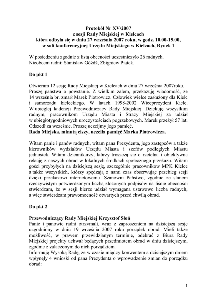 Protokół Nr XV/2007 z sesji Rady Miejskiej w Kielcach która odbyła się w dniu 27 września 2007 roku, w godz. 10.00-15.00, w sali konferencyjnej Urzędu Miejskiego w Kielcach, Rynek 1 W posiedzeniu zgodnie z listą obecności uczestniczyło 26 radnych. Nieobecni radni: Stanisław Góźdź, Zbigniew Piątek. Do pkt 1 Otwieram 12 sesję Rady Miejskiej w Kielcach w dniu 27 września 2007roku. Proszę państwa o powstanie. Z wielkim Ŝalem, przekazuję wiadomość, Ŝe 14 września br. zmarł Marek Piotrowicz. Człowiek wielce zasłuŜony dla Kielc i samorządu kieleckiego. W latach 1998-2002 Wiceprezydent Kielc. W ubiegłej kadencji Przewodniczący Rady Miejskiej. Dziękuję wszystkim radnym, pracownikom Urzędu Miasta i StraŜy Miejskiej za udział w ubiegłotygodniowych uroczystościach pogrzebowych. Marek przeŜył 57 lat. Odszedł za wcześnie. Proszę uczcijmy jego pamięć. Rada Miejska, minutą ciszy, uczciła pamięć Marka Piotrowicza. Witam panie i panów radnych, witam pana Prezydenta, jego zastępców a takŜe kierowników wydziałów Urzędu Miasta i szefów podległych Miastu jednostek. Witam dziennikarzy, którzy troszczą się o rzetelną i obiektywną relację z naszych obrad w lokalnych środkach społecznego przekazu. Witam gości przybyłych na dzisiejszą sesję, szczególnie pracowników MPK Kielce a takŜe wszystkich, którzy spędzają z nami czas obserwując przebieg sesji dzięki przekazowi internetowemu. Szanowni Państwo, zgodnie ze stanem rzeczywistym potwierdzonym liczbą złoŜonych podpisów na liście obecności stwierdzam, Ŝe w sesji bierze udział wymagana ustawowo liczba radnych, a więc stwierdzam prawomocność otwartych przed chwilą obrad. Do pkt 2 Przewodniczący Rady Miejskiej Krzysztof Słoń Panie i panowie radni otrzymali, wraz z zaproszeniem na dzisiejszą sesję uzgodniony w dniu 19 września 2007 roku porządek obrad. Mieli takŜe moŜliwość, w prawem przewidzianym terminie, odebrać z Biura Rady Miejskiej projekty uchwał będących przedmiotem obrad w dniu dzisiejszym, zgodnie z załączonym do nich porządkiem. Informuję Wysoką Radę, Ŝe w czasie między konwentem a dzisiejszym dniem wpłynęły 4 wnioski od pana Prezydenta o wprowadzenie zmian do porządku obrad: 1 − zdjęcie z porządku obrad projektu uchwały w sprawie zmiany nazwy ulicy w mieście Kielce; − wprowadzenie do porządku obrad projektu uchwały zmieniającej uchwałę w sprawie uchwalenia budŜetu miasta Kielce na 2007 (projekt nr 2); − wprowadzenie do porządku obrad projektu uchwały zmieniającej uchwałę w sprawie uchwalenia budŜetu miasta Kielce na 2007 (projekt nr 3); − wprowadzenie do porządku obrad projektu uchwały zmieniającej uchwałę w sprawie uchwalenia budŜetu miasta Kielce na 2007 (projekt nr 4). Ja wnioskuję do Wysokiej Rady aby punkt 8 porządku obrad, tj.: „Przyjęcie zalecenia Rady Miejskiej w Kielcach w sprawie Miejskiego Przedsiębiorstwa Komunikacji Sp. z o.o. w Kielcach”, przenieść na początek obrad i nadać mu numer 6. Radny Robert Siejka Pan Prezydent ubiegł mnie jeśli chodzi o uchwałę dotyczącą zmiany nazwy ulicy w mieście. Chodzi o ul. Gagarina. Natomiast chciałbym równieŜ prosić o zdjęcie z porządku obrad kolejnej uchwały w sprawie zmiany nazwy ulicy w Kielcach, dotyczącą osiedla Na Stoku, w imieniu mieszkańców tego osiedla, którzy protestują wnoszę o tą zmianę. Przewodniczący Rady Miejskiej Krzysztof Słoń Dotyczy to punktu „nadania nazwy ulicy” Chodzi o ul. Orląt Lwowskich. Radny Robert Siejka W porządku, który ja mam jest „zmiany nazwy”. Przewodniczący Rady Miejskiej Krzysztof Słoń Będziemy teraz operować nazewnictwem „nadania nazwy”. Traktuję to jako kolejny wniosek do zmian w porządku obrad. Poddaję pod głosowanie wnioski dot. zmian porządku obrad. I. Wniosek o zdjęcie z porządku obrad projektu uchwały w sprawie zmiany nazwy ulicy w mieście Kielce. (dot. ulicy Gagarina) Głosowanie: Za – 25 Przeciw – brak Wstrzymało się – brak Rada Miejska przyjęła wniosek o zdjęcie punktu z porządku obrad. II. Wniosek o rozszerzenie porządku obrad o projekt uchwały zmieniającej uchwałę w sprawie uchwalenia budŜetu miasta Kielce na 2007 (projekt nr 2). 2 Głosowanie: Za – 24 Przeciw – brak Wstrzymało się – 2 Rada Miejska przyjęła wniosek o rozszerzenie porządku obrad. III. Wniosek o rozszerzenie porządku obrad o projekt uchwały zmieniającej uchwałę w sprawie uchwalenia budŜetu miasta Kielce na 2007 (projekt nr 3). Głosowanie: Za – 25 Przeciw – brak Wstrzymało się – 1 Rada Miejska przyjęła wniosek o rozszerzenie porządku obrad. IV. Wniosek o rozszerzenie porządku obrad o projekt uchwały zmieniającej uchwałę w sprawie uchwalenia budŜetu miasta Kielce na 2007 (projekt nr 4). Głosowanie: Za – 25 Przeciw – brak Wstrzymało się – 1 Rada Miejska przyjęła wniosek o rozszerzenie porządku obrad. V. Wniosek o przeniesienie punktu Nr 8 porządku obrad na początek obrad i nadanie mu Nr 6. Głosowanie: Za – 26 Przeciw – brak Wstrzymało się – brak Rada Miejska przyjęła wniosek o zmianę w porządku obrad. VI. Wniosek radnego Roberta Siejki o zdjęcie z porządku obrad projektu uchwały w sprawie nadania nazwy ulicy w mieście Kielce. (dot. ulicy Orląt Lwowskich) Głosowanie: Za –9 Przeciw – 14 Wstrzymało się – 2 Rada Miejska nie przyjęła wniosku o zdjęcie punktu z porządku obrad. Przewodniczący Rady Miejskiej Krzysztof Słoń Biorąc pod uwagę przedstawiony porządek obrad, zmieniony w stosunku do uzgodnionego tydzień temu, proponuję go uwzględnić i w związku z tym, jeśli 3 nie usłyszę sprzeciwu poddam pod głosowanie porządek uwzględniający przegłosowane zmiany. Sprzeciwu nie słyszę. Poddaję, więc pod głosowanie porządek obrad uwzględniający przedstawione zmiany. Głosowanie: Za Przeciw Wstrzymało się – 23 – brak –3 Sesja realizowana będzie wg poniŜszego porządku obrad