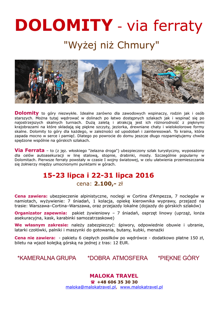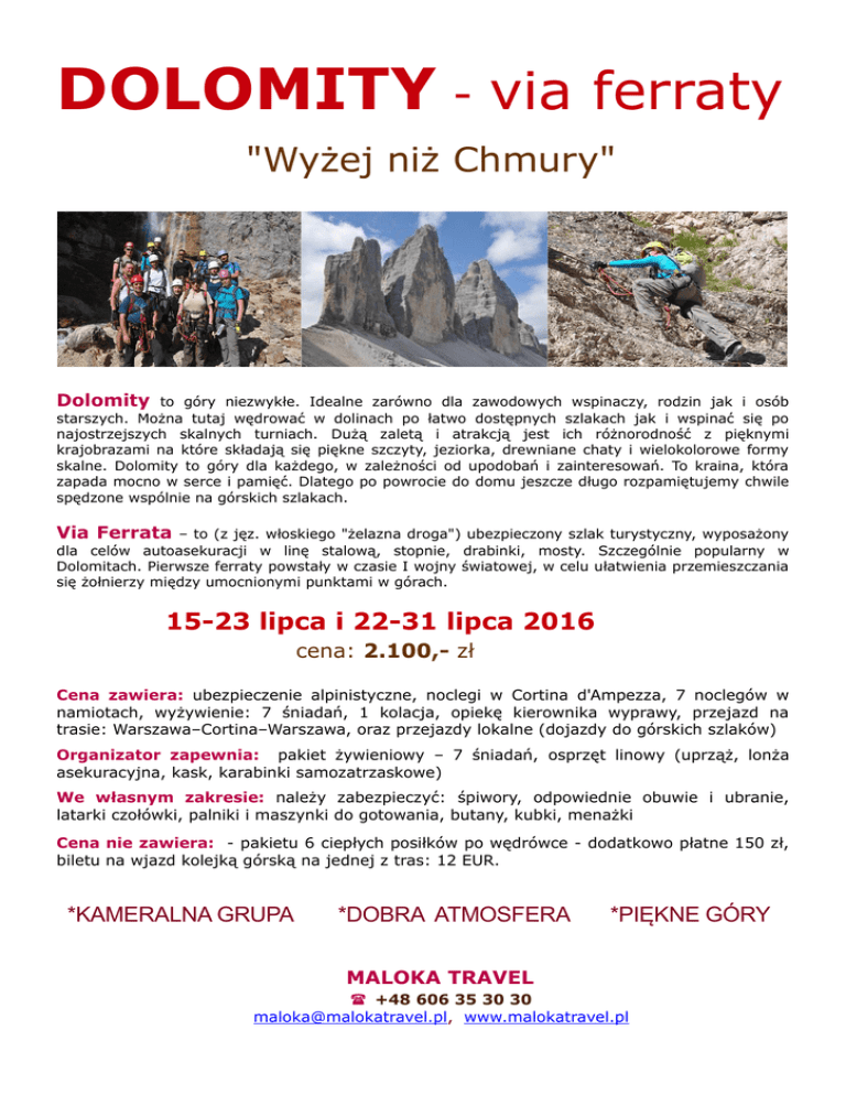 DOLOMITY - via ferraty "Wyżej niż Chmury" Dolomity to góry niezwykłe. Idealne zarówno dla zawodowych wspinaczy, rodzin jak i osób starszych. Można tutaj wędrować w dolinach po łatwo dostępnych szlakach jak i wspinać się po najostrzejszych skalnych turniach. Dużą zaletą i atrakcją jest ich różnorodność z pięknymi krajobrazami na które składają się piękne szczyty, jeziorka, drewniane chaty i wielokolorowe formy skalne. Dolomity to góry dla każdego, w zależności od upodobań i zainteresowań. To kraina, która zapada mocno w serce i pamięć. Dlatego po powrocie do domu jeszcze długo rozpamiętujemy chwile spędzone wspólnie na górskich szlakach. Via Ferrata – to (z jęz. włoskiego "żelazna droga") ubezpieczony szlak turystyczny, wyposażony dla celów autoasekuracji w linę stalową, stopnie, drabinki, mosty. Szczególnie popularny w Dolomitach. Pierwsze ferraty powstały w czasie I wojny światowej, w celu ułatwienia przemieszczania się żołnierzy między umocnionymi punktami w górach. 15-23 lipca i 22-31 lipca 2016 cena: 2.100,- zł Cena zawiera: ubezpieczenie alpinistyczne, noclegi w Cortina d'Ampezza, 7 noclegów w namiotach, wyżywienie: 7 śniadań, 1 kolacja, opiekę kierownika wyprawy, przejazd na trasie: Warszawa–Cortina–Warszawa, oraz przejazdy lokalne (dojazdy do górskich szlaków) Organizator zapewnia: pakiet żywieniowy – 7 śniadań, osprzęt linowy (uprząż, lonża asekuracyjna, kask, karabinki samozatrzaskowe) We własnym zakresie: należy zabezpieczyć: śpiwory, odpowiednie obuwie i ubranie, latarki czołówki, palniki i maszynki do gotowania, butany, kubki, menażki Cena nie zawiera: - pakietu 6 ciepłych posiłków po wędrówce - dodatkowo płatne 150 zł, biletu na wjazd kolejką górską na jednej z tras: 12 EUR. *KAMERALNA GRUPA *DOBRA ATMOSFERA *PIĘKNE GÓRY MALOKA TRAVEL +48 606 35 30 30 [email protected], www.malokatravel.pl