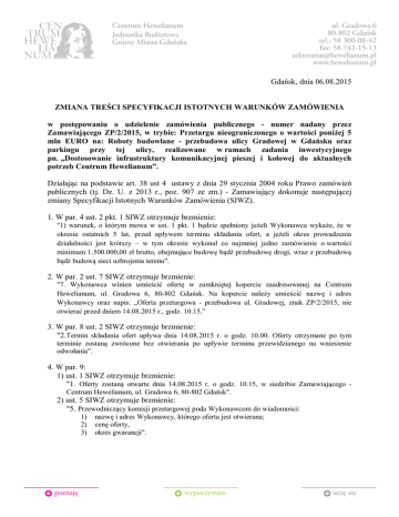 Gdańsk, dnia 06.08.2015 ZMIANA TREŚCI SPECYFIKACJI ISTOTNYCH WARUNKÓW ZAMÓWIENIA w postępowaniu o udzielenie zamówienia publicznego - numer nadany przez Zamawiającego ZP/2/2015, w trybie: Przetargu nieograniczonego o wartości poniżej 5 mln EURO na: Roboty budowlane - przebudowa ulicy Gradowej w Gdańsku oraz parkingu przy tej ulicy, realizowane w ramach zadania inwestycyjnego pn. „Dostosowanie infrastruktury komunikacyjnej pieszej i kołowej do aktualnych potrzeb Centrum Hewelianum”. Działając na podstawie art. 38 ust 4 ustawy z dnia 29 stycznia 2004 roku Prawo zamówień publicznych (tj. Dz. U. z 2013 r., poz. 907 ze zm.) - Zamawiający dokonuje następującej zmiany Specyfikacji Istotnych Warunków Zamówienia (SIWZ). 1. W par. 4 ust. 2 pkt. 1 SIWZ otrzymuje brzmienie: "1) warunek, o którym mowa w ust. 1 pkt. 1 będzie spełniony jeżeli Wykonawca wykaże, że w okresie ostatnich 5 lat, przed upływem terminu składania ofert, a jeżeli okres prowadzenia działalności jest krótszy – w tym okresie wykonał co najmniej jedno zamówienie o wartości minimum 1.500.000,00 zł brutto, obejmujące budowę bądź przebudowę drogi, wraz z przebudową bądź budową sieci uzbrojenia terenu". 2. W par. 2 ust. 7 SIWZ otrzymuje brzmienie: "7. Wykonawca winien umieścić ofertę w zamkniętej kopercie zaadresowanej na Centrum Hewelianum, ul. Gradowa 6, 80-802 Gdańsk. Na kopercie należy umieścić nazwę i adres Wykonawcy oraz napis: „Oferta przetargowa - przebudowa ul. Gradowej, znak ZP/2/2015, nie otwierać przed dniem 14.08.2015 r., godz. 10.15.” 3. W par. 8 ust. 2 SIWZ otrzymuje brzmienie: "2.Termin składania ofert upływa dnia 14.08.2015 r. o godz. 10.00. Oferty otrzymane po tym terminie zostaną zwrócone bez otwierania po upływie terminu przewidzianego na wniesienie odwołania". 4. W par. 9: 1) ust. 1 SIWZ otrzymuje brzmienie: "1. Oferty zostaną otwarte dnia 14.08.2015 r. o godz. 10.15, w siedzibie Zamawiającego Centrum Hewelianum, ul. Gradowa 6, 80-802 Gdańsk". 2) ust. 5 SIWZ otrzymuje brzmienie: "5. Przewodniczący komisji przetargowej poda Wykonawcom do wiadomości: 1) 2) 3) nazwę i adres Wykonawcy, którego oferta jest otwierana; cenę oferty, okres gwarancji".
