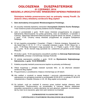 OGŁOSZENIA DUSZPASTERSKIE 01 CZERWIEC 2014 NIEDZIELA UROCZYSTOŚĆ WNIEBOWSTĄPIENIA PAŃSKIEGO Dzisiejsza kolekta przeznaczona jest na potrzeby naszej Parafii. Za złożone ofiary składamy serdeczne Bóg zapłać! 1. Dziś obchodzimy Uroczystość Wniebowstąpienia Pańskiego. 2. W przyszłą niedzielę będziemy obchodzić Uroczystość Zesłania Ducha Świętego. Trwa nowenna przed uroczystością Zesłania Ducha Świętego. 3. Jutro w poniedziałek o godz. 18.00 nasza młodzież przygotowana do przyjęcia Sakramentu Bierzmowania ma próbę generalną, wraz ze świadkami, w kościele w Czernicy. Natomiast Sakrament Bierzmowania przyjmie tamże we wtorek, 3 czerwca o godz. 17.00. Chcemy naszą młodzież przygotować do przyjęcia Szkaplerza Świętego. 4. W tym tygodniu przypadają I Czwartek, I Piątek i I Sobota miesiąca. Spowiedź św. dla dzieci klas II, III, IV, V, i VI w I czwartek miesiąca o godz. 16.00 i Msza św. o godz. 17.00.Klasy Gimnazjum mają spowiedź św. w I Piątek o godz. 17.30 i Mszę św. o godz. 18.30. Dorośli mają spowiedź św. codziennie pół godziny przed każdą Mszą św. 5. W środę o godz. 19.30 zapraszamy wszystkich parafian na Adorację Najświętszego Sakramentu, prosząc o konsekrację naszego Kościoła. 6. W sobotę zapraszamy parafian o godz. 16.00 na Wystawienie Najświętszego Sakramentu, o godz. 16.30 RÓŻANIEC. 7. Kolekta przyszłej niedzieli przeznaczona będzie na potrzeby archidiecezji. 8. Ofiara kopertowa z ubiegłej niedzieli wyniosła 400,- zł. Za ofiarność składam serdeczne Bóg Zapłać! 9. Przypominamy o przedłużeniu miejsca cmentarnego po 20 latach. 10. Aby zadbać o czystość w naszej świątyni i poczucie odpowiedzialności za nią zapraszamy do sprzątania kościoła w poniedziałek 02.06.2014 i w sobotę 07.06.2014 mieszkańców z Osiedle Orłowiec nr 44, 45. Bóg zapłać za tę służbę! 11. Za tydzień, czyli po niedzieli 8 czerwca przez tydzień będzie zbierany złom elektrośmieci. Rozpoczniemy od poniedziałku 9 czerwca. Można składować wszystkie wymienione w ulotce elementy tuż pod głównym wejściem na probostwo, tak by mieć na to baczenie, gdyż złom jest narażony na kradzież. ZAPROSZENIE NA KONCERT TGD I SPOTKANIE Z PASTOREM FRANKLINEM GRACHAMEM Serdecznie zapraszamy wszystkich chętnych parafian do udziału w koncercie Trzeciej Godziny Dnia – TGD i Beaty Bednarz, który odbędzie się 12 czerwca br. (czwartek) o godz. 17.45 w katowickiej katedrze Chrystusa Króla. Wstęp wolny. Podczas koncertu słowo wygłosi pastor Franklin Graham. Koncert oraz wizyta pastora nawiązuje do 35. rocznicy (1978–2013) ewangelizacyjnego spotkania Billy’ego Grahama – ojca Franklina z wiernymi Górnego Śląska w katowickiej katedrze. Powyższe wydarzenie dedykujemy także przedstawicielom ruchów, grup ewangelizacyjnych oraz Księżom katechetom wraz z młodzieżą. Wydarzenie zorganizowała m.ini. Archidiecezjalna Komisja Ekumeniczna i Dialogu Międzyreligijnego. Udział w tym spotkaniu ekumenicznym zapowiedział Metropolita Katowicki. PIELGRZYMKA OSÓB MODLĄCYCH SIĘ ZA KAPŁANÓW Ks. Władysław Nieszporek, kustosz piekarskiego sanktuarium zaprasza wiernych do udziału w I Pielgrzymce osób modlących się za kapłanów: „Margaretek”, członków „Wieczernika modlitwy za kapłanów”, członków dzieła „duchowej adopcji kapłanów” itp., którą zaplanowano w dniu 26 czerwca br. w Bazylice piekarskiej. W programie: 16.30 – Msza św. pod przewodnictwem ks. Marka Szkudło, wikariusza biskupiego ds. stałej formacji kapłanów; 17.30 – Nabożeństwo za kapłanów połączone z procesją eucharystyczną; 18.00 - Spotkanie w „Ogrodzie Anioła”; W celach organizacyjnych prosimy o zgłoszenia grup, wspólnot czy też indywidualnych pielgrzymów do 15 czerwca: [email protected]. Serdecznie zapraszamy.