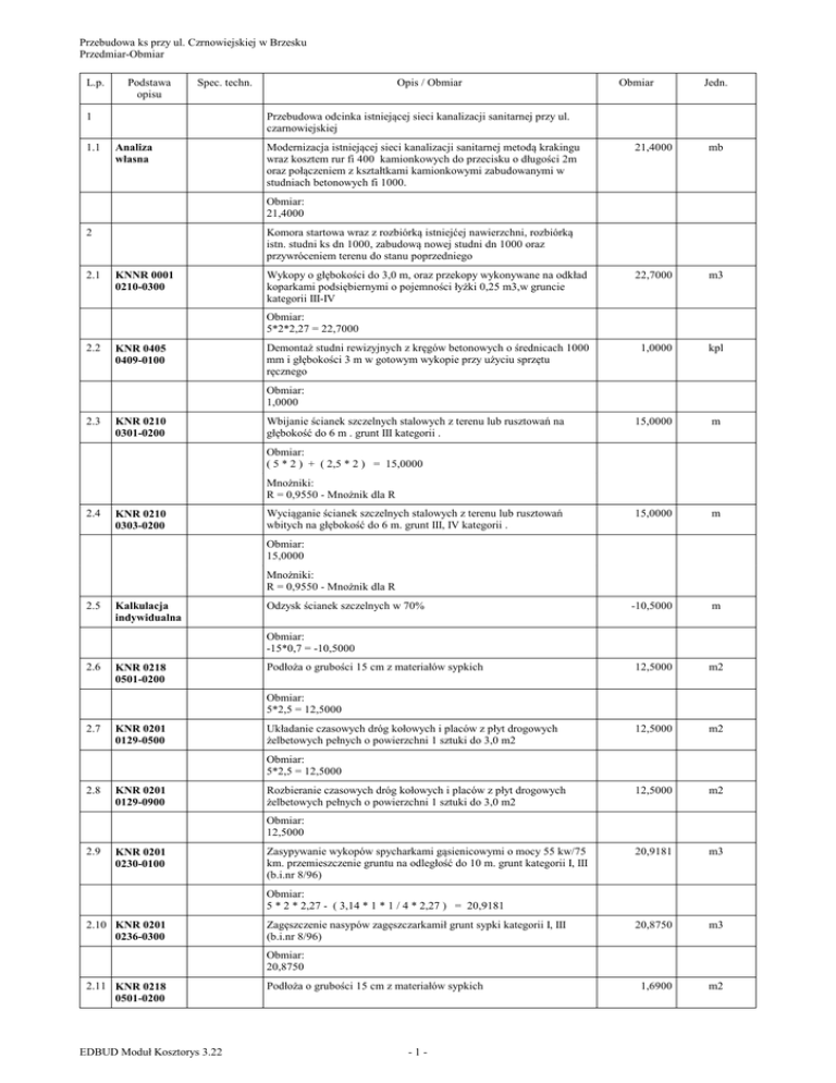Przebudowa ks przy ul. Czrnowiejskiej w Brzesku Przedmiar-Obmiar L.p. Podstawa opisu Spec. techn. 1 1.1 Opis / Obmiar Obmiar Jedn. Przebudowa odcinka istniejącej sieci kanalizacji sanitarnej przy ul. czarnowiejskiej Analiza własna Modernizacja istniejącej sieci kanalizacji sanitarnej metodą krakingu wraz kosztem rur fi 400 kamionkowych do przecisku o długości 2m oraz połączeniem z kształtkami kamionkowymi zabudowanymi w studniach betonowych fi 1000. 21,4000 mb 22,7000 m3 1,0000 kpl 15,0000 m 15,0000 m -10,5000 m 12,5000 m2 12,5000 m2 12,5000 m2 20,9181 m3 20,8750 m3 1,6900 m2 Obmiar: 21,4000 2 2.1 Komora startowa wraz z rozbiórką istniejćej nawierzchni, rozbiórką istn. studni ks dn 1000, zabudową nowej studni dn 1000 oraz przywróceniem terenu do stanu poprzedniego KNNR 0001 0210-0300 Wykopy o głębokości do 3,0 m, oraz przekopy wykonywane na odkład koparkami podsiębiernymi o pojemności łyżki 0,25 m3,w gruncie kategorii III-IV Obmiar: 5*2*2,27 = 22,7000 2.2 KNR 0405 0409-0100 Demontaż studni rewizyjnych z kręgów betonowych o średnicach 1000 mm i głębokości 3 m w gotowym wykopie przy użyciu sprzętu ręcznego Obmiar: 1,0000 2.3 KNR 0210 0301-0200 Wbijanie ścianek szczelnych stalowych z terenu lub rusztowań na głębokość do 6 m . grunt III kategorii . Obmiar: ( 5 * 2 ) + ( 2,5 * 2 ) = 15,0000 Mnożniki: R = 0,9550 - Mnożnik dla R 2.4 KNR 0210 0303-0200 Wyciąganie ścianek szczelnych stalowych z terenu lub rusztowań wbitych na głębokość do 6 m. grunt III, IV kategorii . Obmiar: 15,0000 Mnożniki: R = 0,9550 - Mnożnik dla R 2.5 Kalkulacja indywidualna Odzysk ścianek szczelnych w 70% Obmiar: -15*0,7 = -10,5000 2.6 KNR 0218 0501-0200 Podłoża o grubości 15 cm z materiałów sypkich Obmiar: 5*2,5 = 12,5000 2.7 KNR 0201 0129-0500 Układanie czasowych dróg kołowych i placów z płyt drogowych żelbetowych pełnych o powierzchni 1 sztuki do 3,0 m2 Obmiar: 5*2,5 = 12,5000 2.8 KNR 0201 0129-0900 Rozbieranie czasowych dróg kołowych i placów z płyt drogowych żelbetowych pełnych o powierzchni 1 sztuki do 3,0 m2 Obmiar: 12,5000 2.9 KNR 0201 0230-0100 Zasypywanie wykopów spycharkami gąsienicowymi o mocy 55 kw/75 km. przemieszczenie gruntu na odległość do 10 m. grunt kategorii I, III (b.i.nr 8/96) Obmiar: 5 * 2 * 2,27 - ( 3,14 * 1 * 1 / 4 * 2,27 ) = 20,9181 2.10 KNR 0201 0236-0300 Zagęszczenie nasypów zagęszczarkamił grunt sypki kategorii I, III (b.i.nr 8/96) Obmiar: 20,8750 2.11 KNR 0218 0501-0200 EDBUD Moduł Kosztorys 3.22 Podłoża o grubości 15 cm z materiałów sypkich -1- Przebudowa ks przy ul. Czrnowiejskiej w Brzesku Przedmiar-Obmiar L.p. Podstawa opisu Spec. techn. Opis / Obmiar Obmiar Jedn. Obmiar: 1,3*1,3 = 1,6900 Krotność: 4,0000 2.12 KNR 0228 0406-0300 Studnie rewizyjne z kręgów betonowych o średnicy 1000 mm w gotowym wykopie, głębokość studni do 2,0 m; włazem z logo RPWiK, kształtkami kamionkowymi dn 400 zabudowanymi w studnię (rys. nr 3 proj. przebudowy). 1,0000 studzienki 11,8800 m3 1,0000 kpl 9,0000 m 9,0000 m -6,3000 m 4,5000 m2 4,5000 m2 4,5000 m2 8,6931 m3 10,5300 m3 Obmiar: 1,0000 3 3.1 Komora odbiorcza wraz z rozbiórką istniejącego zagospodarowania, studni, rozbiórką istniejącej studni dn 1000, zabudową nowej studni dn 1000 oraz przywróceniem terenu do stanu poprzedniego. KNNR 0001 0210-0300 Wykopy o głębokości do 3,0 m, oraz przekopy wykonywane na odkład koparkami podsiębiernymi o pojemności łyżki 0,25 m3,w gruncie kategorii III-IV Obmiar: 3 * 1,5 * 2,64 = 11,8800 3.3 KNR 0405 0409-0100 Demontaż studni rewizyjnych z kręgów betonowych o średnicach 1000 mm i głębokości 3 m w gotowym wykopie przy użyciu sprzętu ręcznego Obmiar: 1,0000 3.4 KNR 0210 0301-0200 Wbijanie ścianek szczelnych stalowych z terenu lub rusztowań na głębokość do 6 m . grunt III kategorii . Obmiar: ( 3 * 2 ) + ( 1,5 * 2 ) = 9,0000 Mnożniki: R = 0,9550 - Mnożnik dla R 3.5 KNR 0210 0303-0200 Wyciąganie ścianek szczelnych stalowych z terenu lub rusztowań wbitych na głębokość do 6 m. grunt III, IV kategorii . Obmiar: 9,0000 Mnożniki: R = 0,9550 - Mnożnik dla R 3.6 Kalkulacja indywidualna Odzysk ścianek szczelnych w 70% Obmiar: -9*0,7 = -6,3000 3.7 KNR 0218 0501-0200 Podłoża o grubości 15 cm z materiałów sypkich Obmiar: 3*1,5 = 4,5000 Krotność: 2,0000 3.8 KNR 0201 0129-0500 Układanie czasowych dróg kołowych i placów z płyt drogowych żelbetowych pełnych o powierzchni 1 sztuki do 3,0 m2 Obmiar: 3*1,5 = 4,5000 3.9 KNR 0201 0129-0900 Rozbieranie czasowych dróg kołowych i placów z płyt drogowych żelbetowych pełnych o powierzchni 1 sztuki do 3,0 m2 Obmiar: 4,5000 3.10 KNR 0201 0230-0100 Zasypywanie wykopów spycharkami gąsienicowymi o mocy 55 kw/75 km. przemieszczenie gruntu na odległość do 10 m. grunt kategorii I, III (b.i.nr 8/96) Obmiar: 3 * 1,5 * 2,34 - ( 3,14 * 1 * 1 / 4 * 2,34 ) = 8,6931 3.11 KNR 0201 0236-0300 Zagęszczenie nasypów zagęszczarkamił grunt sypki kategorii I, III (b.i.nr 8/96) Obmiar: EDBUD Moduł Kosztorys 3.22 -2- Przebudowa ks przy ul. Czrnowiejskiej w Brzesku Przedmiar-Obmiar L.p. Podstawa opisu Spec. techn. Opis / Obmiar Obmiar Jedn. 10,5300 3.12 KNR 0218 0501-0200 Podłoża o grubości 15 cm z materiałów sypkich 1,6900 m2 1,0000 studzienki 10,0000 godz. 1,0000 kpl Obmiar: 1,3*1,3 = 1,6900 Krotność: 2,0000 3.13 KNR 0228 0406-0300 Studnie rewizyjne z kręgów betonowych o średnicy 1000 mm w gotowym wykopie, głębokość studni do 2,0 m; włazem z logo RPWiK, kształtkami kamionkowymi dn 400 zabudowanymi w studnię (rys nr 3 proj. przeb). Obmiar: 1,0000 4 4.1 Odwodnienie podczas wykonywanych robót KNRw 0201 0604-0100 Pompowanie próbne pomiarowe lub oczyszczające - średnice otworów od 150 do 500 mm- przyjęto orientacyjne. Podczas wykonywania robót nakleży rozliczyć wg ilości godzin pompowań potwierdzonych przez Inspektora Nadzoru. Obmiar: 10,0000 5 Przepompowanie ścieków do czynnego kanału Kalkulacja indywidualna Przepompowanie ścieków p