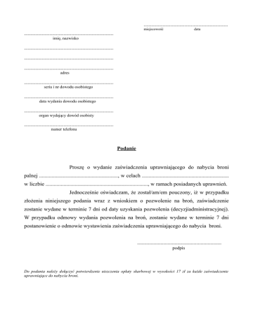 .................................................................. miejscowość data ...................................................................... imię, nazwisko ...................................................................... ...................................................................... ...................................................................... adres ...................................................................... seria i nr dowodu osobistego ...................................................................... data wydania dowodu osobistego ...................................................................... organ wydający dowód osobisty ...................................................................... numer telefonu Podanie Proszę o wydanie zaświadczenia uprawniającego do nabycia broni palnej ........................................................., w celach ............................................................... w liczbie .........................................................................., w ramach posiadanych uprawnień. Jednocześnie oświadczam, że został/am/em pouczony, iż w przypadku złożenia niniejszego podania wraz z wnioskiem o pozwolenie na broń, zaświadczenie zostanie wydane w terminie 7 dni od daty uzyskania pozwolenia (decyzjiadministracyjnej). W przypadku odmowy wydania pozwolenia na broń, zostanie wydane w terminie 7 dni postanowienie o odmowie wystawienia zaświadczenia uprawniającego do nabycia broni. ............................................................. podpis Do podania należy dołączyć potwierdzenie uiszczenia opłaty skarbowej w wysokości 17 zł za każde zaświadczenie uprawniające do nabycia broni.