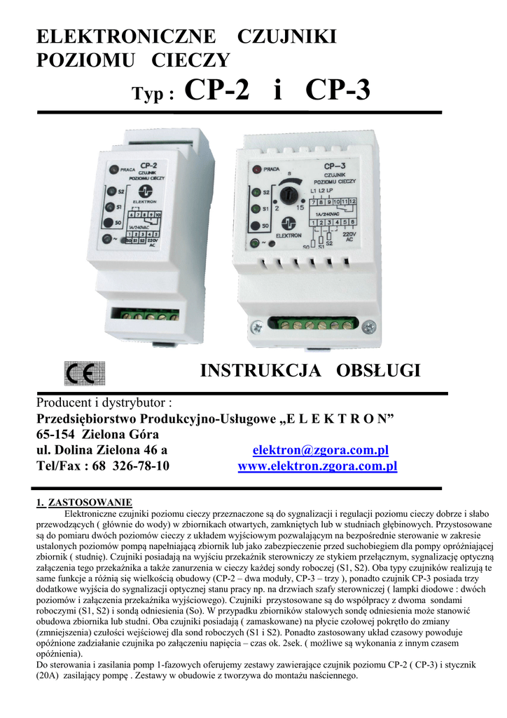 ELEKTRONICZNE CZUJNIKI POZIOMU CIECZY Typ : CP-2 i CP-3 INSTRUKCJA OBSŁUGI Producent i dystrybutor : Przedsiębiorstwo Produkcyjno-Usługowe „E L E K T R O N” 65-154 Zielona Góra ul. Dolina Zielona 46 a [email protected] Tel/Fax : 68 326-78-10 www.elektron.zgora.com.pl 1. ZASTOSOWANIE Elektroniczne czujniki poziomu cieczy przeznaczone są do sygnalizacji i regulacji poziomu cieczy dobrze i słabo przewodzących ( głównie do wody) w zbiornikach otwartych, zamkniętych lub w studniach głębinowych. Przystosowane są do pomiaru dwóch poziomów cieczy z układem wyjściowym pozwalającym na bezpośrednie sterowanie w zakresie ustalonych poziomów pompą napełniającą zbiornik lub jako zabezpieczenie przed suchobiegiem dla pompy opróżniającej zbiornik ( studnię). Czujniki posiadają na wyjściu przekaźnik sterowniczy ze stykiem przełącznym, sygnalizację optyczną załączenia tego przekaźnika a także zanurzenia w cieczy każdej sondy roboczej (S1, S2). Oba typy czujników realizują te same funkcje a różnią się wielkością obudowy (CP-2 – dwa moduły, CP-3 – trzy ), ponadto czujnik CP-3 posiada trzy dodatkowe wyjścia do sygnalizacji optycznej stanu pracy np. na drzwiach szafy sterowniczej ( lampki diodowe : dwóch poziomów i załączenia przekaźnika wyjściowego). Czujniki przystosowane są do współpracy z dwoma sondami roboczymi (S1, S2) i sondą odniesienia (So). W przypadku zbiorników stalowych sondę odniesienia może stanowić obudowa zbiornika lub studni. Oba czujniki posiadają ( zamaskowane) na płycie czołowej pokrętło do zmiany (zmniejszenia) czułości wejściowej dla sond roboczych (S1 i S2). Ponadto zastosowany układ czasowy powoduje opóźnione zadziałanie czujnika po załączeniu napięcia – czas ok. 2sek. ( możliwe są wykonania z innym czasem opóźnienia). Do sterowania i zasilania pomp 1-fazowych oferujemy zestawy zawierające czujnik poziomu CP-2 ( CP-3) i stycznik (20A) zasilający pompę . Zestawy w obudowie z tworzywa do montażu naściennego. 2. DANE TECHNICZNE napięcie zasilania : 230V~ , 50Hz, pobór mocy : < 0,5 VA ( CP-2) ; < 2,0 VA ( CP-3) wyjście sterownicze : jedno przekaźnikowe (przełączne) -dopuszczalna obciążalność 240VAC, 1A, cos φ= 0,8...1 wejścia sterownicze : dwie lub trzy sondy konduktometryczne (dla cieczy przewodzących prąd) – np. sondy wiszące na przewodzie typ „SW-1k”, wkręcane typ „G1...4” itd. Wejścia sond roboczych ”S1” i „S2” z regulacją czułości w granicach 130-220kΩ. Do wejść tych można także podłączyć sondy pływakowe np. MAC-3( także dla cieczy nieprzewodzących ). Napięcie na sondach ok. 12 V DC (stałe). Wersja czujnika podającego napięcie zmienne na sondy CP-2F ( oddzielna instrukcja) – bez zjawiska elektrolizy na sondach. wybór funkcji sterowania : zewnętrzna zwora zapinana do zacisków (6-7 dla CP-2 i 1-4 dla CP-3) do odwrócenia funkcji przekaźnika wyjściowego. Brak zwory-sterowanie pompą napełniającą zbiornik, zwora zapięta- sterowanie pompą opróżniającą zbiornik ( zabezpieczenie przed suchobiegiem) Zwora ( mostek) wykonana np. przewodem DY 0,5. wyjścia sygnalizacyjne : trzy wyjścia tranzystorowe do zewnętrznej sygnalizacji optycznej ( tylko dla CP-3) (np. na elewacji szafy sterowniczej) stanu zanurzenia dwóch sond roboczych (S1, S2) i załączenia przekaźnika wyjściowego. Dopuszczalna obciążalność 12V ; 0,1A ( zalecane diody świecące – np.LD-1). wymiary : CP-2 35 x 90 x 63 ( dwa moduły do montażu na szynie DIN) CP-3 52,5 x 90 x 65,5 ( trzy moduły do montażu na szynie DIN) temperatura otoczenia : 0...50°C , masa : ok. 0,30 kg . wymagania bezpieczeństwa : według PN-EN 61010-1 : 2002U. kompatybilność elektromagnetyczna : odporność na zakłócenia według PN-EN 61000-6-2 : 2003. emisja zakłóceń według PN-EN 61000-6-4 : 2002U. 3. OPIS KONSTRUKCJI Konstrukcja urządzeń umożliwia montaż na szynie 35mm. Obudowy z widokiem płyty czołowej pokazano na rys.1. Stan każdego wejścia i wyjścia sterowniczego sygnalizowany jest diodami świecącymi na płycie czołowej czujników. Rys. 1 Obudowa czujników CP-2 i CP-3 z widokiem płyty czołowej. 1. obudowa z tworzywa sztucznego (ABS), 2. czerwona dioda „praca” – sygnalizacja załączenia przekaźnika wyjściowego, 3. dwie lampki zielone –sygnalizujące zanurzenie w cieczy sond „S1” i „S2” 4. zielona lampka sygnalizująca przyłączenie napięcia zasilania „ ~”, 5. zamaskowane pokrętło regulacji czułości wejściowej sond roboczych „S1” i „S2”. 4. FUNKCJE URZĄDZENIA Oba czujniki posiadają pod płytą czołową pokrętło regulacyjne do zmiany czułości wejściowej sond roboczych (S1,S2). Dostęp do regulacji małym wkrętakiem po przebiciu folii maskującej otwór ( rys.1 poz.5). W większości zastosowań regulacja ta jest zbędna ( fabryczna nastawa na max. czułość). Zmniejszenie czułości poprzez obrót w prawo jest wskazane np. w przypadku sond w studniach głębinowych ( sondy dotykają do mokrych konstrukcji i obudowy studni). Funkcja opóźnionego zadziałania czujników po załączeniu napięcia ( ok. 2sek.) powoduje załączenie sterowanych pomp po ustabilizowaniu się napięcia a zastosowanie na jednym obiekcie czujników z różnymi czasami opóźnienia zabezpiecza przed jednoczesnym rozruchem kilku pomp ( bez konieczności stosowania przekaźników czasowych). Elektroniczne czujniki poziomu cieczy CP-2 i CP-3 realizują takie same funkcje, mogą sterować pracą pompy napełniającej zbiornik lub stanowić zabezpieczenie przed suchobiegiem dla pompy opróżniającej zbiornik ( studnię). W przypadku funkcji opróżniania zbiornika należy dodatkowo zapiąć zworę (mostek) na zaciski : 6-7 (dla CP-2) i 1-4 ( dla CP-3). Założona zwora powoduje zmianę stanu styków przekaźnika wyjściowego na przeciwny. Działanie czujników dla tych przypadków jest następujące : Opis funkcji wybieranych przez zworę: -z