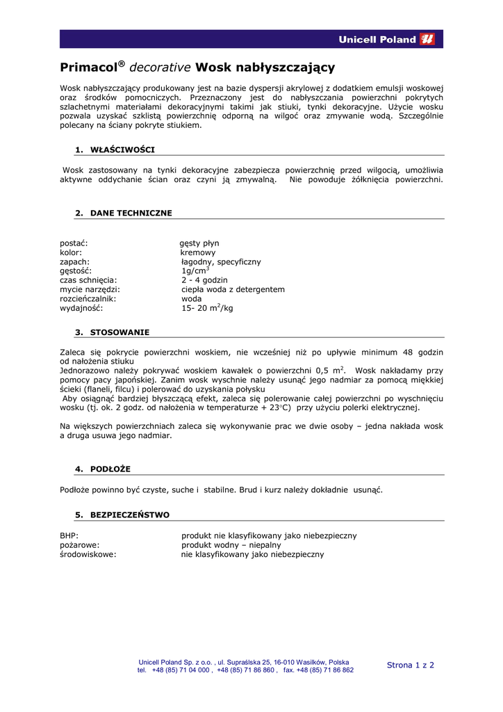 Primacol® decorative Wosk nabłyszczający Wosk nabłyszczający produkowany jest na bazie dyspersji akrylowej z dodatkiem emulsji woskowej oraz środków pomocniczych. Przeznaczony jest do nabłyszczania powierzchni pokrytych szlachetnymi materiałami dekoracyjnymi takimi jak stiuki, tynki dekoracyjne. Użycie wosku pozwala uzyskać szklistą powierzchnię odporną na wilgoć oraz zmywanie wodą. Szczególnie polecany na ściany pokryte stiukiem. 1. WŁAŚCIWOŚCI Wosk zastosowany na tynki dekoracyjne zabezpiecza powierzchnię przed wilgocią, umożliwia aktywne oddychanie ścian oraz czyni ją zmywalną. Nie powoduje żółknięcia powierzchni. 2. DANE TECHNICZNE postać: kolor: zapach: gęstość: czas schnięcia: mycie narzędzi: rozcieńczalnik: wydajność: gęsty płyn kremowy łagodny, specyficzny 1g/cm3 2 - 4 godzin ciepła woda z detergentem woda 15- 20 m2/kg 3. STOSOWANIE Zaleca się pokrycie powierzchni woskiem, nie wcześniej niż po upływie minimum 48 godzin od nałożenia stiuku Jednorazowo należy pokrywać woskiem kawałek o powierzchni 0,5 m2. Wosk nakładamy przy pomocy pacy japońskiej. Zanim wosk wyschnie należy usunąć jego nadmiar za pomocą miękkiej ścieki (flaneli, filcu) i polerować do uzyskania połysku Aby osiągnąć bardziej błyszczącą efekt, zaleca się polerowanie całej powierzchni po wyschnięciu wosku (tj. ok. 2 godz. od nałożenia w temperaturze + 23C) przy użyciu polerki elektrycznej. Na większych powierzchniach zaleca się wykonywanie prac we dwie osoby – jedna nakłada wosk a druga usuwa jego nadmiar. 4. PODŁOŻE Podłoże powinno być czyste, suche i stabilne. Brud i kurz należy dokładnie usunąć. 5. BEZPIECZEŃSTWO BHP: pożarowe: środowiskowe: produkt nie klasyfikowany jako niebezpieczny produkt wodny – niepalny nie klasyfikowany jako niebezpieczny Unicell Poland Sp. z o.o. , ul. Supraślska 25, 16-010 Wasilków, Polska tel. +48 (85) 71 04 000 , +48 (85) 71 86 860 , fax. +48 (85) 71 86 862 Strona 1 z 2 6. SKŁADOWANIE Przechowywać w temp. 5–30oC, w suchym miejscu, nie wystawiać na bezpośrednie działanie promieni słonecznych, w szczelnie zamkniętych, oryginalnych opakowaniach. Okres trwałości wynosi 12 miesięcy od daty produkcji. 7. INFORMACJE PRAWNE Wszystkie informacje i dane zawarte tutaj są podane w dobrej wierze i w zgodzie z posiadaną przez nasze laboratoria wiedzą. Muszą jednak być przyjęte jako oznaczenia bez gwarancji, jeżeli produkt znajduje się poza naszą kontrolą. Informacja techniczna nie jest świadectwem jakości produktu ani też ofertą. Producent nie odpowiada za niewłaściwe użycie informacji zawartych na tej karcie, ani też za konsekwencje z tego wynikające. W przypadku wątpliwości zawsze należy przeprowadzić próbę. Producent zastrzega sobie prawo do zmiany powyższych danych bez powiadamiania klienta. 8. POZOSTAŁE INFORMACJE Po więcej informacji o możliwych do uzyskania efektach dekoracyjnych, prosimy o kontakt pod numerem 085 7186 860 lub 085 7186 862 oraz zapraszamy na nasze strony internetowe www.unicell.pl, www.dekorujemydom.pl . Autor Data Monika Ostapkiewicz 14.04.2008r Unicell Poland Sp. z o.o. , ul. Supraślska 25, 16-010 Wasilków, Polska tel. +48 (85) 71 04 000 , +48 (85) 71 86 860 , fax. +48 (85) 71 86 862 Strona 2 z 2