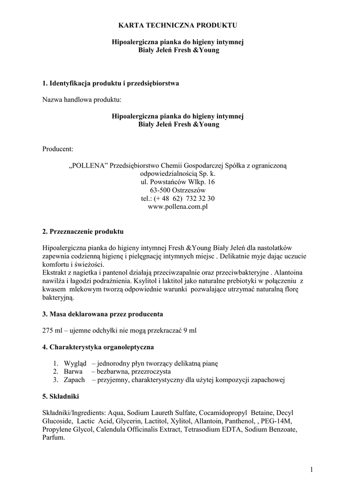KARTA TECHNICZNA PRODUKTU Hipoalergiczna pianka do higieny intymnej Biały Jeleń Fresh &Young 1. Identyfikacja produktu i przedsiębiorstwa Nazwa handlowa produktu: Hipoalergiczna pianka do higieny intymnej Biały Jeleń Fresh &Young Producent: „POLLENA” Przedsiębiorstwo Chemii Gospodarczej Spółka z ograniczoną odpowiedzialnością Sp. k. ul. Powstańców Wlkp. 16 63-500 Ostrzeszów tel.: (+ 48 62) 732 32 30 www.pollena.com.pl 2. Przeznaczenie produktu Hipoalergiczna pianka do higieny intymnej Fresh &Young Biały Jeleń dla nastolatków zapewnia codzienną higienę i pielęgnację intymnych miejsc . Delikatnie myje dając uczucie komfortu i świeżości. Ekstrakt z nagietka i pantenol działają przeciwzapalnie oraz przeciwbakteryjne . Alantoina nawilża i łagodzi podrażnienia. Ksylitol i laktitol jako naturalne prebiotyki w połączeniu z kwasem mlekowym tworzą odpowiednie warunki pozwalające utrzymać naturalną florę bakteryjną. 3. Masa deklarowana przez producenta 275 ml – ujemne odchyłki nie mogą przekraczać 9 ml 4. Charakterystyka organoleptyczna 1. Wygląd – jednorodny płyn tworzący delikatną pianę 2. Barwa – bezbarwna, przezroczysta 3. Zapach – przyjemny, charakterystyczny dla użytej kompozycji zapachowej 5. Składniki Składniki/Ingredients: Aqua, Sodium Laureth Sulfate, Cocamidopropyl Betaine, Decyl Glucoside, Lactic Acid, Glycerin, Lactitol, Xylitol, Allantoin, Panthenol, , PEG-14M, Propylene Glycol, Calendula Officinalis Extract, Tetrasodium EDTA, Sodium Benzoate, Parfum. 1 KARTA TECHNICZNA PRODUKTU Hipoalergiczna pianka do higieny intymnej Biały Jeleń Fresh &Young 6. Parametry fizykochemiczne 1. pH 1 % roztworu wodnego 4,0 – 6,0 2. Zawartość substancji rozpuszczalnych w alkoholu etylowym, % 5,5 – 7,0 7. Okres trwałości 2 lata od daty produkcji. Po tym okresie może być stosowana po sprawdzeniu zgodności parametrów z wymaganiami normy zakładowej ZN. 8. Przechowywanie Należy przechowywać w suchych, czystych i krytych pomieszczeniach. Przechowywać w zakresie temperatury od 5 ºC do 35 ºC. Chronić przed działaniem mrozu. 9. Sposób użycia Niewielką ilością pianki umyć intymne części ciała, dokładnie spłukać wodą 10. Uzyskane atesty Posiada Ocenę Bezpieczeństwa Kosmetyku i badania dermatologiczne. Notyfikacja CPNP (Cosmetic Products Notification Portal) - Nr referencyjny: 1225429 PKWiU: 20.42.19.0 Opracował: Data wydania karty: Zaktualizował: Izabela Świątek 29.02.2012 Alicja Jamroży-Cyba 09.01.2014 Data aktualizacji: 2