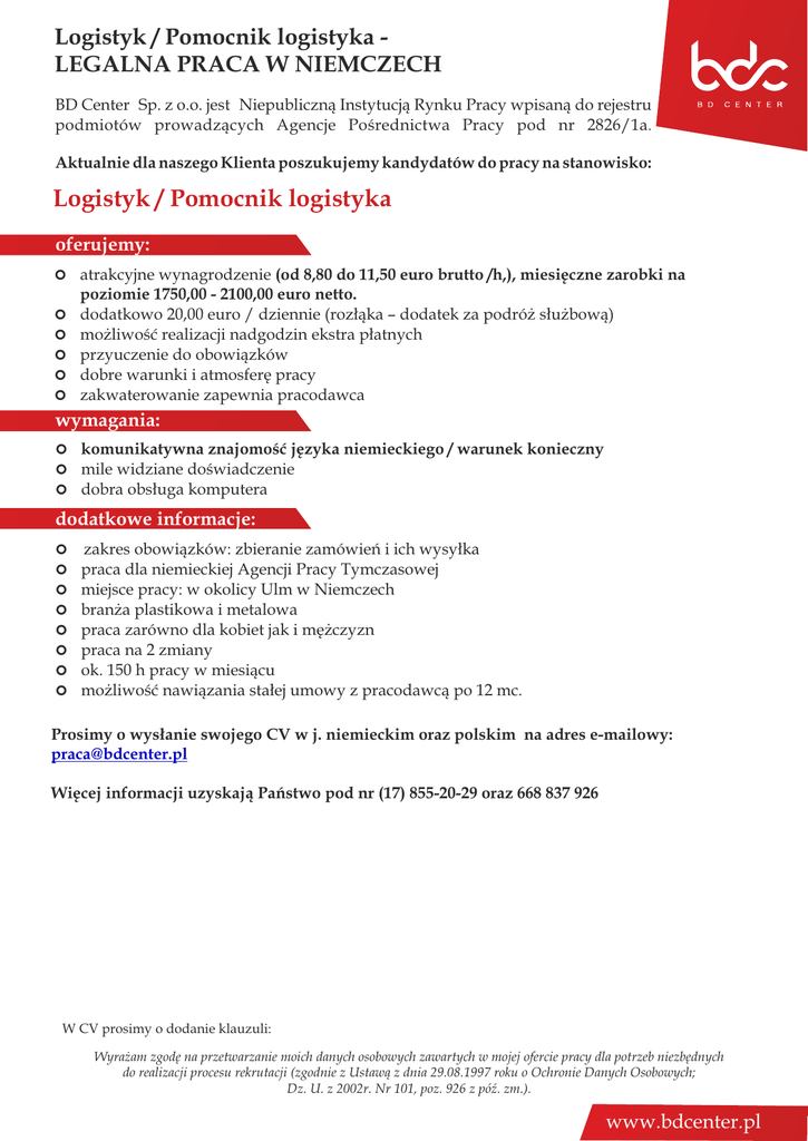 Logistyk / Pomocnik logistyka LEGALNA PRACA W NIEMCZECH BD Center Sp. z o.o. jest Niepubliczną Instytucją Rynku Pracy wpisaną do rejestru podmiotów prowadzących Agencje Pośrednictwa Pracy pod nr 2826/1a. Aktualnie dla naszego Klienta poszukujemy kandydatów do pracy na stanowisko: Logistyk / Pomocnik logistyka oferujemy: ˘ atrakcyjne wynagrodzenie (od 8,80 do 11,50 euro brutto /h,), miesięczne zarobki na ˘ ˘ ˘ ˘ ˘ poziomie 1750,00 - 2100,00 euro netto. dodatkowo 20,00 euro / dziennie (rozłąka – dodatek za podróż służbową) możliwość realizacji nadgodzin ekstra płatnych przyuczenie do obowiązków dobre warunki i atmosferę pracy zakwaterowanie zapewnia pracodawca wymagania: ˘ komunikatywna znajomość języka niemieckiego / warunek konieczny ˘ mile widziane doświadczenie ˘ dobra obsługa komputera dodatkowe informacje: ˘ ˘ ˘ ˘ ˘ ˘ ˘ ˘ zakres obowiązków: zbieranie zamówień i ich wysyłka praca dla niemieckiej Agencji Pracy Tymczasowej miejsce pracy: w okolicy Ulm w Niemczech branża plastikowa i metalowa praca zarówno dla kobiet jak i mężczyzn praca na 2 zmiany ok. 150 h pracy w miesiącu możliwość nawiązania stałej umowy z pracodawcą po 12 mc. Prosimy o wysłanie swojego CV w j. niemieckim oraz polskim na adres e-mailowy: [email protected] Więcej informacji uzyskają Państwo pod nr (17) 855-20-29 oraz 668 837 926 W CV prosimy o dodanie klauzuli: Wyrażam zgodę na przetwarzanie moich danych osobowych zawartych w mojej ofercie pracy dla potrzeb niezbędnych do realizacji procesu rekrutacji (zgodnie z Ustawą z dnia 29.08.1997 roku o Ochronie Danych Osobowych; Dz. U. z 2002r. Nr 101, poz. 926 z póź. zm.). www.bdcenter.pl