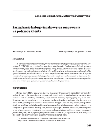 WS P Ó Ł C Z E S N A E K O N O M I A Nr 4/2010(16) Agnieszka Biernat-Jarka*, Katarzyna Świerczyńska** Zarządzanie kategorią jako wyraz reagowania na potrzeby klienta Nadesłany: 17 września 2010 r. Zaakceptowany: 16 grudnia 2010 r. Streszczenie W opracowaniu przedstawiono proces zarządzania kategorią produktów szybko zbywalnych (FMCG), na przykładzie wyrobów tytoniowych. Omówiono założenia procesu opracowane przez dwie współpracujące ze sobą firmy. Zaprezentowane wyniki pokazują, iż proces zarządzania kategorią jest niezwykle ważnym działaniem w realizacji celów sprzedażowych przedsiębiorstwa, a także zaspokajania potrzeb konsumentów. W wyniku wdrożenia procesu zarządzania kategorią wyrobów tytoniowych nastąpiło zwiększenie liczby klientów odwiedzających punkty sprzedaży, zwiększenie ilości sprzedawanych produktów, a w końcowym efekcie zwiększenie zysku przedsiębiorstwa. Wprowadzenie Rynek dóbr FMCG (ang. Fast Moving Consumer Goods), czyli produktów szybko zbywalnych czy szybko rotujących, w ostatnich latach stał się bardzo konkurencyjny. Konsumenci stali się bardziej świadomi, a tym samym bardziej wymagający, stąd sieci detaliczne zmuszone zostały do przystosowania się do zmieniających się potrzeb. Sytuacja rynkowa zobligowała producentów i detalistów do podjęcia działań na płaszczyźnie partnerskiej, by wspólnie spełniać oczekiwania konsumentów, a jednocześnie realizować przy tym swoje cele sprzedażowe. Dlatego też, coraz częściej producenci i detaliści podejmują decyzje o konieczności wdrożenia procesu zarządzania kategorią. Proces ten wymaga podjęcia ścisłej współpracy pomiędzy producentem a detalistą, czego efektem jest zwiększenie liczby klientów i zysków dla obu współpracujących firm. * ** Dr, adiunkt, Szkoła Główna Gospodarstwa Wiejskiego w Warszawie. Mgr, Szkoła Główna Gospodarstwa Wiejskiego w Warszawie. 249 WS P Ó Ł C Z E S N A E K O N O M I A Nr 4/2010(16) Celem opracowania jest zaprezentowanie zarządzania kategorią, jako niezbędnego procesu w realizacji celów sprzedażowych przedsiębiorstwa, a także zaspokajania potrzeb konsumentów i efektywnego reagowania na nie. 1. Kształtowanie się rynku FMCG w Polsce w latach 2005–2008 Polski rynek dóbr FMCG w latach 2005–2008 rozwinął się bardzo dynamicznie pod względem liczby punktów sprzedających te produkty, a także liczby producentów funkcjonujących na rynku. Pod koniec 2006 r. funkcjonowało w Polsce 240 tys. punktów sprzedających dobra FMCG, z czego 120 tys. punktów sprzedawało wyłącznie artykuły spożywcze, a około 31 tys. punktów specjalizowało się w sprzedaży kosmetyków oraz chemii gospodarczej (Strategic Report, 2007: 9–12). W latach 2003–2008 najdynamiczniej rozwinął się kanał hipermarketów. Wzrósł on o 43,2%, z poziomu 148 placówek do 229. Znacząco wzrosła także liczba supermarketów, stacji paliw ze sklepami zlokalizowanymi w obrębie stacji oraz aptek. Zmniejszyła się liczba kiosków, sklepów specjalizujących się w sprzedaży kosmetyków oraz osiedlowych sklepów spożywczych. Na polskim rynku zaczęły dominować silniejsze i bardziej rozwojowe punkty sprzedaży, szczególnie te, które należą do konkretnej sieci. Na podstawie badań przeprowadzonych w 2008 r. przez firmę MEMRB stwierdzono, że głównymi punktami sprzedającymi żywność są sklepy spożywcze, które stanowią łącznie 23,7% udziału w całkowitej liczbie punktów sprzedających żywność (Zwyczaje zakupowe, 2009: 4). Natomiast głównymi punktami sprzedającymi artykuły „niespożywcze” są drogerie i stanowią one aż 30% udział w liczbie sklepów oferujących asortyment FMCG „niespożywczy”. Przy tak silnie rozwiniętym rynku, nasuwa się pytanie: w jaki sposób konsumenci wybierają dany punkt sprzedaży do robienia zakupów? Badania przeprowadzone przez firmy MEMRB oraz GfK Polonia wykazały, że konsumenci dzielą sklepy spożywcze na pięć grup (Zwyczaje zakupowe, 2009: 8; Strategic Report …, 2007: 14). Zdaniem respondentów największą grupę sklepów spożywczych stanowią hipermarkety, takie jak: Real, Tesco, Carrefour, Auchan, które postrzegane są przez klientów, jako punkty oferujące bardzo szeroki asortyment produktów, mające atrakcyjne promocje i ceny sprzedaży, a także dogodne godziny otwarcia. Drugą grupę stanowią supermarkety, w skład których, zdaniem badanych, wchodzą znane sieci sklepów, jak: Lewiatan, Polomarket, Kaufland, a także Lidl. Kojarzone są one jako sklepy, gdzie można łatwo znaleźć produkty, oferowane są polskie wyroby, są widoczne i czytelne ceny. Trzecią grupą są delikatesy, np.: Alma, Bomi oraz Piotr i Paweł, które są postrzegane jako sklepy dbające o czystość, estetykę, z bardzo dobrą ofertą produktową, jednakże charakteryzujące się wyższym poziomem cen niż wyżej wymienione grupy. Kolejną grupę stanowią sklepy sieciowe, osiedlowe, do których konsumenci zaliczają Stokrotkę, Społem, ABC oraz Żabkę, uważając je za miejsce, gdzie szybko i łatwo można zrobić zakupy ze względu na brak kolejek do kas. Ostatnia grupa to sklepy dyskontowe i tutaj konsumenci wyróżniają tylko sieć Biedronka, jako sklepy z niskimi cenami oraz silną marką (Zwyczaje zakupowe, 2009: 250 Nr 4/2010(16) WS P Ó Ł C Z E S N A E K O N O M I A 15). Właśnie Biedronka wśród konsumentów była najpopularniejszym miejscem do robienia zakupów. W 2009 r. firma MEMRB (Zwyczaje zakupowe, 2009: 15) przeprowadziła badania ilościowe wśród 1000 respondentów, stosując metodologię CATI (ang. Computer Assisted Telephone Interviewing). Badanie to polegało na telefonicznych wywiadach przeprowadzonych przez ankieterów. W wyniku przeprowadzonych wywiadów okazało się, że konsumenci ze względu na kryzys gospodarczy oraz chęć zaoszczędzenia gotówki na zakupach produktów codziennego użytku, coraz częściej wybierają 