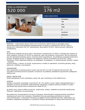 DOM na SPRZEDAŻ 520 000 Borowo 176 m2 1082/260/ODS Secondary 700 154 2005 6 VeryGood Detached 1 Opis BOROWO - miejscowość leżąca około 5 km od Żukowa. Oferta dotyczy sprzedaży domu jednorodzinnego wolnostojącego posadowionego na działce o powierzchni 700 m2. Dom o powierzchni użytkowej 154 m2, wybudowany wg projektu W-0512. Nieruchomość całkowicie umeblowana. OPIS Na parterze znajduje się duży salon z kominkiem o powierzchni 31,63m2 z którego jest wyjście na taras, jadalnia, kuchnia (11,41m2) ze spiżarnią, sień oraz łazienka z prysznicem. Na tym poziomie jest też jednostanowiskowy garaż i pomieszczenie gospodarcze. Na poddasze prowadzą drewniane schody. Znajduje się tam 5 sypialni oraz łazienka z wanną. W budynku są okna PCV, drzwi drewniane, drzwi wejściowe stalowe, na podłogach na poddaszu i w salonie panele, łazienki i parter - terakota. Kuchnia widna, z oknem na furtkę, wyposażona w meble w zabudowie, kuchenkę gazową, okap, piekarnik, lodówkę z zamrażarką. OGRZEWANIE Dom ogrzewany za pomocą pieca na gaz, jest też piec na miał. W salonie jest kominek. We wszystkich pomieszczeniach grzejniki, w łazience na poddaszu dodatkowo ogrzewanie podłogowe elektryczne. MEDIA I INSTALACJE Woda (dodatkowo licznik ogrodowy), prąd, siła, gaz, kanalizacja, linia telefoniczna. DZIAŁKA Działka w kształcie prostokąta o wymiarach 20 x 35, płaska, sucha, ładnie zagospodarowana, z wjazdem od strony zachodniej. Nieruchomość ogrodzona, podjazd wyłożony kostką. W części ogrodowej jest wysoki taras o powierzchni około 20 m2. W okolicy lasy, jeziora (500m od domu), restauracje, sklepy, niedaleko przystanek autobusowy. Polecam i zapraszam na prezentację. Nie pobieramy wynagrodzenia od strony kupującej. Gwarantujemy bezpieczeństwo wszystkich realizowanych przez nas transakcji. Posiadamy licencję zawodową pośrednika w obrocie nieruchomościami, a wszystkie transakcje są objęte ochroną ubezpieczeniową. Zapraszamy do kontaktu, bezpłatnie pomagamy w uzyskaniu kredytu bankowego na zakup nieruchomości oraz HORYZONT Nieruchomości Krystian Szpinek służymy pomocą i doradztwem w zakresie objętym planowaną przez Państwa inwestycją. Patrycja Dopka tel. 515-29-29-70 email: [email protected] HORYZONT Nieruchomości Krystian Szpinek Powered by TCPDF (www.tcpdf.org)