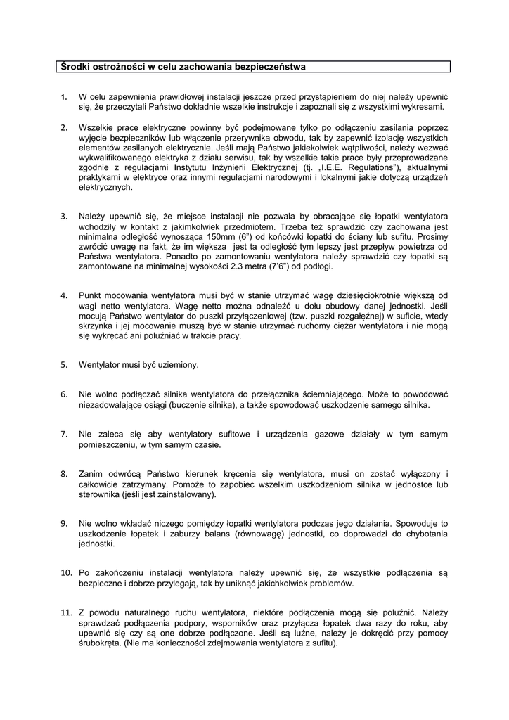 Środki ostrożności w celu zachowania bezpieczeństwa 1. W celu zapewnienia prawidłowej instalacji jeszcze przed przystąpieniem do niej należy upewnić się, że przeczytali Państwo dokładnie wszelkie instrukcje i zapoznali się z wszystkimi wykresami. 2. Wszelkie prace elektryczne powinny być podejmowane tylko po odłączeniu zasilania poprzez wyjęcie bezpieczników lub włączenie przerywnika obwodu, tak by zapewnić izolację wszystkich elementów zasilanych elektrycznie. Jeśli mają Państwo jakiekolwiek wątpliwości, należy wezwać wykwalifikowanego elektryka z działu serwisu, tak by wszelkie takie prace były przeprowadzane zgodnie z regulacjami Instytutu Inżynierii Elektrycznej (tj. „I.E.E. Regulations”), aktualnymi praktykami w elektryce oraz innymi regulacjami narodowymi i lokalnymi jakie dotyczą urządzeń elektrycznych. 3. Należy upewnić się, że miejsce instalacji nie pozwala by obracające się łopatki wentylatora wchodziły w kontakt z jakimkolwiek przedmiotem. Trzeba też sprawdzić czy zachowana jest minimalna odległość wynosząca 150mm (6”) od końcówki łopatki do ściany lub sufitu. Prosimy zwrócić uwagę na fakt, że im większa jest ta odległość tym lepszy jest przepływ powietrza od Państwa wentylatora. Ponadto po zamontowaniu wentylatora należy sprawdzić czy łopatki są zamontowane na minimalnej wysokości 2.3 metra (7’6”) od podłogi. 4. Punkt mocowania wentylatora musi być w stanie utrzymać wagę dziesięciokrotnie większą od wagi netto wentylatora. Wagę netto można odnaleźć u dołu obudowy danej jednostki. Jeśli mocują Państwo wentylator do puszki przyłączeniowej (tzw. puszki rozgałęźnej) w suficie, wtedy skrzynka i jej mocowanie muszą być w stanie utrzymać ruchomy ciężar wentylatora i nie mogą się wykręcać ani poluźniać w trakcie pracy. 5. Wentylator musi być uziemiony. 6. Nie wolno podłączać silnika wentylatora do przełącznika ściemniającego. Może to powodować niezadowalające osiągi (buczenie silnika), a także spowodować uszkodzenie samego silnika. 7. Nie zaleca się aby wentylatory sufitowe i urządzenia gazowe działały w tym samym pomieszczeniu, w tym samym czasie. 8. Zanim odwrócą Państwo kierunek kręcenia się wentylatora, musi on zostać wyłączony i całkowicie zatrzymany. Pomoże to zapobiec wszelkim uszkodzeniom silnika w jednostce lub sterownika (jeśli jest zainstalowany). 9. Nie wolno wkładać niczego pomiędzy łopatki wentylatora podczas jego działania. Spowoduje to uszkodzenie łopatek i zaburzy balans (równowagę) jednostki, co doprowadzi do chybotania jednostki. 10. Po zakończeniu instalacji wentylatora należy upewnić się, że wszystkie podłączenia są bezpieczne i dobrze przylegają, tak by uniknąć jakichkolwiek problemów. 11. Z powodu naturalnego ruchu wentylatora, niektóre podłączenia mogą się poluźnić. Należy sprawdzać podłączenia podpory, wsporników oraz przyłącza łopatek dwa razy do roku, aby upewnić się czy są one dobrze podłączone. Jeśli są luźne, należy je dokręcić przy pomocy śrubokręta. (Nie ma konieczności zdejmowania wentylatora z sufitu). INFORMACJA: Ważne środki ostrożności i instrukcje podane w niniejszej Instrukcji Obsługi nie dotyczą wszystkich możliwie występujących warunków i sytuacji jakie mogą zaistnieć. Trzeba zrozumieć że zdrowy rozsądek, rozwaga i troska są czynnikami, które muszą być uwzględniane przy każdym produkcie. Czynniki te dotyczą w szczególności osób, które używają taką jednostkę i dbają o nią. Po porady w sprawie instalacji lub jeśli nastąpi uszkodzenie albo w sytuacji gdy brakuje jakiejś części, prosimy dzwonić pod: INFOLINIA : ( 01959) 564 440 Dostarczane części Jedno urządzenie z silnikiem wentylatora, Jedna okrągła płytka zaopatrzona w kostkę łączącą i górne podkładki gumowe, Jeden zestaw łopatek, Jeden zestaw uchwytów (nośników) łopatek, Jedno opakowanie ze śrubami i wkrętami z zestawem do utrzymywania balansu (równowagi), Jeden kawałek delikatnego materiału (takiego jak do czyszczenia szkieł w okularach), Jedna książeczka z Instrukcją Obsługi do instalacji, Jeden zestaw: rozgałęźnik z 3 lampkami z użyciem żarówek halogenowych typu GU-10, Trzy żarówki GU-10. Wymagane narzędzia i materiały Śrubokręt krzyżakowy, Śrubokręt płaski, Mały śrubokręt elektryczny, Elektryczne szczypce /obcęgi, Drabina, Przewody zasilające, takie jak są wymagane przez aktualne praktyki w elektryce, Zaciski utrzymujące przewody w linii lub inne odpowiednie złączki, jeśli ma być zamocowana przedłużka o wymiarze 760mm (30 cali). Przed rozpoczęciem użytkowania urządzenia i instalacją Państwa wentylatora, prosimy upewnić się, że zapoznali się Państwo ze środkami ostrożności dotyczącymi zachowania bezpieczeństwa i że w pełni je Państwo zrozumieli. Trudności podczas instalacji, brakujące lub uszkodzone części Jeśli wystąpiły u Państwa jakiekolwiek trudności podczas instalacji wentylatora/lampy albo w sytuacji gdy nieopatrznie Państwa wentylator został dostarczony bez jakiś części lub uszkodzony, prosimy skontaktować się z naszą infolinią pod numerem ( 01959 564440). Z wielką przyjemnością pomożemy Państwu lub natychmiast dostarczymy do Państwa części zamienne. W każdym przypadku zgłoszenia prosimy poda numer referencyjny modelu, kolor jednostki oraz nazwę brakującej/ uszkodzonej części. INFOLINIA 01959 564440 Nazwy części i ich względne rozmieszczenie Poniżej przedstawiamy kroki, które doprowadzą Państwa do pomyślnej instalacji: 1. 2. 3. 4. 5. 6. Zainstalowanie płytki montażowej Podłączenie zestawu oświetleniowego Montaż urządzenia Instrukcje dotyczące podłączenia przewodów Składanie łopatek Montaż złożonych łopatek do wentylatora 1. Zainstalowanie płytki montażowej Płytka montażowa powinna zostać przykręcona do, mocnej, płaskiej powie