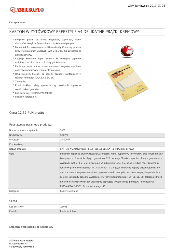 Góry Tarnowskie 2017-03-08 Karta produktu: KARTON WIZYTÓWKOWY FREESTYLE A4 DELIKATNE PRĄŻKI KREMOWY Elegancki papier do druku wizytówek, zaproszeń, menu, dyplomów, certyfikatów oraz innych druków kreatywnych. Format A4. Ryzy o gramaturze 120 zawierają 50 arkuszy papieru. Ryzy w gramaturach wyższych: 220, 240, 246, 250 zawierają 25 arkuszy kartonu. Kolekcja FreeStyle Paper zawiera 39 rodzajów papierów ozdobnych w 13 fakturach i 7 lśniących kolorach. Papiery przeznaczone są do druku atramentowego (za wyjątkiem papierów metalizowanych) oraz laserowego. Uzupełnieniem kolekcji są koperty ozdobne występujące w różnych formatach (C4, C5, C6, DL, Q). Zalecenia: Przed drukiem należy sprawdzić czy urządzenie dopuszcza wysoki zakres gramatur. Kod dostawcy: FS30/A4/TWL240/02 Strona w katalogu: 43 Cena 12,52 PLN brutto Podstawowe parametry produktu Numer produktu w systemie 34011 Nr dostawcy SZ1390 Nr Celcen 14-00967 Kod kreskowy Nazwa produktu KARTON WIZYTÓWKOWY FREESTYLE A4 DELIKATNE PRĄŻKI KREMOWY Opis Elegancki papier do druku wizytówek, zaproszeń, menu, dyplomów, certyfikatów oraz innych druków kreatywnych.; Format A4. Ryzy o gramaturze 120 zawierają 50 arkuszy papieru. Ryzy w gramaturach wyższych: 220, 240, 246, 250 zawierają 25 arkuszy kartonu.; Kolekcja FreeStyle Paper zawiera 39 rodzajów papierów ozdobnych w 13 fakturach i 7 lśniących kolorach.; Papiery przeznaczone są do druku atramentowego (za wyjątkiem papierów metalizowanych) oraz laserowego.; Uzupełnieniem kolekcji są koperty ozdobne występujące w różnych formatach (C4, C5, C6, DL, Q).; Zalecenia:; Przed drukiem należy sprawdzić czy urządzenie dopuszcza wysoki zakres gramatur.; Kod dostawcy: FS30/A4/TWL240/02; Strona w katalogu: 43 Kategoria Papiery specjalne Cecha Kod dostawcy .01948 Produkt Papier ozdobny Serdecznie zapraszamy do współpracy A-Z Biuro Adam Watoła ul. Oświęcimska 3 41-600 Góry Tarnowskie Góry Tarnowskie 2017-03-08 A-Z Biuro Adam Watoła zespół. A-Z Biuro Adam Watoła ul. Oświęcimska 3 41-600 Góry Tarnowskie