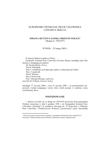 EUROPEJSKI TRYBUNAŁ PRAW CZŁOWIEKA CZWARTA SEKCJA SPRAWA HUTTEN-CZAPSKA PRZECIW POLSCE1 (Skarga nr 35014/97) WYROK – 22 lutego 2005 r. W sprawie Hutten-Czapska p. Polsce, Europejski Trybunał Praw Człowieka (Czwarta Sekcja) zasiadając jako Izba złożona z następujących sędziów: Sir Nicolas Bratza, Prezes, Pan M. Pellonpää, Pani V. Strážnická, powołana jako sędzia w odniesieniu do Polski, Pan J. Casadevall, Pan R. Maruste, Pan S. Pavlovschi, Pan J. Borrego Borrego, sędziowie, oraz Pan M. O’Boyle, Kanclerz Sekcji, obradując 27 stycznia 2004 r. oraz 25 stycznia 2005 r. na posiedzeniach niejawnych, wydaje następujący wyrok, który został przyjęty w ostatniej, wyżej wymienionej, dacie: POSTĘPOWANIE 1. Sprawa wywodzi się ze skargi (nr 35014/97) przeciwko Rzeczypospolitej Polskiej wniesionej w dniu 6 grudnia 1994 r. do Europejskiej Komisji Praw Człowieka („Komisja”) na podstawie dawnego art. 25 Konwencji o Ochronie Praw Człowieka i Podstawowych Wolności („Konwencja”) przez obywatelkę Wyrok ten stanie się prawomocny zgodnie z warunkami określonymi przez artykuł 44 § 2 Konwencji. Niniejsze tłumaczenie pochodzi z Ministerstwa Spraw Zagranicznych 1 francuską polskiego pochodzenia panią Marię Hutten-Czapską. 2. Skarżąca była reprezentowana przez pana B. Sochańskiego, adwokata praktykującego w Szczecinie w Polsce. Polski Rząd („Rząd”) był reprezentowany przez pełnomocnika pana J. Wołąsiewicza z Ministerstwa Spraw Zagranicznych. 3. Skarżąca zarzucała w szczególności, że sytuacja stworzona w wyniku stosowania ustaw nakładających na właścicieli budynków ograniczenia w odniesieniu do podwyższania czynszu oraz wypowiedzenia stosunku najmu nawiązanego na podstawie decyzji administracyjnej stanowiła naruszenie art. 1 Protokołu nr 1 do Konwencji. 4. Skarga została przekazana do Trybunału w dniu 1 listopada 1998 r., kiedy wszedł w życie Protokół nr 11 do Konwencji (art. 5 § 2 Protokołu nr 11). 5. Skarga została przydzielona Czwartej Sekcji Trybunału (art. 52 § 1 Regulaminu Trybunału). Wewnątrz tej Sekcji ustanowiono Izbę (art. 27 § 1 Konwencji), która miała zająć się sprawą zgodnie z artykułem 26 § 1 Regulaminu Trybunału. 6. Dnia 1 listopada 2001 r. Trybunał zmienił skład Sekcji (art. 25 § 1 Regulaminu). Niniejsza sprawa została przydzielona do nowo utworzonej Czwartej Sekcji (artykuł 52 § 1). 7. Pan L. Garlicki, sędzia wybrany w odniesieniu do Polski, wyłączył się od rozpoznania sprawy (art. 28 Regulaminu). W związku z tym Rząd wskazał panią V. Strážnicką, wybraną jako sędzia w odniesieniu do Republiki Słowackiej, do pełnienia funkcji sędziego (art. 27 § 2 Konwencji oraz art. 29 § 1 Regulaminu). 8. Decyzją z 16 września 2003 r. Trybunał uznał skargę za częściowo dopuszczalną. 9. Zarówno skarżąca, jak i Rząd złożyli stanowiska odnośnie meritum skargi (art. 59 § 1). 10. Dnia 16 stycznia 2004 r. Rząd Francji poinformował Trybunał, że nie skorzysta z prawa interwencji strony trzeciej (art. 36 § 1 Konwencji oraz art. 44 § 1 Regulaminu Trybunału). 11. Rozprawa w przedmiocie meritum sprawy odbyła się w Budynku Praw Człowieka w Strasburgu dnia 27 stycznia 2004 r. (art. 59 § 3). W trakcie rozprawy wystąpili: (a) w imieniu Rządu Pan J. Wołąsiewicz, Pełnomocnik, Pan L. Łukasik, Pan A. Bojańczyk, Doradcy; (b) w imieniu skarżącej Pan B. SOCHAŃSKI, Adwokat, Pan P. PASZKOWSKI, Doradca. 2 Trybunał wysłuchał ich wystąpień. 12. Na rozprawie strony zostały poproszone o przedłożenie kolejnych stanowisk na piśmie. Rząd złożył swoje obserwacje 19 lutego i 31 marca 2004 r. Skarżąca złożyła swoje pisma procesowe 19 lutego, 11 marca i 20 kwietnia 2004 r. 13. 30 września 2004 r. Polskie Zrzeszenie Lokatorów złożyło w Kancelarii wniosek o zezwolenie na przedłożenie pisemnych uwag co do meritum sprawy w kontekście ogólnej sytuacji w Polsce (art. 36 § 2 Konwencji oraz art. 44 § 2 Regulaminu Trybunału). Przewodniczący Izby odrzucił wniosek 19 października 2004 r. 14. 4 października 2004 r. Kanclerz Sekcji działając zgodnie z instrukcjami Przewodniczącego Czwartej Sekcji, zwrócił uwagę stron na fakt, że sprawa została uznana za „sprawę pilotażową” w celu rozstrzygnięcia, czy zakwestionowany system regulacji czynszu był zgodny z wymogami art. 1 Protokołu nr 1. 15. 1 listopada 2004 r. Trybunał zmienił skład sekcji (art. 25 § 1), ale niniejsza sprawa pozostała w gestii Izby utworzonej w ramach dawnej Sekcji IV. Następnie na wniosek Rządu strony zostały poproszone o przedłożenie pisemnych uwag co do meritum sprawy w świetle nowych wydarzeń w kraju. Rząd przedłożył swoje obserwacje 4 listopada 2004 r., a skarżąca 5 listopada 2004 r. FAKTY I. OKOLICZNOŚCI SPRAWY 16. Skarżąca, która jest obywatelką francuską polskiego pochodzenia, urodziła się w 1931 r. i mieszka obecnie w Andresy we Francji. Jest właścicielką budynku i przynależnej do niego nieruchomości w Gdyni w Polsce. Nieruchomość należała uprzednio do jej rodziców. A. Sytuacja ogólna 17. Polskie ustawodawstwo dotyczące regulacji czynszu jest konsekwencją okoliczności historycznych i współczesnych. Reżim ustawowy ograniczający prawa właścicieli budynków oraz regulujący wzrost czynszu działał już przed II wojną światową. Poniższy opis sytuacji ogólnej został oparty o rozstrzygnięcia polskiego Trybunału Konstytucyjnego, który 12 stycznia 2000 r. przedstawił w jednym ze swoich wyroków dotyczących zgodności z Konstytucją niektórych aspektów ustawodawstwa w zakresie regulacji czynszu dogłębne rozważania na 3 temat historycznych uwarunkowań tych przepisów oraz czynników powodujących utrzymanie ograniczeń wywodzących się z wczesnych lat reżimu komunistycznego w Polsce. 18. System regulacji czynszu był skutkiem wprowadzenia przez byłe władze komunistyczne tzw. publicznej gospodarki lokalami (zob. paragra