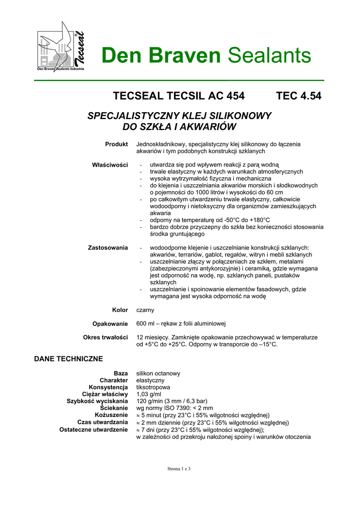 Den Braven Sealants TECSEAL TECSIL AC 454 TEC 4.54 SPECJALISTYCZNY KLEJ SILIKONOWY DO SZKŁA I AKWARIÓW Produkt Właściwości Jednoskładnikowy, specjalistyczny klej silikonowy do łączenia akwariów i tym podobnych konstrukcji szklanych - Zastosowania - Kolor Opakowanie Okres trwałości utwardza się pod wpływem reakcji z parą wodną trwale elastyczny w każdych warunkach atmosferycznych wysoka wytrzymałość fizyczna i mechaniczna do klejenia i uszczelniania akwariów morskich i słodkowodnych o pojemności do 1000 litrów i wysokości do 60 cm po całkowitym utwardzeniu trwale elastyczny, całkowicie wodoodporny i nietoksyczny dla organizmów zamieszkujących akwaria odporny na temperaturę od -50°C do +180°C bardzo dobrze przyczepny do szkła bez konieczności stosowania środka gruntującego wodoodporne klejenie i uszczelnianie konstrukcji szklanych: akwariów, terrariów, gablot, regałów, witryn i mebli szklanych uszczelnianie złączy w połączeniach ze szkłem, metalami (zabezpieczonymi antykorozyjnie) i ceramiką, gdzie wymagana jest odporność na wodę, np. szklanych paneli, pustaków szklanych uszczelnianie i spoinowanie elementów fasadowych, gdzie wymagana jest wysoka odporność na wodę czarny 600 ml – rękaw z folii aluminiowej 12 miesięcy. Zamknięte opakowanie przechowywać w temperaturze od +5°C do +25°C. Odporny w transporcie do –15°C. DANE TECHNICZNE Baza Charakter Konsystencja Ciężar właściwy Szybkość wyciskania Ściekanie Kożuszenie Czas utwardzania Ostateczne utwardzenie silikon octanowy elastyczny tiksotropowa 1,03 g/ml 120 g/min (3 mm / 6,3 bar) wg normy ISO 7390: < 2 mm ≈ 5 minut (przy 23°C i 55% wilgotności względnej) ≈ 2 mm dziennie (przy 23°C i 55% wilgotności względnej) ≈ 7 dni (przy 23°C i 55% wilgotności względnej); w zależności od przekroju nałożonej spoiny i warunków otoczenia Strona 1 z 3 TECSEAL TECSIL AC 454, TEC 4.54 Skurcz Dopuszczalne odkształcenia Twardość Shore A Moduł 100% Wytrzymałość przy zerwaniu Wydłużenie przy zerwaniu Odporność termiczna po utwardzeniu Możliwość malowania Maksymalna wytrzymałość przy zerwaniu < 5% ± 25% wg normy DIN 53505: 25° wg normy DIN 53504: 0,6 MPa (N/mm²) wg DIN 53504: 1,9 MPa (N/mm²) wg DIN 53504: 470% od –50°C do +180°C nie 13 kg/cm² PODŁOŻA Typowe podłoża Przygotowanie Stan podłoża szkło, ceramika, anodowane lub lakierowane proszkowo aluminium i inne metale (zabezpieczone antykorozyjnie) oraz tym podobne powierzchnie szkliwione, emaliowane lub glazurowane Usunąć z podłoża tłuszcze, brud i inne zanieczyszczenia. Szkło musi być idealnie czyste. Do czyszczenia poleca się zastosować Den Braven Glass Cleaner i suchą szmatkę, którą należy często zmieniać. Oczyszczonych powierzchni nie dotykać palcami. Do czyszczenie nie stosować wody z mydłem (pozostałości mydła mogą osłabić przyczepność kleju). Powierzchnia czysta, odtłuszczona i sucha SPOSÓB UŻYCIA Narzędzia Pistolety ręczne lub pneumatyczne Temperatura otoczenia od +5°C do +30°C (dotyczy okresu od momentu aplikacji kleju do jego całkowitego utwardzenia) - przy wyższej temperaturze zwiększa się ryzyko kondensacji pary wodnej na szkle i osłabienia tym samym przyczepności kleju do podłoża Zalecenia Zdjąć nakrętkę, uciąć wierzchołek kartusza powyżej gwintu, potem nakręcić końcówkę i uciąć na szerokość odpowiadającą wielkości spoiny. W celu doboru grubości dna i boków akwarium stosować się do normy DIN 32622. Zalecana minimalna grubość spoiny między bokami oraz bokami a dnem wynosi 2 mm. Fugę wygładzić szpachelką w ciągu 5 minut od nałożenia kleju. Dobrym środkiem pomocniczym jest Den Braven Finisher - profesjonalny środek do wygładzania fug na mokro lub roztwór wody z domieszką detergentu (neutralny chemicznie). Spoiny narożne od wewnątrz akwarium uformować na kształt trójkąta w przekroju, tak by ich szerokość wynosiła od 3 do 5 mm (w zależności od wysokości słupa wody). Akwarium nie wolno napełniać wodą ani transportować przed całkowitym utwardzeniem kleju (ok. 7 dni). Przed napełnieniem akwarium dokładnie wypłukać wodą. Czyszczenie Do czyszczenia rąk, narzędzi czy powierzchni zaleca się użyć specjalne ściereczki czyszczące Den Braven Bravo. Ewentualnie do mycia narzędzi po zakończeniu pracy można stosować terpentynę, benzynę ekstrakcyjną lub środek Den Braven MEK Cleaner. Do mycia rąk można także użyć środek Den Braven Handfris. Utwardzony silikon można usunąć przy pomocy środka Den Braven Sili-Kill. Strona 2 z 3 TECSEAL TECSIL AC 454, TEC 4.54 Ograniczenia Bezpieczeństwo ogólne ATEST Nie stosować do akwariów o pojemności przekraczającej 1000 litrów i wysokości ponad 60 cm. Nie malować fug. Złącza między podłożami szklanymi mogą zawierać drobne pęcherzyki powietrza, które pozostają widoczne po utwardzeniu. Nie stosować w słabo wentylowanych miejscach (zapewnić dostęp wilgoci atmosferycznej). Patrz: Karta charakterystyki substancji niebezpiecznej TEC 4.54 UWAGA: Przechowywać poza zasięgiem dzieci. Państwowy Zakład Higieny Odpowiedzialność: Podane informacje są wynikiem badań i doświadczeń Den Braven Sealants, co jest podstawą ich rzetelności i wiarygodności. Producent nie mógł przewidzieć jednak wszystkich możliwości zastosowania swoich produktów, a ponieważ sposób użycia produktów jest całkowicie poza jego kontrolą, użytkownik bierze na siebie odpowiedzialność za właściwy wybór i zastosowanie produktu. Producent nie bierze na siebie odpowiedzialności za występujące uszkodzenia lub zły stan podłoża, które mogą być wynikiem czynników atmosferycznych, przygotowania wstępnego lub wad konstrukcyjnych. 8/01/2007 Strona 3 z 3