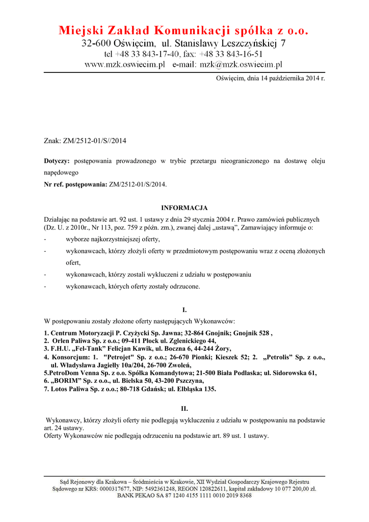 Oświęcim, dnia 14 października 2014 r. Znak: ZM/2512-01/S//2014 Dotyczy: postępowania prowadzonego w trybie przetargu nieograniczonego na dostawę oleju napędowego Nr ref. postępowania: ZM/2512-01/S/2014. INFORMACJA Działając na podstawie art. 92 ust. 1 ustawy z dnia 29 stycznia 2004 r. Prawo zamówień publicznych (Dz. U. z 2010r., Nr 113, poz. 759 z późn. zm.), zwanej dalej „ustawą”, Zamawiający informuje o: - wyborze najkorzystniejszej oferty, - wykonawcach, którzy złożyli oferty w przedmiotowym postępowaniu wraz z oceną złożonych ofert, - wykonawcach, którzy zostali wykluczeni z udziału w postępowaniu - wykonawcach, których oferty zostały odrzucone. I. W postępowaniu zostały złożone oferty następujących Wykonawców: 1. Centrum Motoryzacji P. Czyżycki Sp. Jawna; 32-864 Gnojnik; Gnojnik 528 , 2. Orlen Paliwa Sp. z o.o.; 09-411 Płock ul. Zglenickiego 44, 3. F.H.U. „Fel-Tank” Felicjan Kawik, ul. Boczna 6, 44-244 Żory, 4. Konsorcjum: 1. "Petrojet" Sp. z o.o.; 26-670 Pionki; Kieszek 52; 2. „Petrolis” Sp. z o.o., ul. Władysława Jagiełły 10a/204, 26-700 Zwoleń, 5.PetroDom Venna Sp. z o.o. Spółka Komandytowa; 21-500 Biała Podlaska; ul. Sidorowska 61, 6. „BORIM” Sp. z o.o., ul. Bielska 50, 43-200 Pszczyna, 7. Lotos Paliwa Sp. z o.o.; 80-718 Gdańsk; ul. Elbląska 135. II. Wykonawcy, którzy złożyli oferty nie podlegają wykluczeniu z udziału w postępowaniu na podstawie art. 24 ustawy. Oferty Wykonawców nie podlegają odrzuceniu na podstawie art. 89 ust. 1 ustawy. III. Na podstawie Rozdziału XIV SIWZ, Zamawiający przyznał złożonym ofertom następującą punktację: Oferta Wykonawcy: Kryterium Cena (C) Centrum Motoryzacji P. Czyżycki Sp. Jawna; 32-864 Gnojnik; Gnojnik 528 Orlen Paliwa Sp. z o.o.; 09-411 Płock ul. Zglenickiego 44 F.H.U. „Fel-Tank” Felicjan Kawik, ul. Boczna 6, 44-244 Żory Konsorcjum: 1. "Petrojet" Sp. z o.o.; 26-670 Pionki; Kieszek 52; 2. „Petrolis” Sp. z o.o., ul. Władysława Jagiełły 10a/204, 26-700 Zwoleń .PetroDom Venna Sp. z o.o. Spółka Komandytowa; 21-500 Biała Podlaska; ul. Sidorowska 61 „BORIM” Sp. z o.o., ul. Bielska 50, 43-200 Pszczyna Lotos Paliwa Sp. z o.o.; 80-718 Gdańsk; ul. Elbląska 135. Łączna punktacja 98,43 pkt 98,43 pkt 99,95 pkt 99,95 pkt 99,72 pkt 99,72 pkt 99,58 pkt 99,58 pkt 100,00 pkt 100,00 pkt 99,45 pkt 99,45 pkt 99,11 pkt 99,11 pkt IV. W związku z powyższym, jako najkorzystniejsza została wybrana oferta złożona przez Wykonawcę: PetroDom Venna Sp. z o.o. Spółka Komandytowa; 21-500 Biała Podlaska; ul. Sidorowska 61. 2
