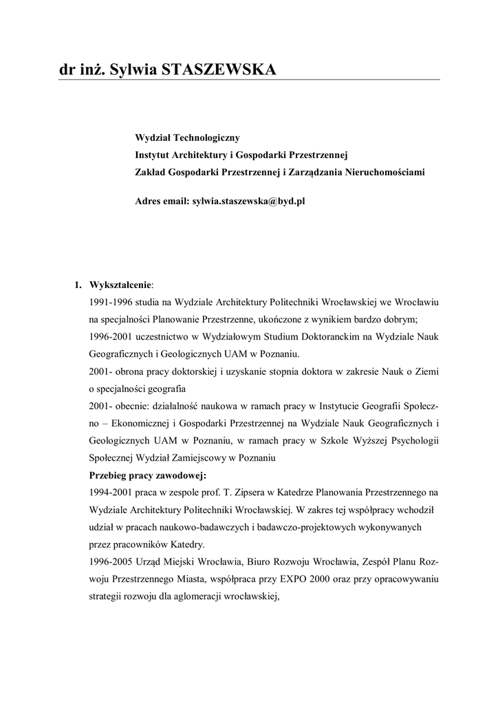 dr inż. Sylwia STASZEWSKA Wydział Technologiczny Instytut Architektury i Gospodarki Przestrzennej Zakład Gospodarki Przestrzennej i Zarządzania Nieruchomościami Adres email: [email protected] 1. Wykształcenie: 1991-1996 studia na Wydziale Architektury Politechniki Wrocławskiej we Wrocławiu na specjalności Planowanie Przestrzenne, ukończone z wynikiem bardzo dobrym; 1996-2001 uczestnictwo w Wydziałowym Studium Doktoranckim na Wydziale Nauk Geograficznych i Geologicznych UAM w Poznaniu. 2001- obrona pracy doktorskiej i uzyskanie stopnia doktora w zakresie Nauk o Ziemi o specjalności geografia 2001- obecnie: działalność naukowa w ramach pracy w Instytucie Geografii Społeczno – Ekonomicznej i Gospodarki Przestrzennej na Wydziale Nauk Geograficznych i Geologicznych UAM w Poznaniu, w ramach pracy w Szkole Wyższej Psychologii Społecznej Wydział Zamiejscowy w Poznaniu Przebieg pracy zawodowej: 1994-2001 praca w zespole prof. T. Zipsera w Katedrze Planowania Przestrzennego na Wydziale Architektury Politechniki Wrocławskiej. W zakres tej współpracy wchodził udział w pracach naukowo-badawczych i badawczo-projektowych wykonywanych przez pracowników Katedry. 1996-2005 Urząd Miejski Wrocławia, Biuro Rozwoju Wrocławia, Zespół Planu Rozwoju Przestrzennego Miasta, współpraca przy EXPO 2000 oraz przy opracowywaniu strategii rozwoju dla aglomeracji wrocławskiej, 2006-2010 praca na stanowisku projektanta w celu zdobycia doświadczeń zawodowych w biurze urbanistyczno-architektonicznym Akant-bis, ul. Południowa 35, 62081 Przeźmierowo, 2011 – starania o uprawnienia urbanistyczne 2. Stopnie i tytuły naukowe: 2001 - uzyskanie tytułu dr Nauk o Ziemi na WNGiG UAM w Poznaniu 3. Zainteresowania naukowe: gospodarka przestrzenna, urbanistyka, socjologia miasta, 4. Pełnione funkcje: 2008 - wpis na listę asesorów przy Urzędzie Marszałkowskim Województwa Wielkopolskiego w Poznaniu na podstawie Uchwały Zarządu Województwa Wielkopolskiego nr 1205/2008 z dnia 27 marca 2008 w dziedzinie Rewitalizacja obszarów miejskich, poprzemysłowych i powojskowych (Urząd Marszałkowski Województwa Wielkopolskiego, Departament Wdrażania Programu Regionalnego). od 2008 – opiekun Akademickiego Naukowego Koła Gospodarki Przestrzennej działającego na Wydziale Nauk Geograficznych i Geologicznych Uniwersytetu A. Mickiewicza w Poznaniu 5. Kształcenie kadry naukowej: liczba wypromowanych magistrów na WNGiG UAM od 2009 roku - 26 6. Tematyka naukowo-badawcza: przekształcenie urbanistyczne strefy podmiejskiej dużego miasta 7. Dorobek naukowy (wykaz publikacji): 1996 Staszewska S. (Pawłowska S.), 1996, Techniki i zakres badań nad znaczeniem „Węzła Bielańskiego” w aktywności społeczno-gospodarczej na styku miasta Wrocławia i gminy Kobierzyce, [w]: E. Bagiński (red), Zarys metod i technik badawczych w planowaniu przestrzennym, Wrocław, s.110-118. 1998 Staszewska S., 1998, Zastosowanie technik komputerowych do badania struktury przestrzenno-funkcjonalnej miasta, [w]: X Konwersatorium Wiedzy o Mieście. Metodologia geografii osadnictwa na przełomie wieków. Łódź, s.129-130. Staszewska S., Piechowicz K., 1998, Duże miasta Polski w okresie transformacji społecznogospodarczej, [w]: J.J Parysek, H. Rogacki, (red), Przemiany społeczno gospodarcze Polski lat dziewięćdziesiątych, Poznań, s.110-122. 2001 Staszewska S., 2001, Ludność i sieć osadnicza- Mieszkalnictwo, [w]: H. Rogacki (red), Przestrzeń społeczno-gospodarcza gminy Śrem, Poznań, s. 52-62. 2004 Staszewska S., 2004, Proces urbanizacji Półwyspu Helskiego, Bogucki Wydawnictwo Naukowe, Poznań, stron 173 - monografia Staszewska S., 2004, Powojenny rozwój i przekształcenia przestrzenne miast wyjątkowych (miasta Półwyspu Helskiego), [w]: J. Słodczyk (red.), Przemiany przestrzennej struktury miast w sferze funkcjonalnej i społecznej, Opole, s.311-345. Staszewska S., 2004, Przemiany społeczno-gospodarcze i przestrzenne dużych miast Polski w okresie transformacji – wybrane zagadnienia, [w]: J. J. Parysek (red.), Rozwój regionalny i lokalny w Polsce w latach 1989-2002, Poznań, s.133-149. Staszewska S., Kacprzak E., Szczęsna M., 2004, Możliwości rozwoju wsi polskiej, [w]: Architektura Krajobrazu – odnowa wsi (studia i prezentacje), Nr 3-4/2004, ISSN 1641-5159, Wrocław, s. 76-83. 2005 Staszewska S., 2005, Zasoby lokalne jako czynnik rozwoju społeczno-gospodarczego i przestrzennego małych miast (przykład polskich zachodnich miast przygranicznych), [w]: Heffner K., Marszał T. (red.), Problemy rozwoju małych miast w wymiarze lokalnym i regionalnym, PAN KPZK, zesz.220, Warszawa, s. 65-78. Staszewska S., Wdowicka M., 2005, Suburbanisation in Poland in the Period of SocioEconomic Transformation, In Murayama Y., Du G., (Eds) Cities in Global Perspective: Diversity and Transition, IGU Urban Commission, Tokyo, 62-71. Staszewska S., Parysek J.J., 2005, Kościoły Poznania: sacrum i profanum, [w]: Domański B., Skiba St., (red) Geografia i sacrum, Kraków, t. 2, s.343-358. Staszewska S., Wdowicka M., 2005, Możliwości aktywizacji gospodarczej małych miast w Polsce w warunkach rosnącej konkurencji międzynarodowej, [w]: Heffner K., (red.), Małe miasta a rozwój lokalny i regionalny, Wyd. Akademii Ekonomicznej, Katowice, 91-105. Staszewska S., 2005, Architektoniczne przekształcenia zabudowy polskiej wsi, [w:] Głębocki B., Kaczmarek U., (red.) Obszary sukcesu na polskiej wsi, Studia Obszarów Wiejskich, t.8, PTG i PAN, Warszawa, s.183-199. Staszewska S., 2005, Rozwój osadnictwa na Półwyspie Helskim, [w:] Rocznik Helski nr 3, Wyd. Towarzystwo Przyjaciele Helu, Hel. – periodyk popularno-naukowy (recenzowany) 2006 Staszewska S., 2006, Miasto czy wieś – uwarunkowania rozwoju i zagospodarowanie podmiejskich jednostek osadniczych, [w:] Heffner K., Marszał T., Małe miasta – studium przypadków, PTG, Łódź, s.61-73. Staszewska S., Wdowicka M., 2006, Rozwój budownictwa jednorodzinnego w strefie