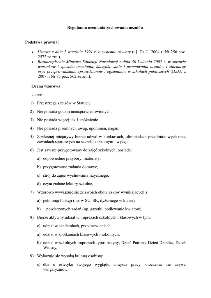 Regulamin oceniania zachowania uczniów Podstawa prawna